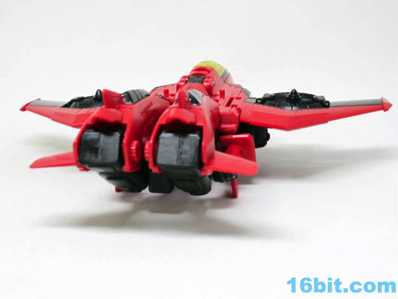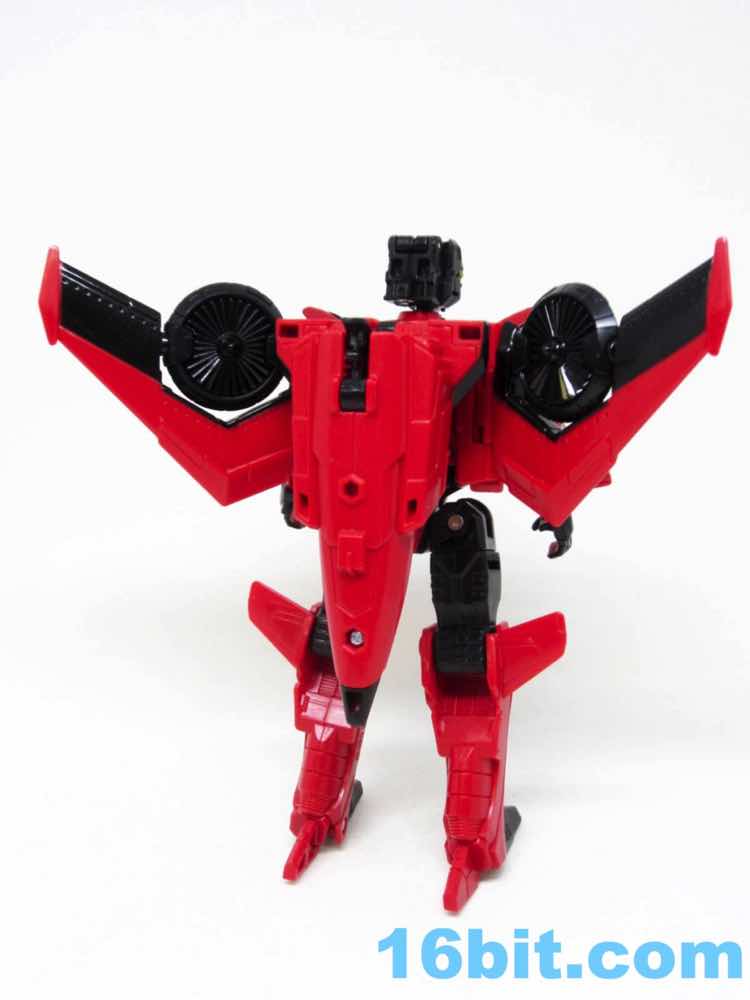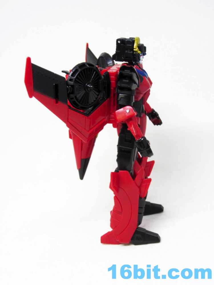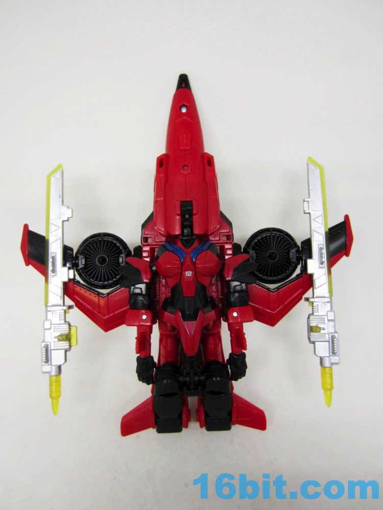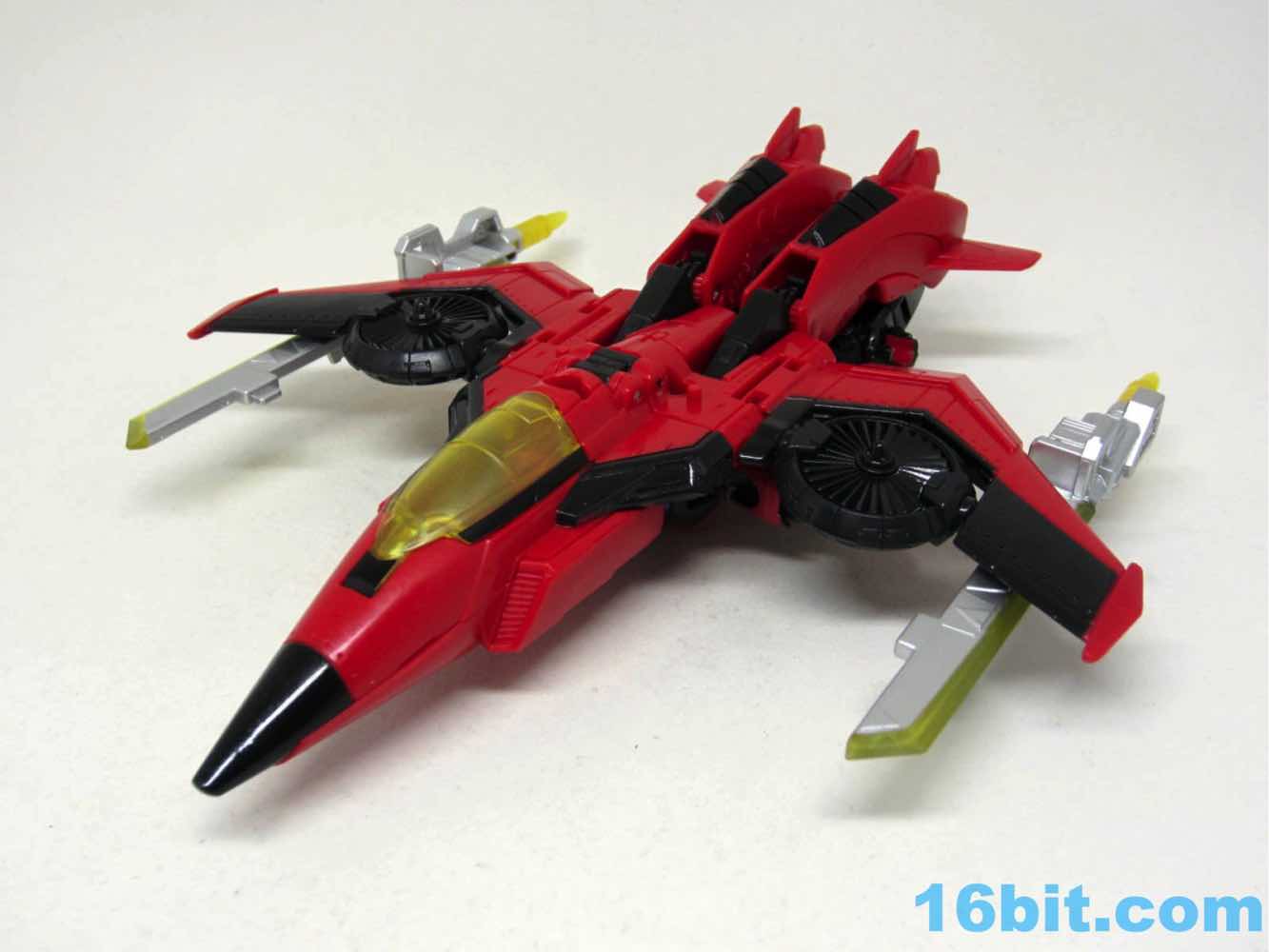 I like the robot mode, but that isn't to say it's perfect. The head seems small on the larger body frame with fairly sturdy thighs recycles from Scourge/Highbrow. It doesn't break the toy, but the shoulder joints move in a way that you'll need to position carefully to make sure she doesn't look like she's having joint problems. Thankfully they have a good range of motion, and a surprising amount of detail. They painted the black parts red, with painted black hands and lots of sculpted bits to bring you a fairly decent Windblade figure. The original may look better overall, but this one has the deco of the comics and winder, brighter eyes. It's just that smaller face that may cause concerns - the figure itself is sturdy and can easily hold her two, giant, combining swords. I don't understand the significance of these weapons if they're meant for reuse, but the color looks nice against Windblade's black and red physique.