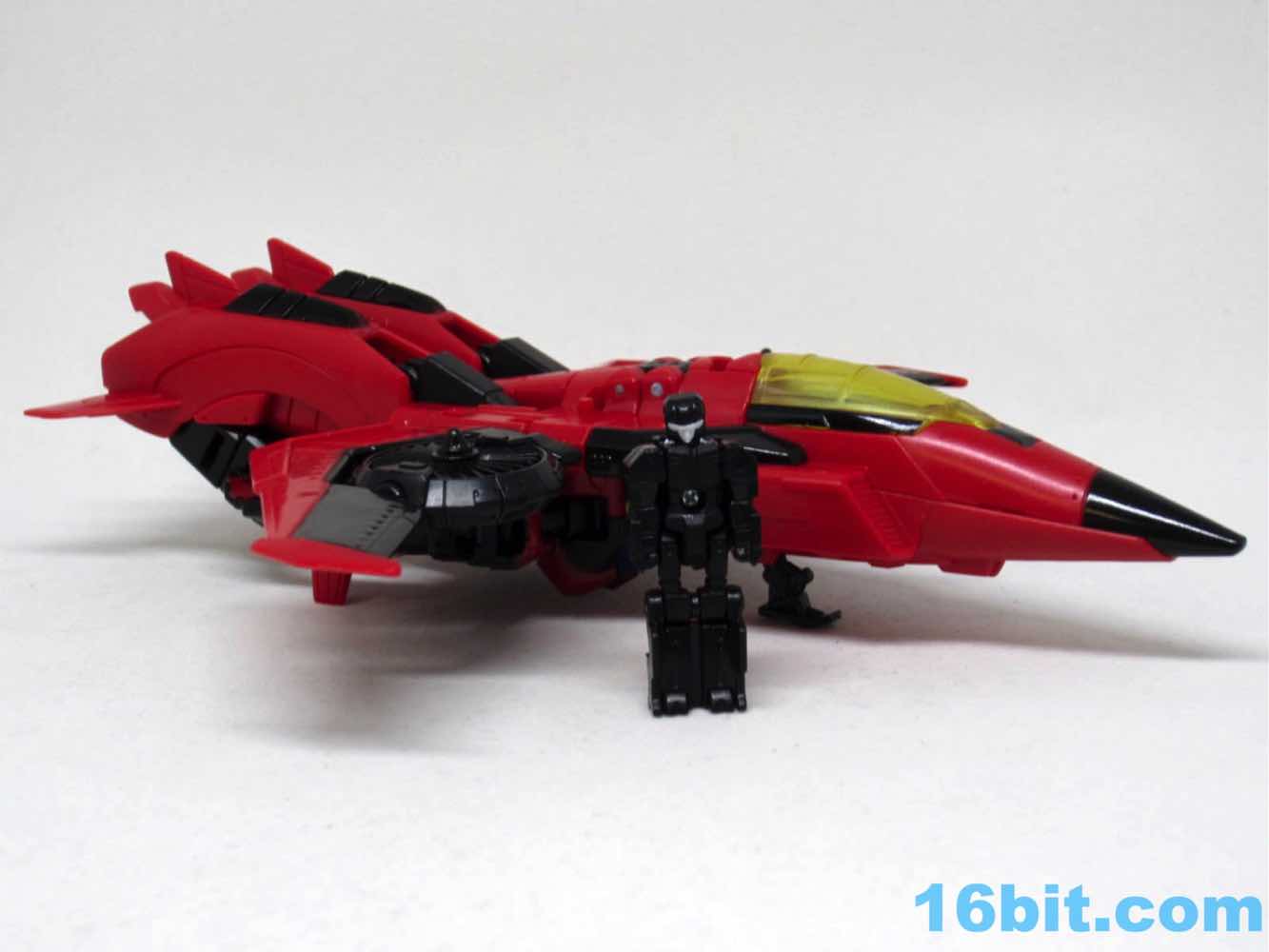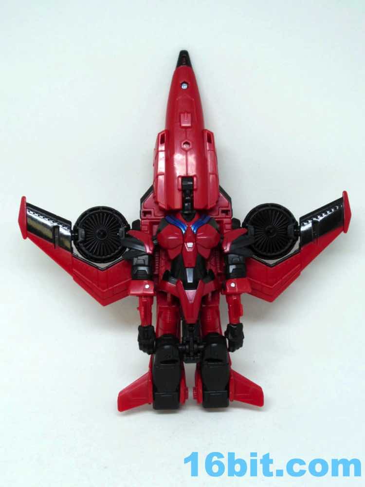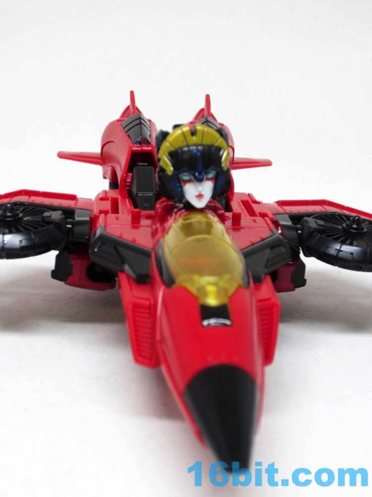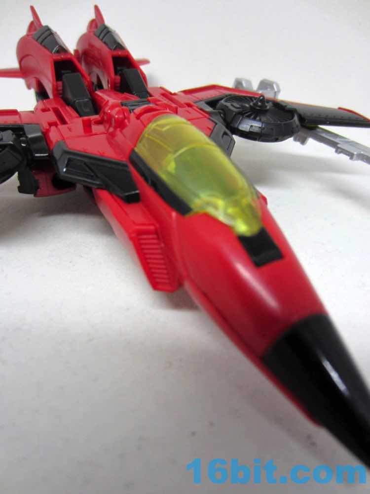 Transformation is simplified a great deal - this toy won't give you a fight. Hasbro has clearly worked with Takara to engineer something simpler and more clever. The nosecone has a peg which connects to Windblade's neck socket. Her feet plug in her back in jet mode, and the hands feature peg elbows to connect to the wings.