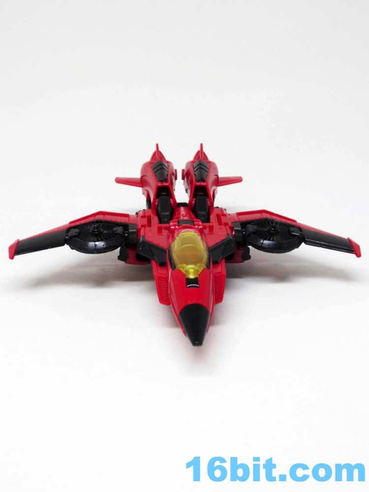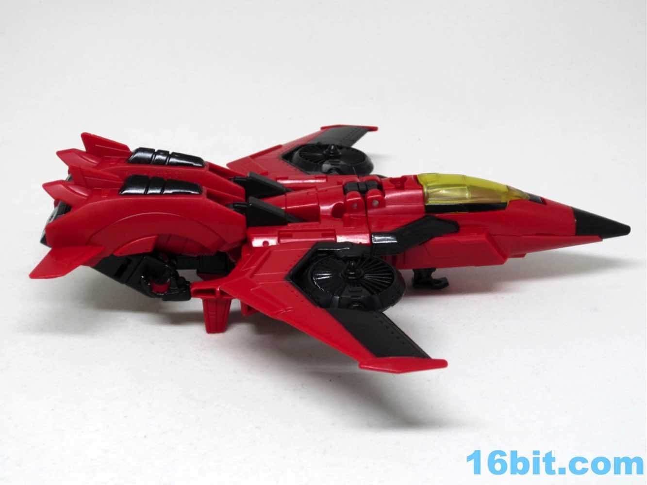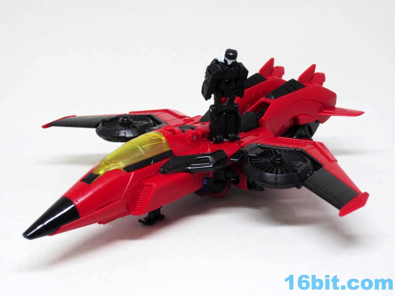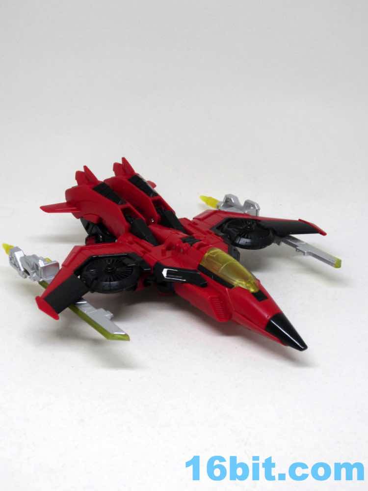 Transformation is simplified a great deal - this toy won't give you a fight. Hasbro has clearly worked with Takara to engineer something simpler and more clever. The nosecone has a peg which connects to Windblade's neck socket. Her feet plug in her back in jet mode, and the hands feature peg elbows to connect to the wings.