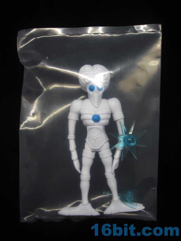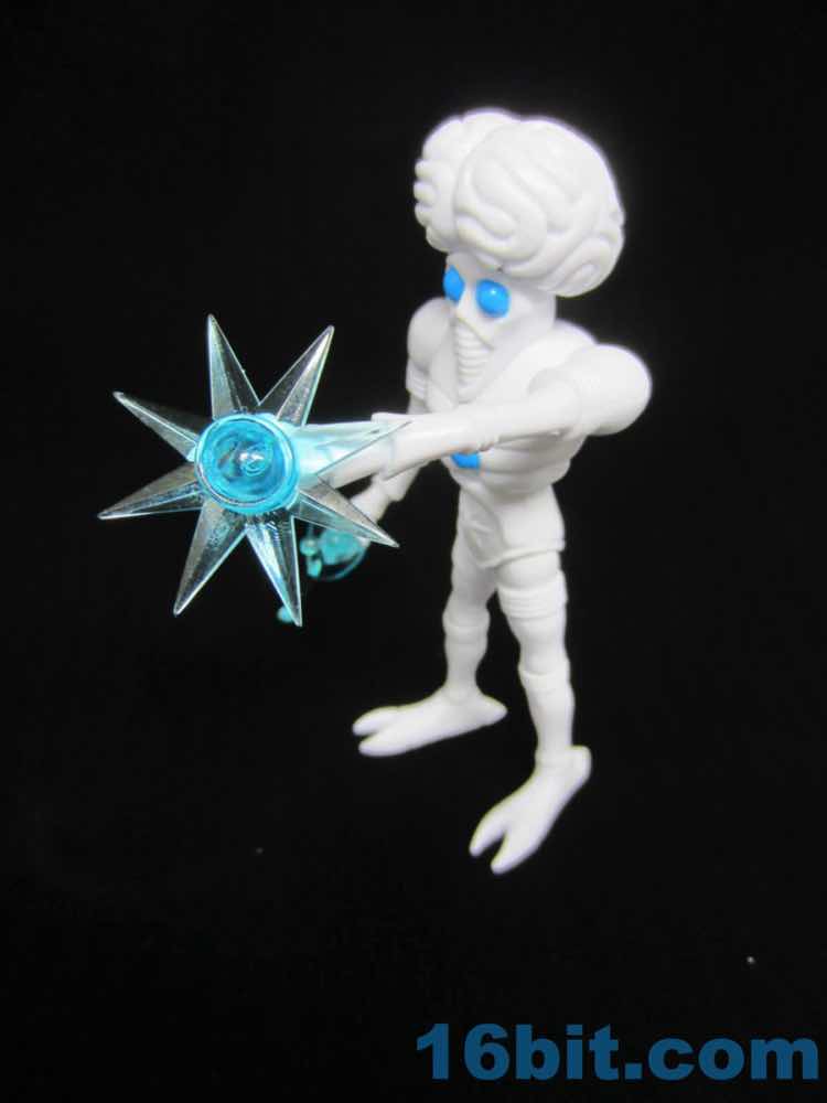 The white figure has three painted dots - two eyes and a chest ornament. His weapons are clear blue ABS, thin and pointy. The star is actually sharper than you're used to seeing on most toys, showcasing one of the rare advantages you get from low-run toys for adult collectors. There's zero marketing to children, so something that would probably be fragile or dangerous for kids doesn't get rounded-off edges or rubbery plastic. With that in mind, keep this away from your kids.