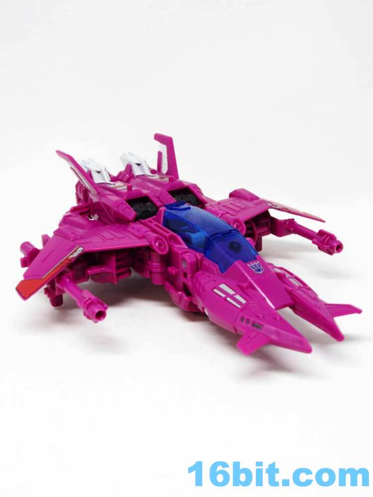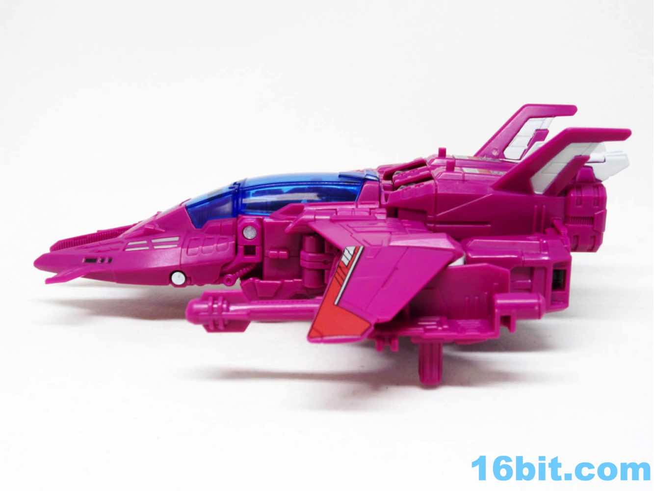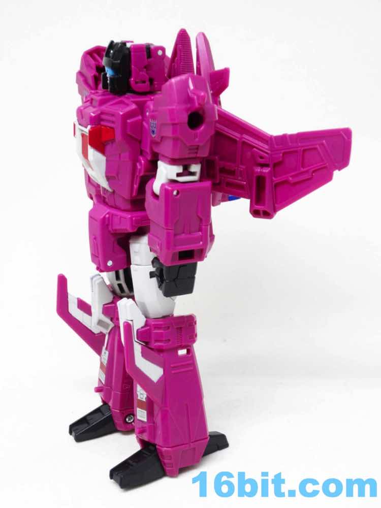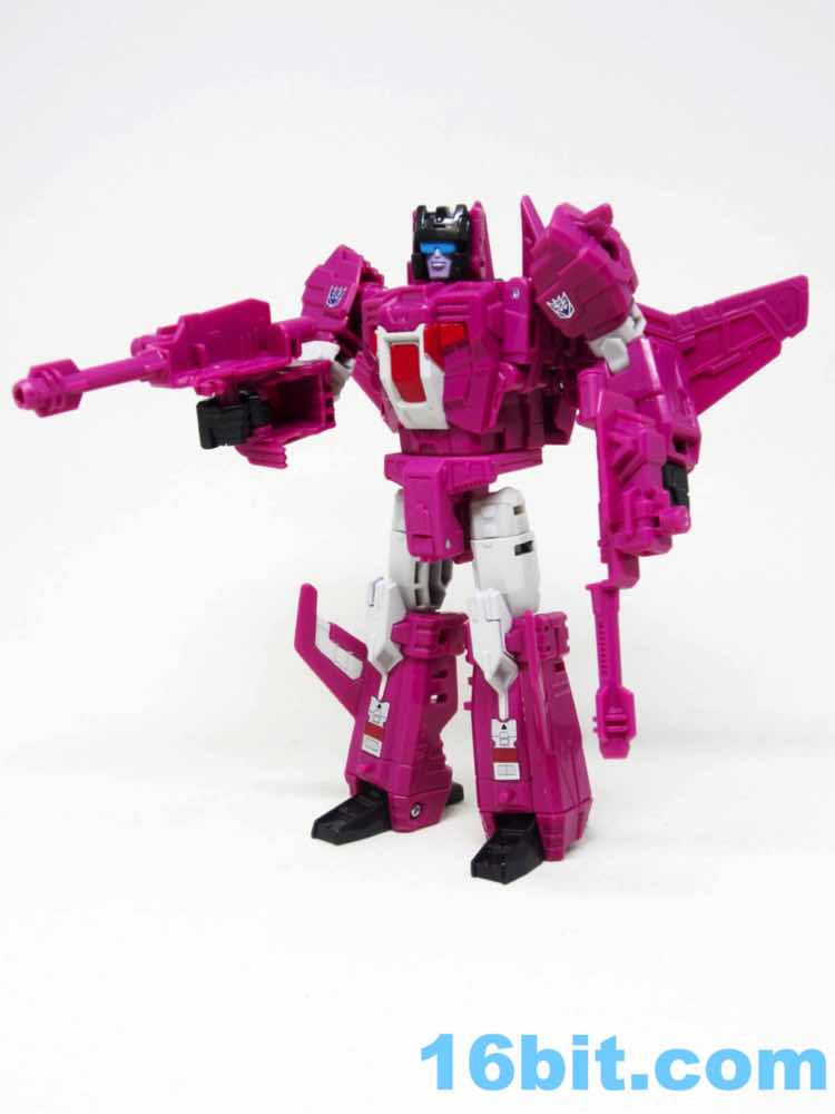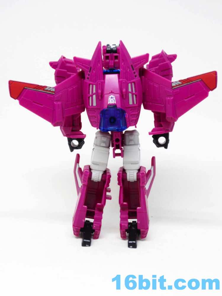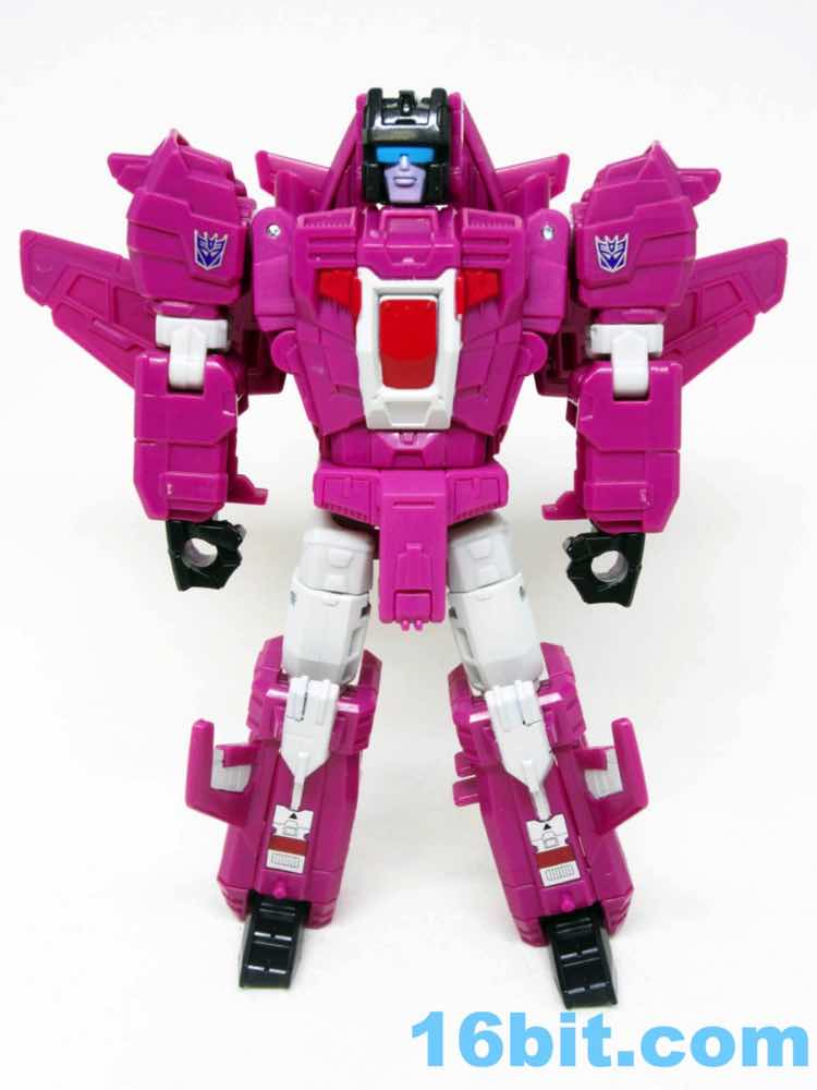 The jet mode is a delight, with the fanciful Cybertronian starfighter looking less like any specific vehicle beyond the original 1987 toy. I'd say I even like it more than the original, as it's a bit more streamlined and less chunky. The robot has mode has about 17 meaningful points of articulation, including what you've come to expect on an average toy. They're not Masterpiece Editions, but you get enough fun for the money that you will no doubt continue buying them as long as new ones enter your field of vision. The deco on the wings is exquisite, and the chest paint is actually pretty sharp too. Take a look at the tampographs on the shins - gorgeous! I don't love stickers, and if Hasbro switched entirely to this kind of printing I'd even suffer a small price increase. It's just better.