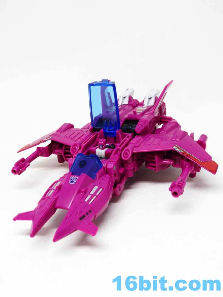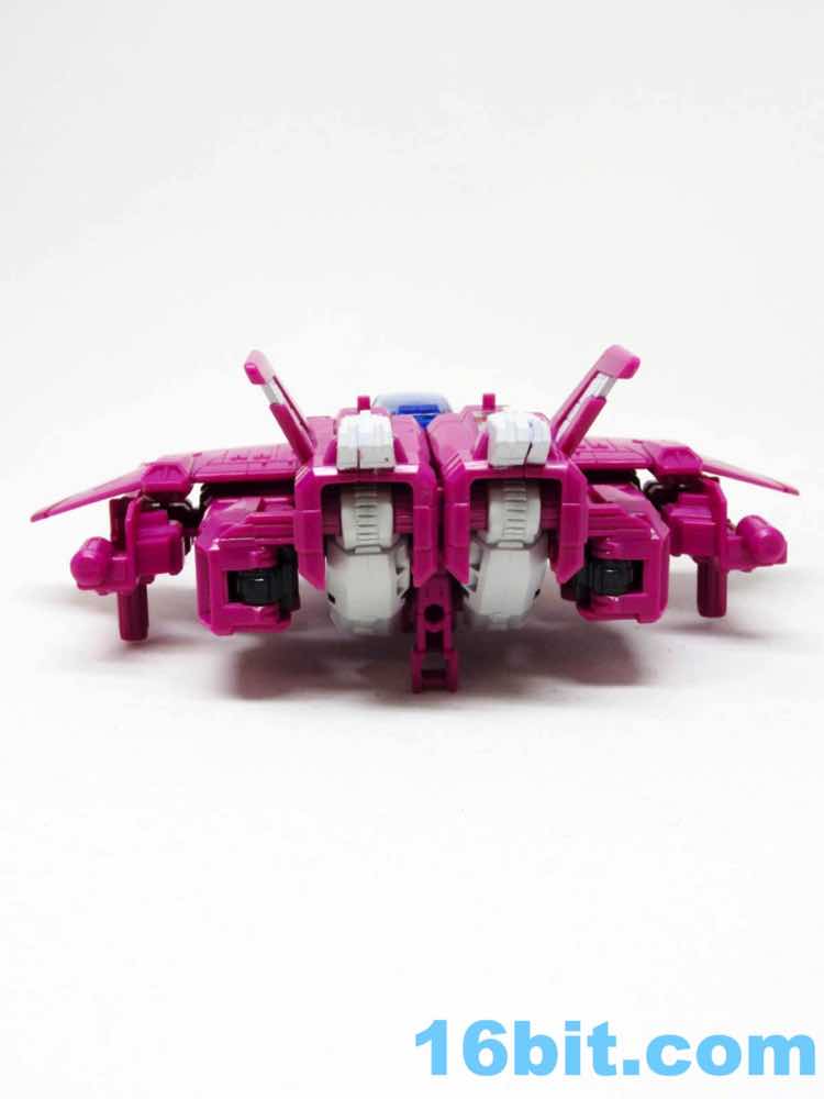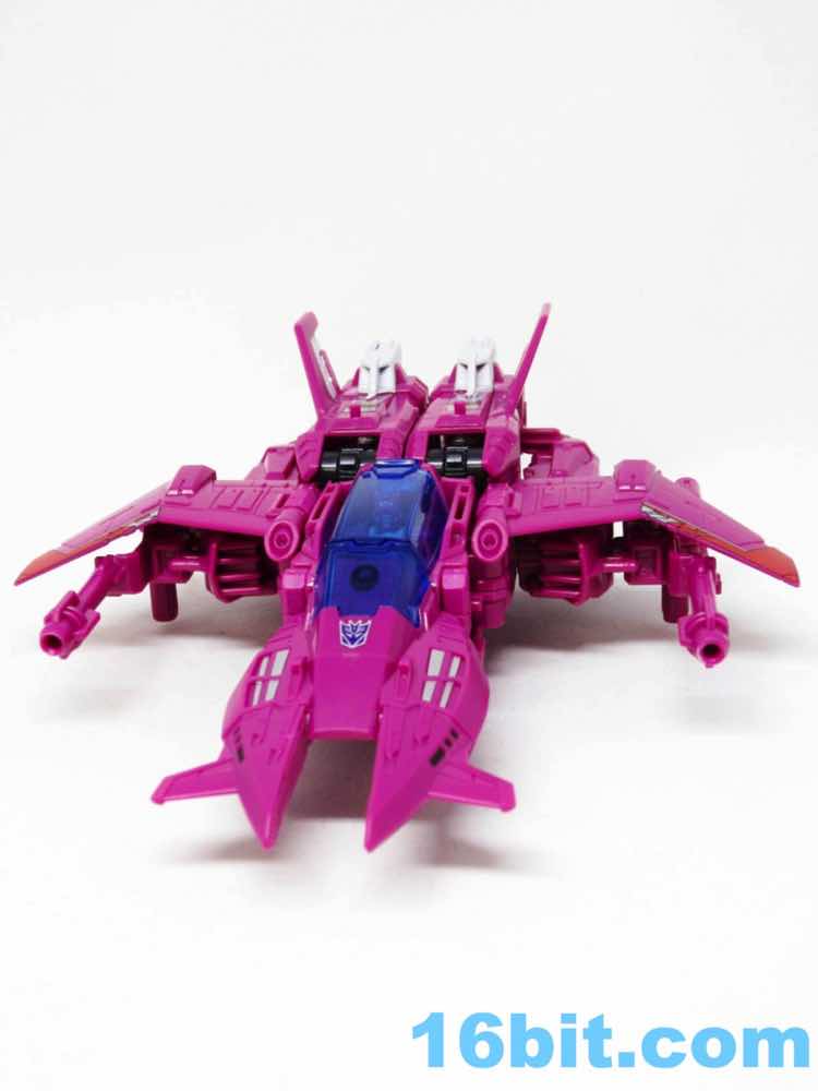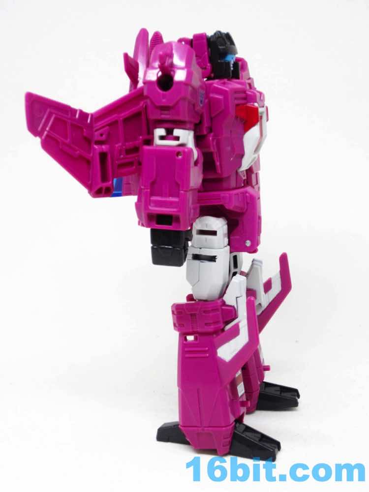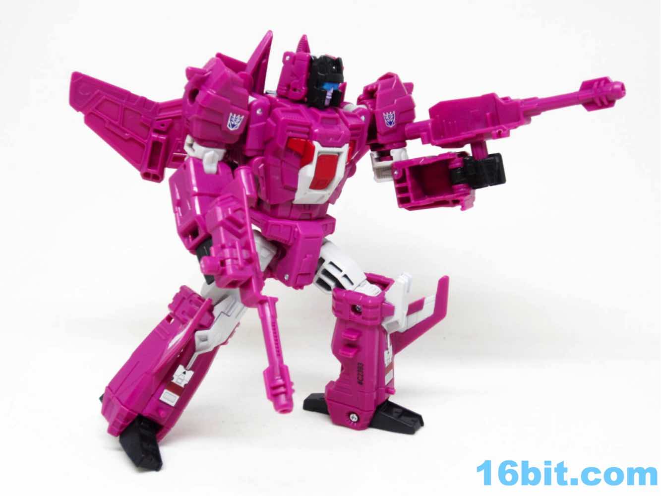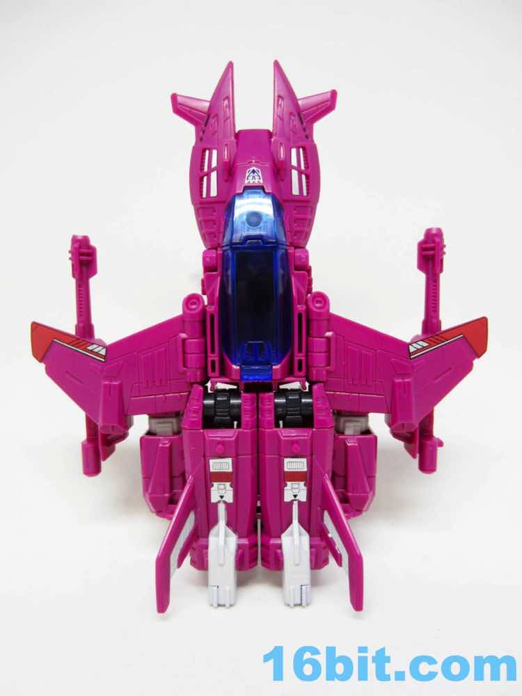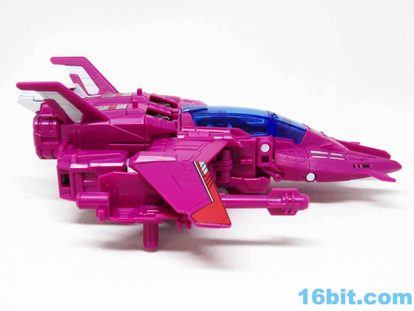 The jet mode is a delight, with the fanciful Cybertronian starfighter looking less like any specific vehicle beyond the original 1987 toy. I'd say I even like it more than the original, as it's a bit more streamlined and less chunky. The robot has mode has about 17 meaningful points of articulation, including what you've come to expect on an average toy. They're not Masterpiece Editions, but you get enough fun for the money that you will no doubt continue buying them as long as new ones enter your field of vision. The deco on the wings is exquisite, and the chest paint is actually pretty sharp too. Take a look at the tampographs on the shins - gorgeous! I don't love stickers, and if Hasbro switched entirely to this kind of printing I'd even suffer a small price increase. It's just better.
