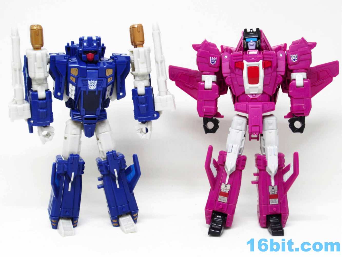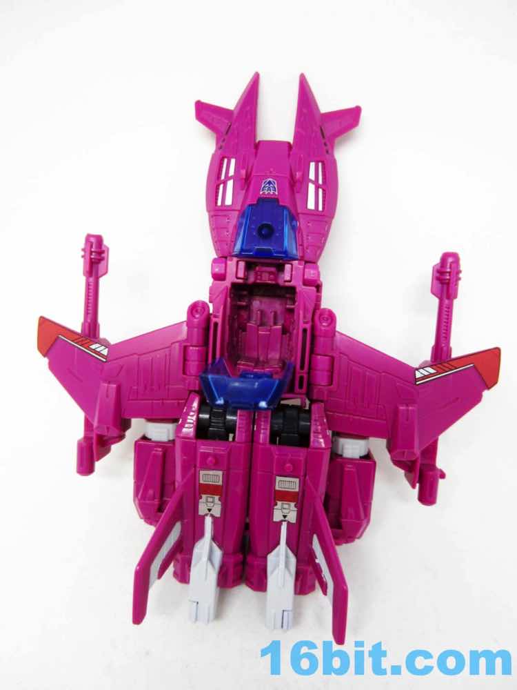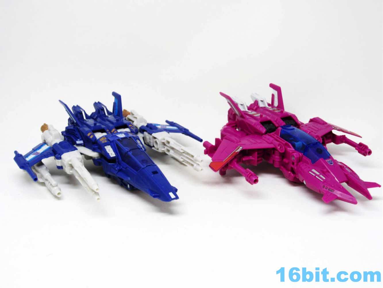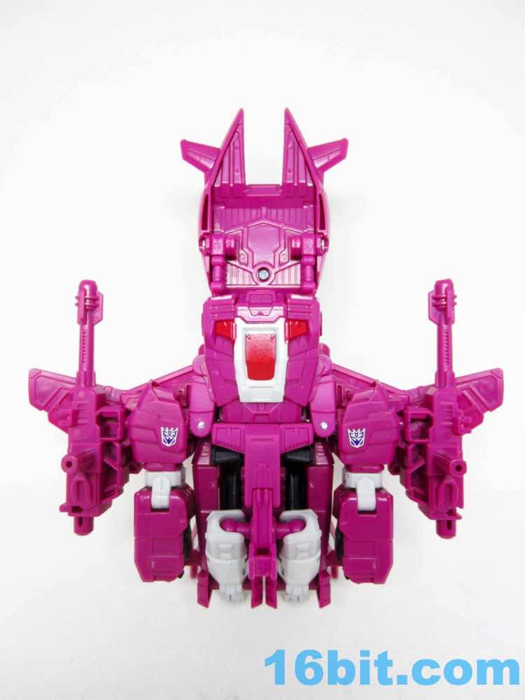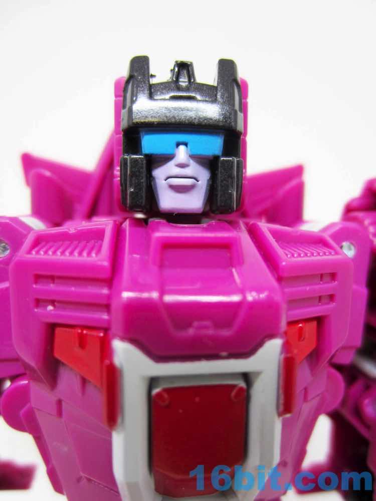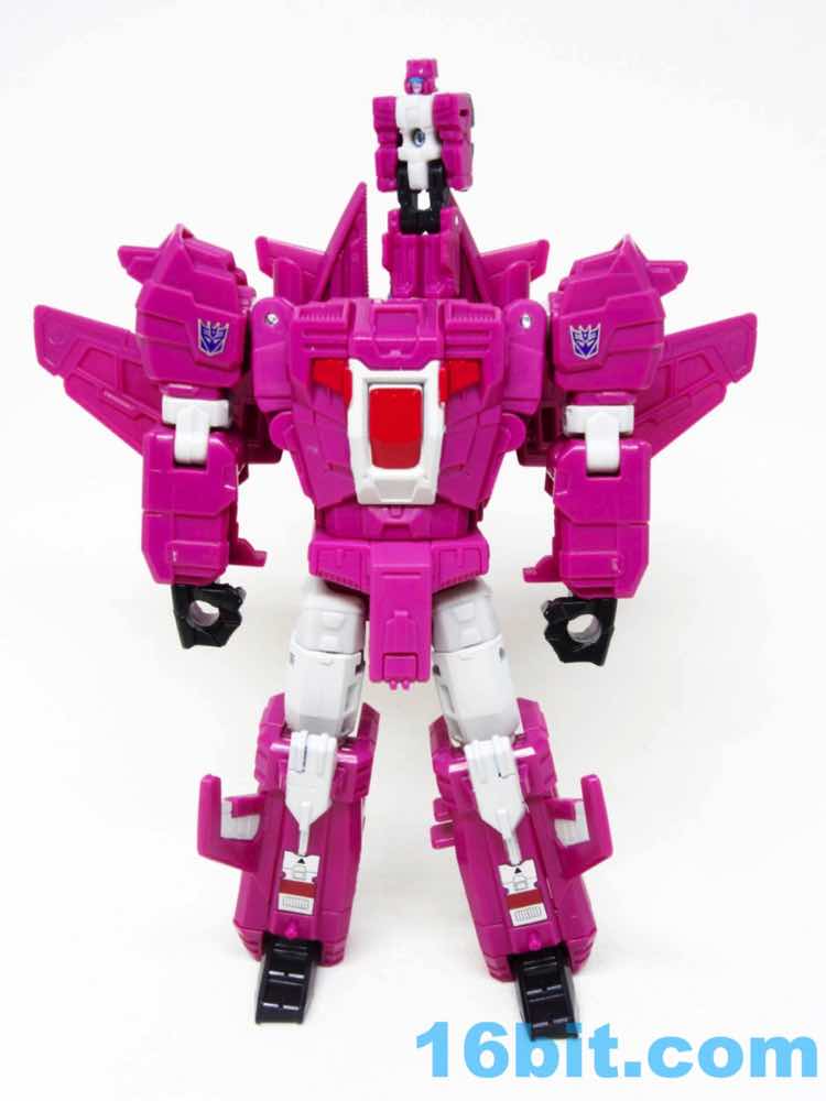 The jet mode is a delight, with the fanciful Cybertronian starfighter looking less like any specific vehicle beyond the original 1987 toy. I'd say I even like it more than the original, as it's a bit more streamlined and less chunky. The robot has mode has about 17 meaningful points of articulation, including what you've come to expect on an average toy. They're not Masterpiece Editions, but you get enough fun for the money that you will no doubt continue buying them as long as new ones enter your field of vision. The deco on the wings is exquisite, and the chest paint is actually pretty sharp too. Take a look at the tampographs on the shins - gorgeous! I don't love stickers, and if Hasbro switched entirely to this kind of printing I'd even suffer a small price increase. It's just better.