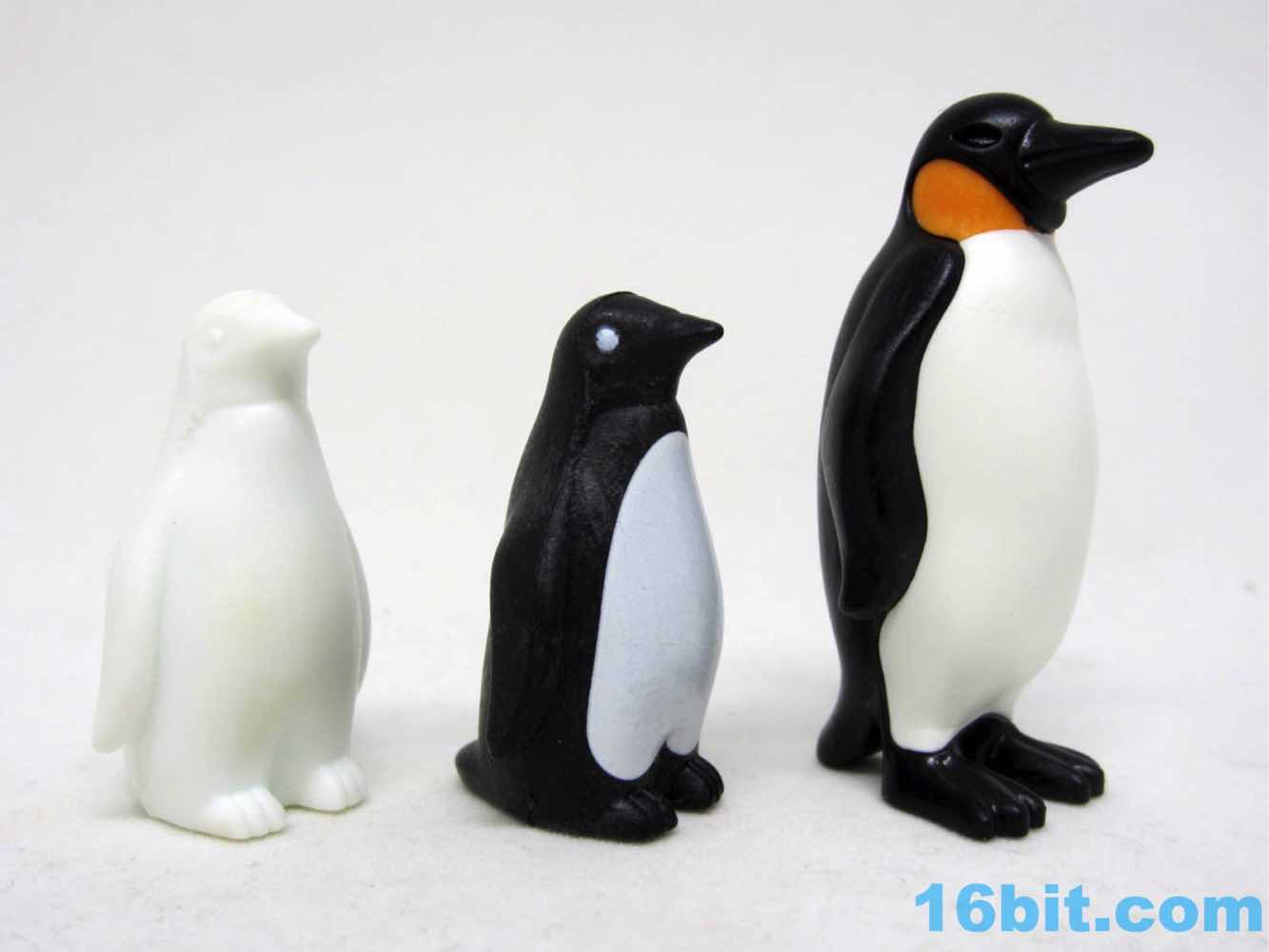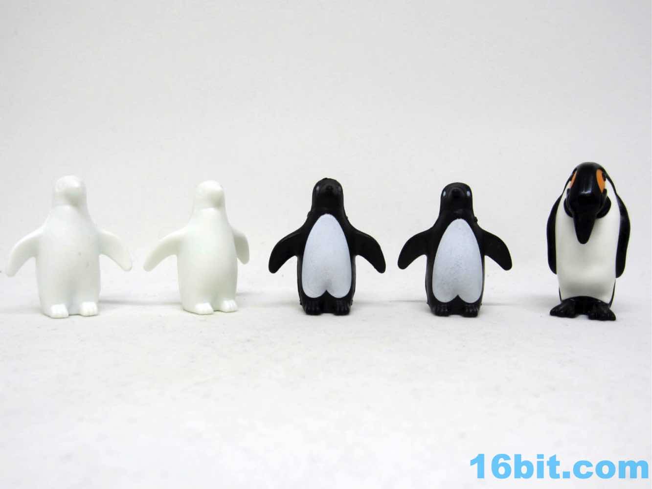 Like any child, I loved penguins as a kid. I had the blank white Playmobil penguins which came with black markers so you could "paint" them yourselves, which was a process I did not like, and they were actually kind of expensive. I found the box for it, and it was around $6 at Little House Toys back in the 1980s for about a dozen of the blank white birds. With no articulation. And no deco. The plastic quality was good, and the molds were later rereleased, cast in black, and given white highlights. These were nicer - multiple colors of plastic were squeezed together to bring more colorful, more charming little creatures. While the original penguin molds had 3 different adults and 1 baby, this new one has 2 adults, 2 babies, and doubles up on each hatchling.