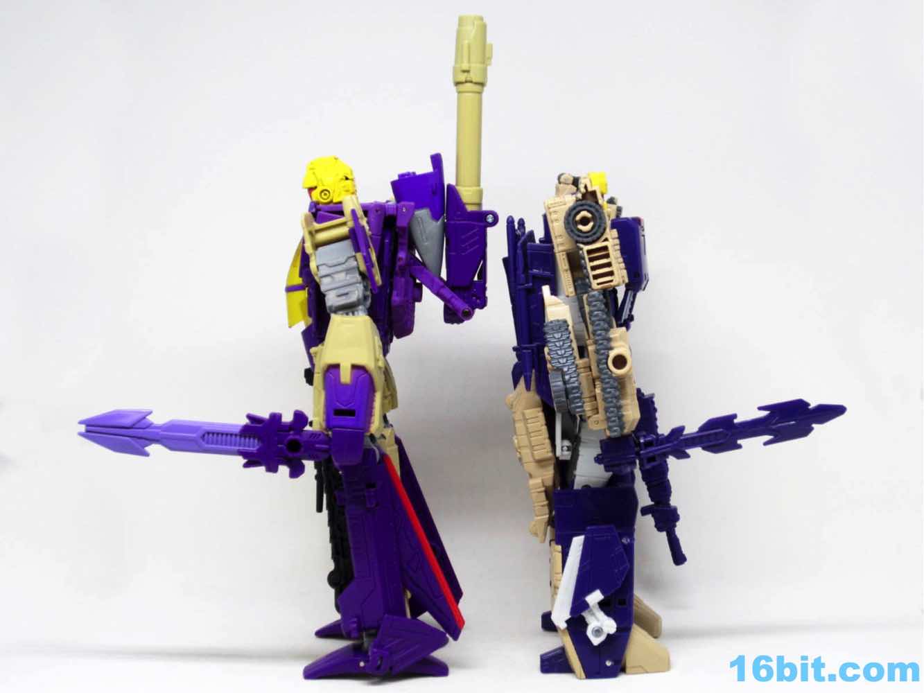 Blitzwing is a nice update, but not without its flaws. The pre-applied silver stickers on all three modes are annoying because they're easy to fray with careful play, and I can only imagine how they'll look in the hands of the target younger audience. With the yellow helmet and a lot of red highlights, this is a colorful character with decent articulation and good interaction with his accessories. There are no problems plopping a sword or gun in his hands, and the shoulders have a surprisingly good range of motion thanks to its complex triple-changer transformation. Along with the bigger Astrotrain and Octone, it's nice to have these guys upgraded to slightly better toys. There are plenty of details that nod to the original and are a departure from the previous use of the toy as Megatron, including a different chest and gun for the tank.