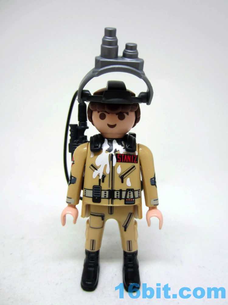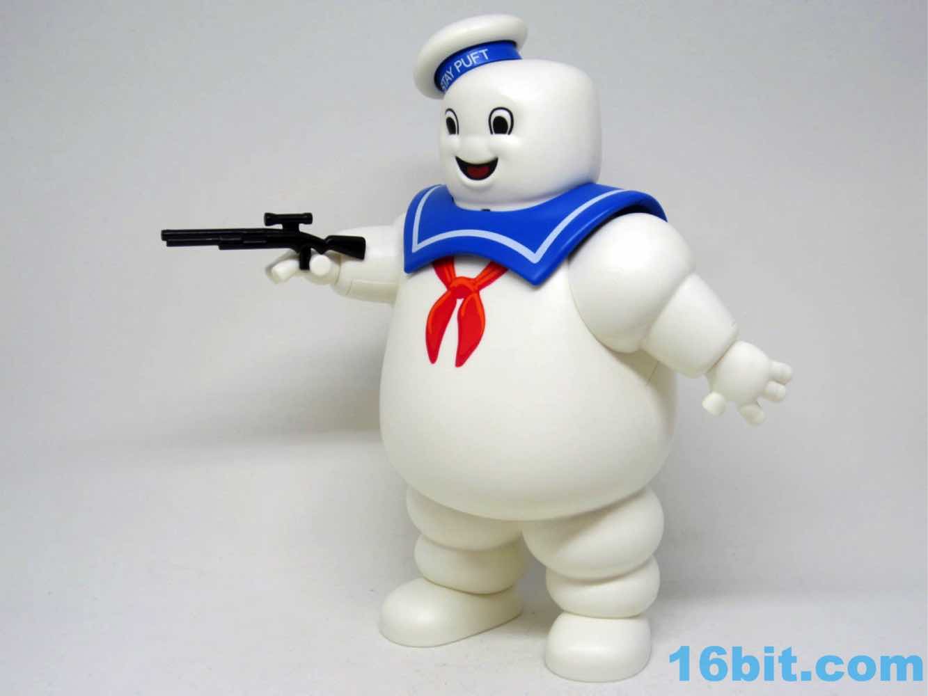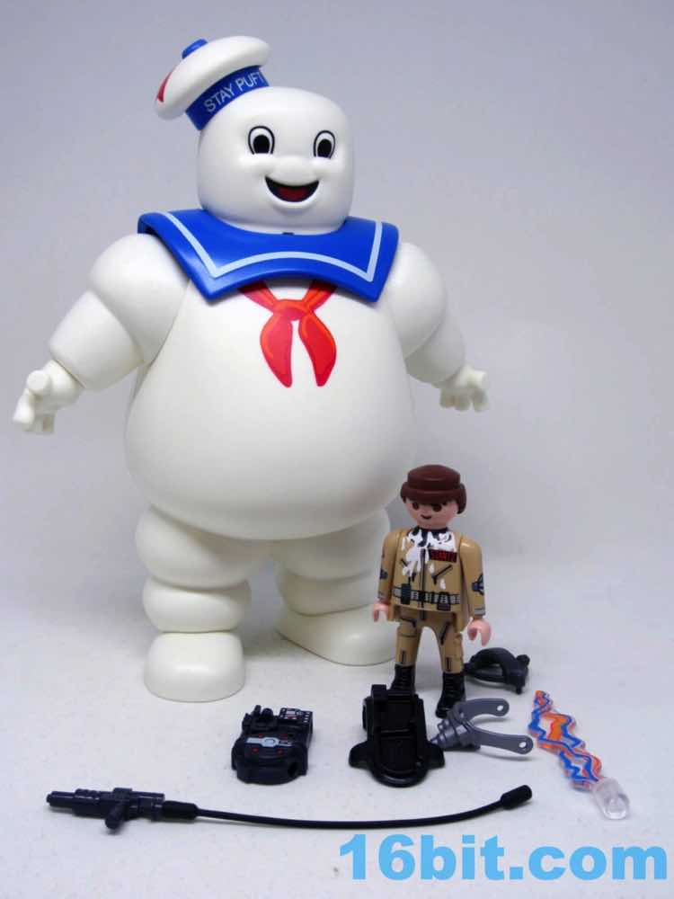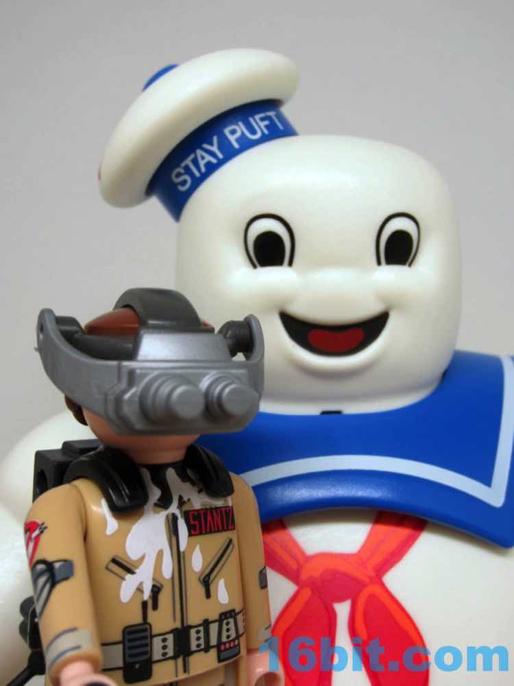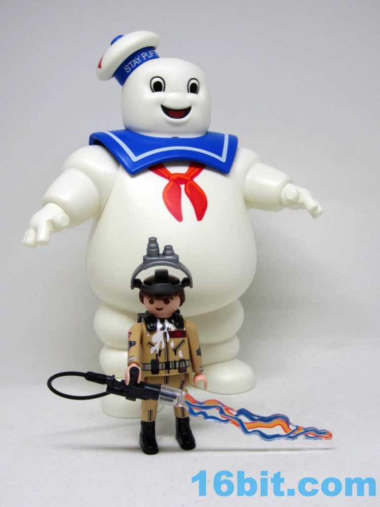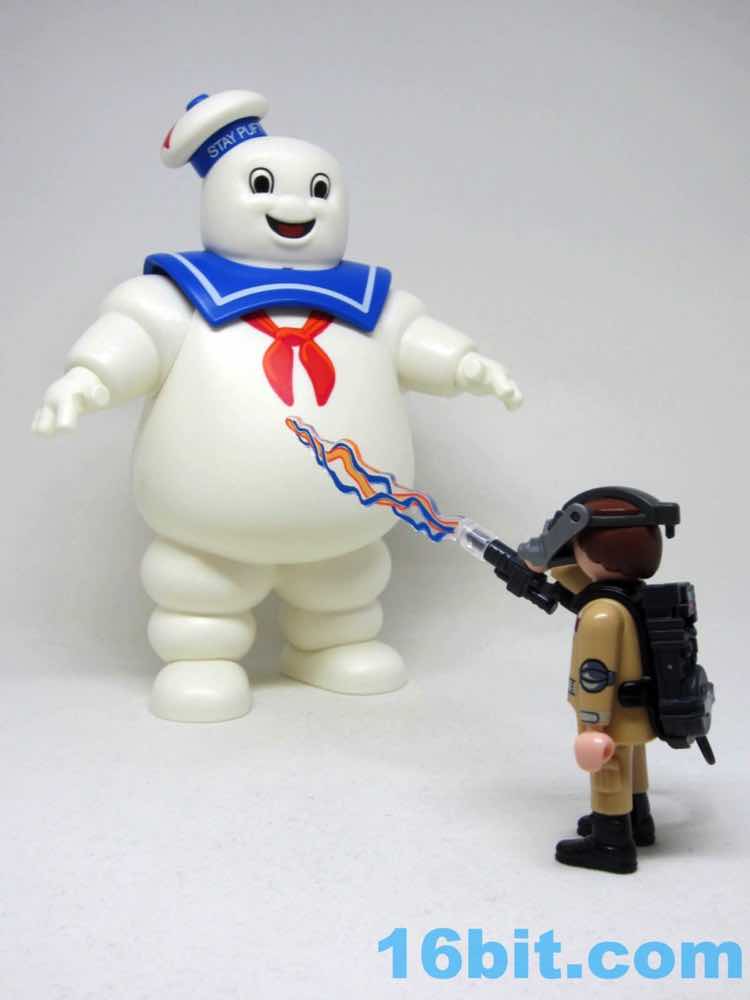 The Ray figure is good. He has his name "STANTZ" printed n the torso along with some suggestive splotches from his favorite benign advertising mascot, elbow pads, a belt, zippers, plus sculpted and painted pockets. There's a lot going on here and it looks fantastic - you can even see the "no ghost" symbol on the right arm. If you want to put the goggles on the non-fluffed figure, you can! The hair pops off and is easily swapped between figures. You get Playmobil standard articulation and a Proton Pack with Neutrino Wand that requires a tiny bit of assembly. The proton stream plugs nicely in the weapon and glows under black light. The backpack just enough printed and sculpted detail to be convincing, lacking some of the spare parts from Radio Shack you see in the movie - but at this scale, that seems gratuitous. You can plug the wand into the backpack, but if you do the energy stream has nowhere to go for storage. It would have been super cool if the Marshmallow Man, being largely hollow, could double as a storage container. It was not meant to be.