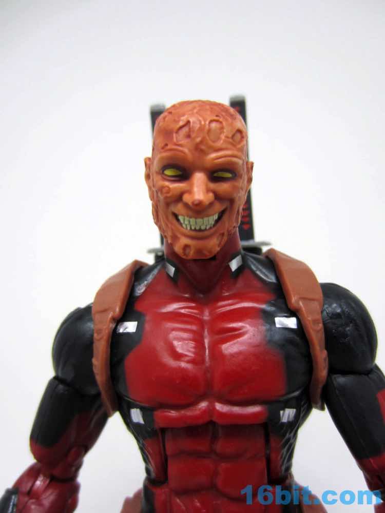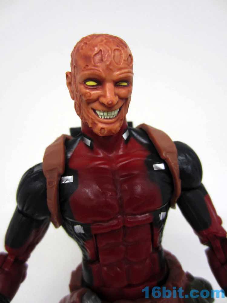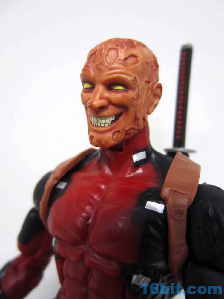 For a completely covered figure, personality can be difficult to express - but not impossible. One eye squinting, an extended pinky, and tons of armored bits tell you a bit about Wade Wilson the man rather than Deadpool the killer mutant. If you needed more, the grotesque scabbed-over head has Little Orphan Annie eyes surprisingly good teeth, and a face that's certainly Ryan Reynolds-esque. Exaggerated, of course. I assume making a joke about specific strains of sores would be off-color, but it's pretty grotesque. Hasbro nailed it here with a quality figure.