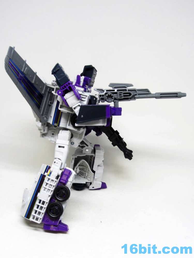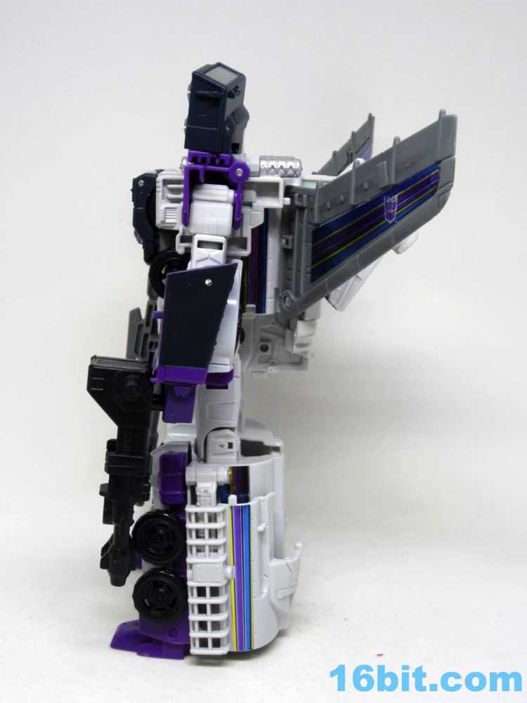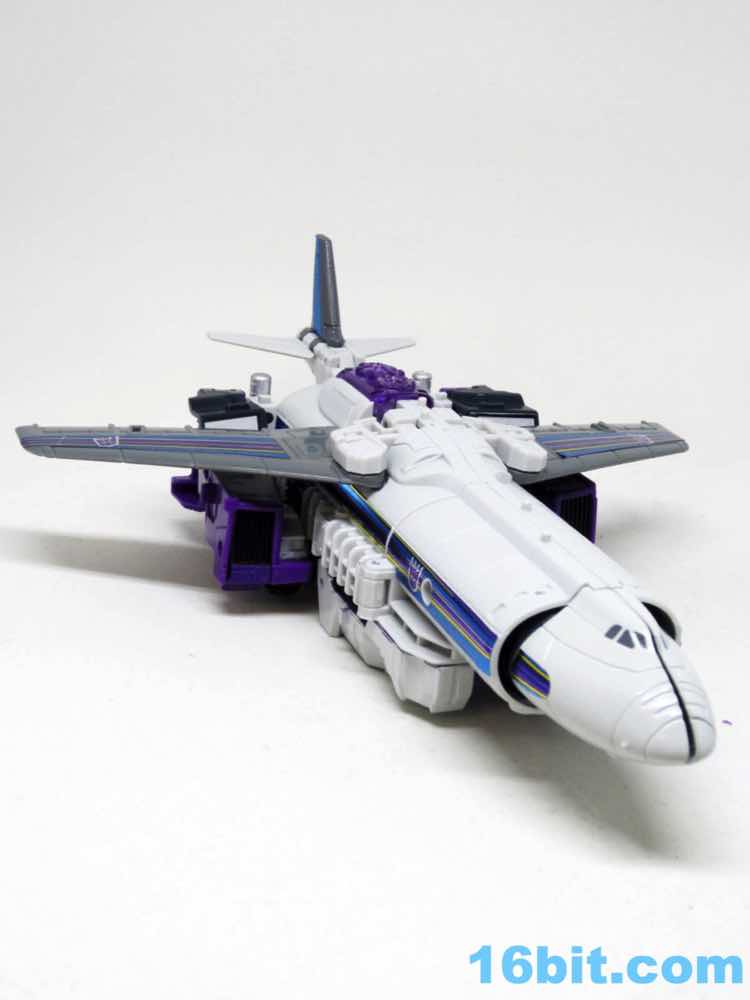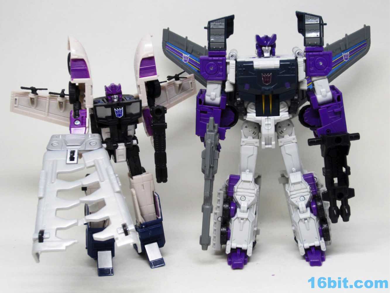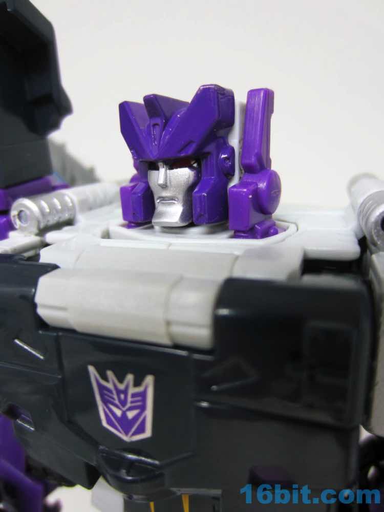 Decepticon Octone is a pretty good update - you get some features you wanted, and some you didn't want. Vestigial Optimus elements include spring-loaded pop-up ear antenna, plus the shoulder stacks which weren't part of the original toy. Otherwise, the robot is pretty good and has been decked out in somewhat fragile foil stickers that do not hold up to simple handling, let alone rough play. I hope Hasbro abandons stickers entirely. I like that the face and overall build captures the feel of the original toy with things like hip joints and better arm movement, plus it stands over 7-inches tall. There is no tail fin weapon, but you do get a decent rifle and G2 Laser Prime's double-barrel cannon thing. The generous application of color through stickers is most appreciated, and this is probably the best of the three modes.