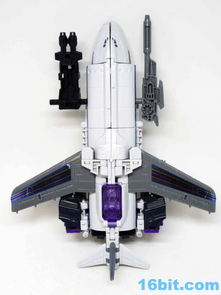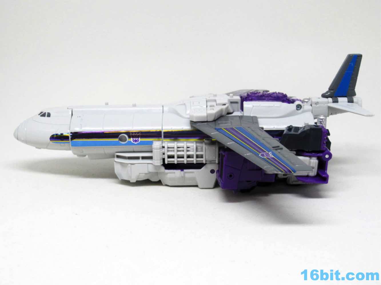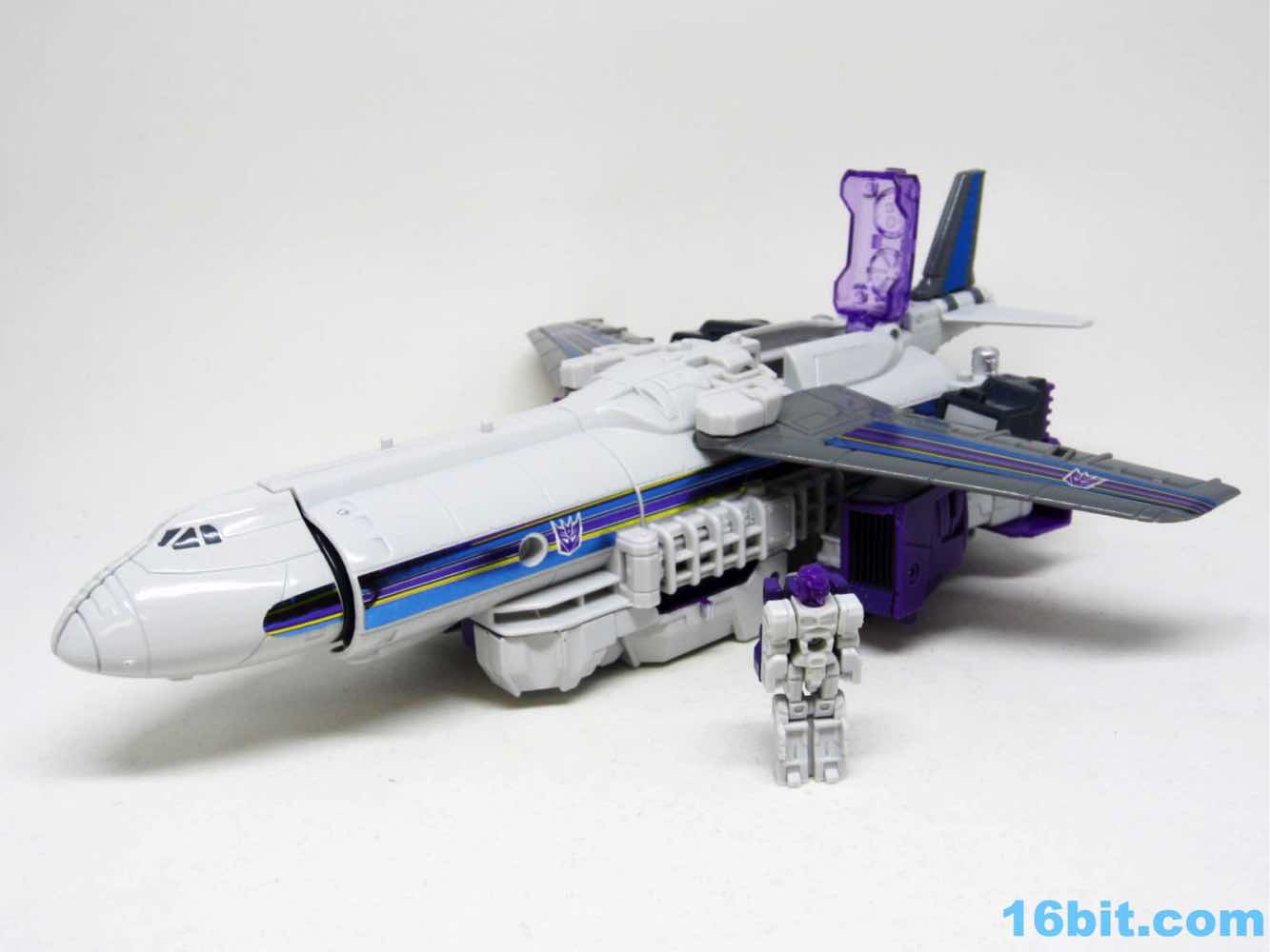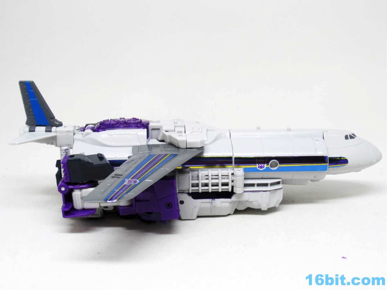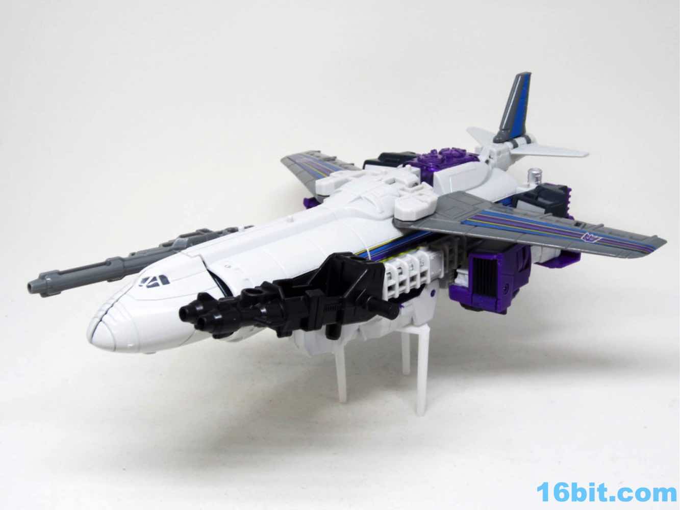 The jumbo jet doesn't do much other than be a cool jet. There are holes for your 5mm weapons, plus a purple seating area for your Murk driver. There are no landing skids, nor are there any action feature in this mode - the only spring-loaded thing are pop-up earmuffs. Why they costed those in instead of better paint, I have no idea.