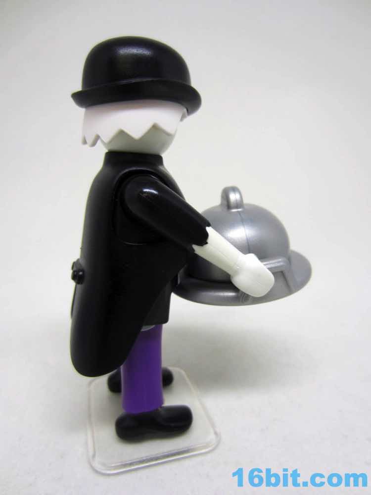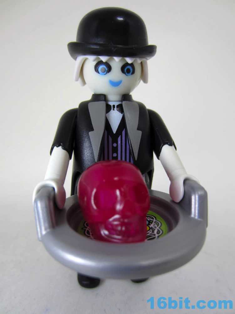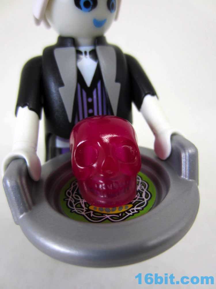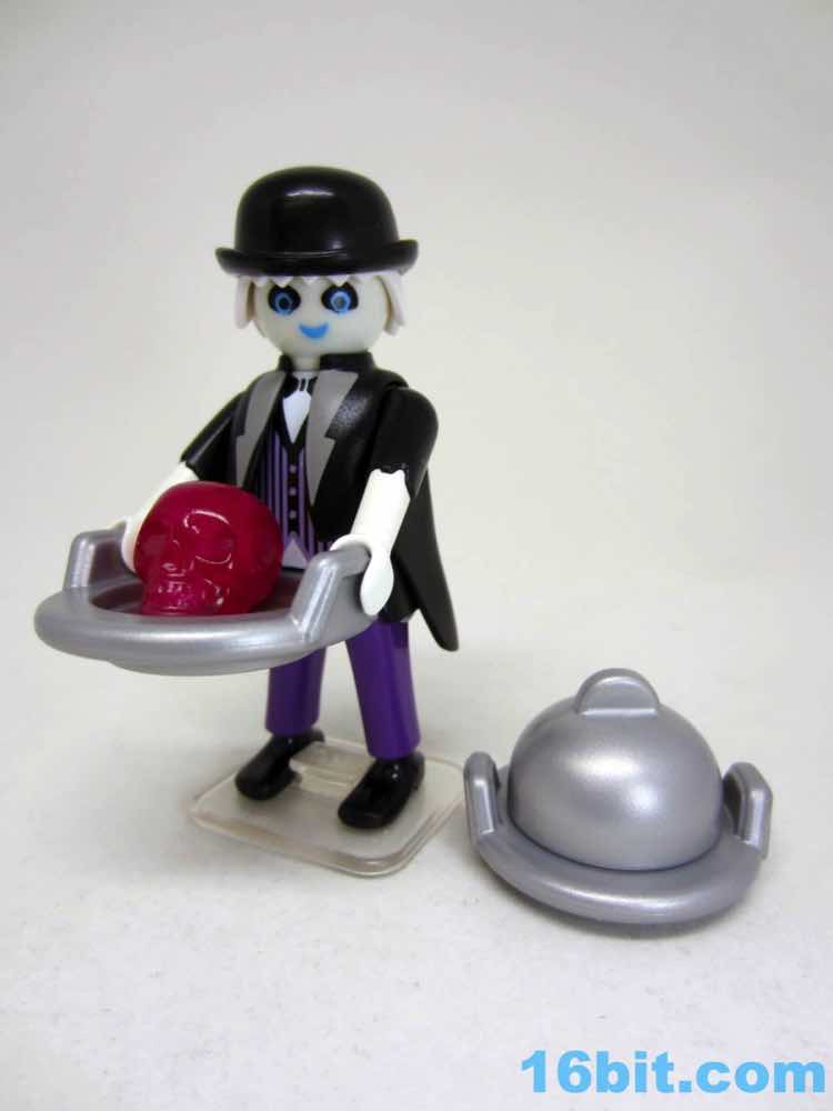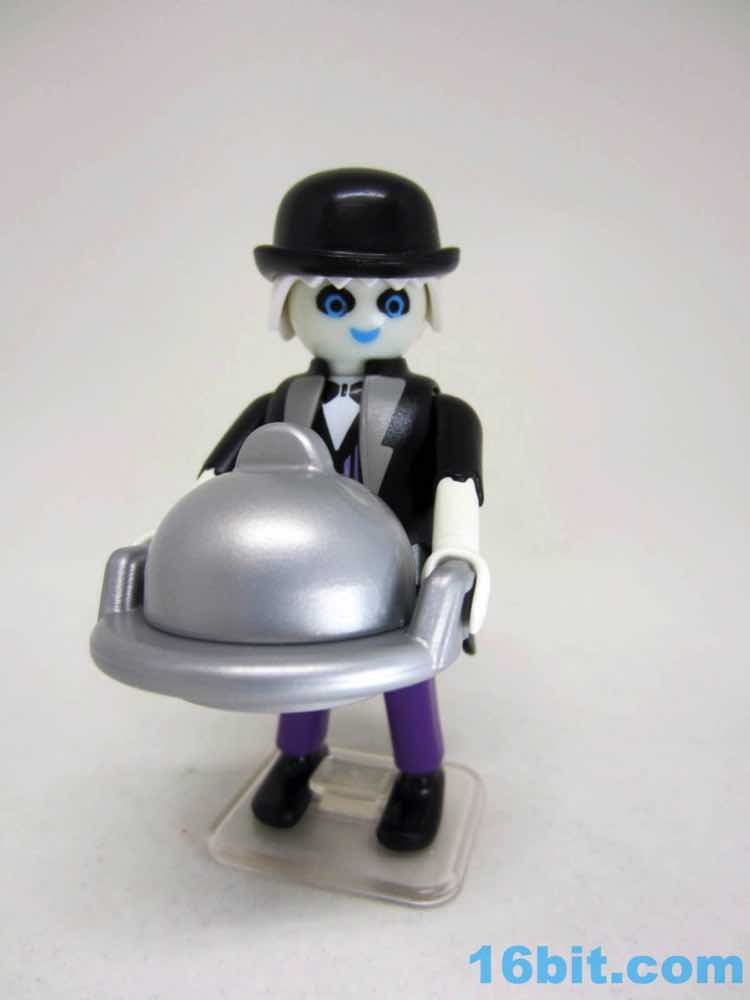 The glow deco and black coat go together nicely, plus this is one of very few figures to include a clear display stand. While this ghostly manservant can stand freely, the wight from the tray, the lid, and what I assume is supposed to be a Jell-O skull of some sort will cause him to tip forward - kudos to Playmobil for solving the problem preemptively. Because this company clearly understands toys, he has no problems holding any of his gear and the lid fits the plate perfectly. The skull has plenty of clearance. It's even easy to put the sticker on the plate, with its weird green pasta dish with rotten eggs and a pickle. I think. I guess it's open to interpretation.