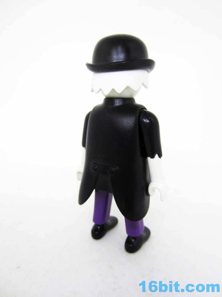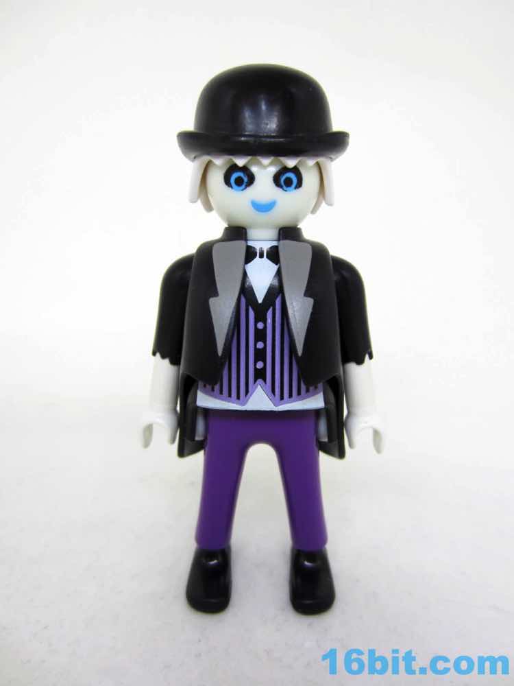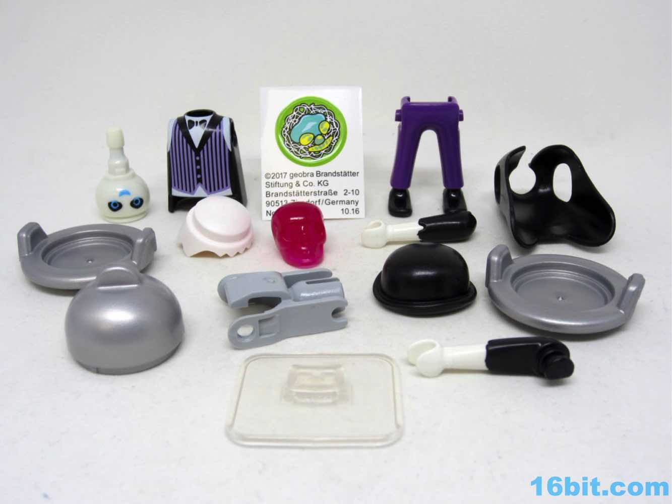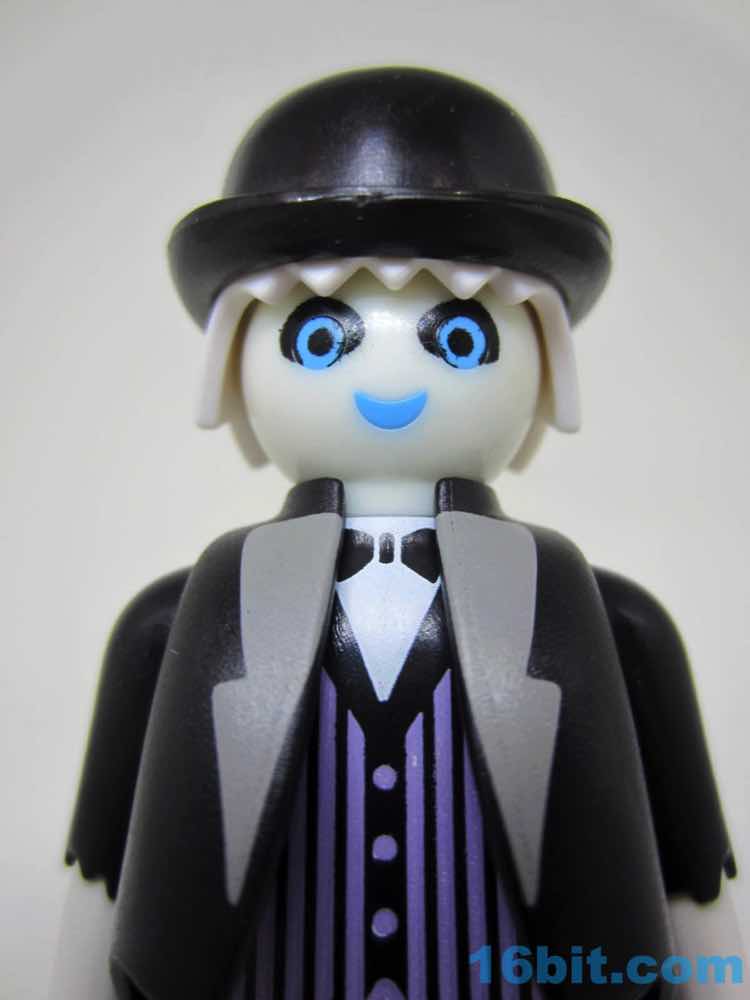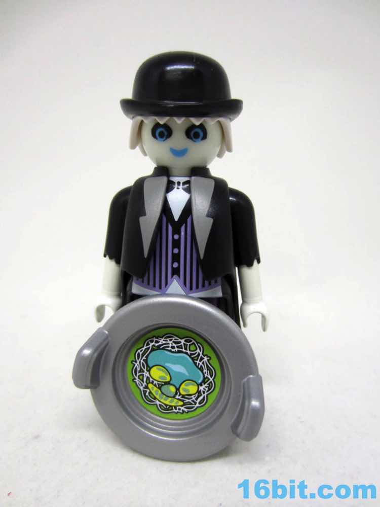 The glow deco and black coat go together nicely, plus this is one of very few figures to include a clear display stand. While this ghostly manservant can stand freely, the wight from the tray, the lid, and what I assume is supposed to be a Jell-O skull of some sort will cause him to tip forward - kudos to Playmobil for solving the problem preemptively. Because this company clearly understands toys, he has no problems holding any of his gear and the lid fits the plate perfectly. The skull has plenty of clearance. It's even easy to put the sticker on the plate, with its weird green pasta dish with rotten eggs and a pickle. I think. I guess it's open to interpretation.