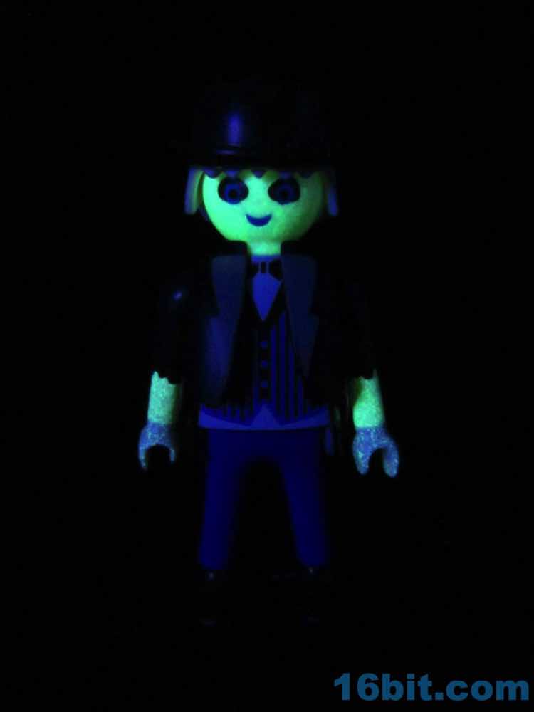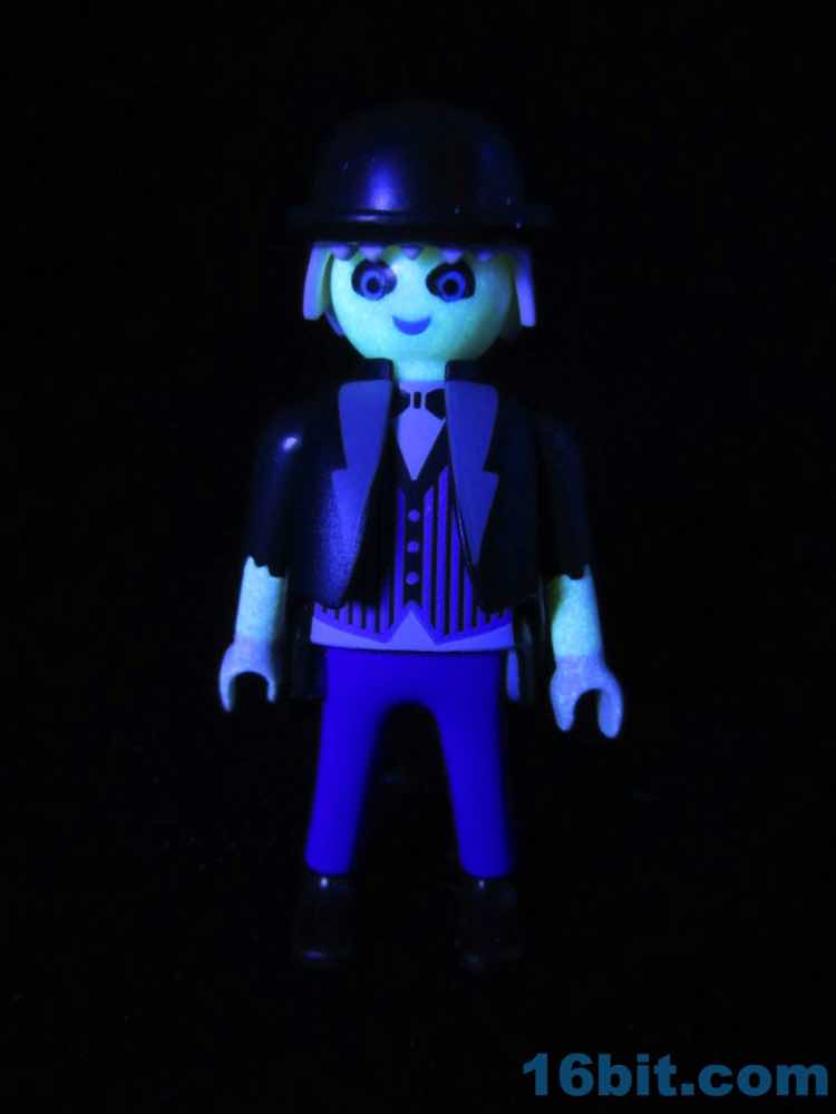 The Ghoul Butler frustrates me, because it's a great figure with no real home. Right now I'm dying for a reissue of the Victorian mansion set from years passed, mostly because it would be awesome in haunted castle colors. Or with cobwebs. This fellow would be right at home with what's left of his formal uniform, vest, and surprising glow-in-the-dark plastic skin. I didn't realize he just wasn't pale until I took him out of the photo room!