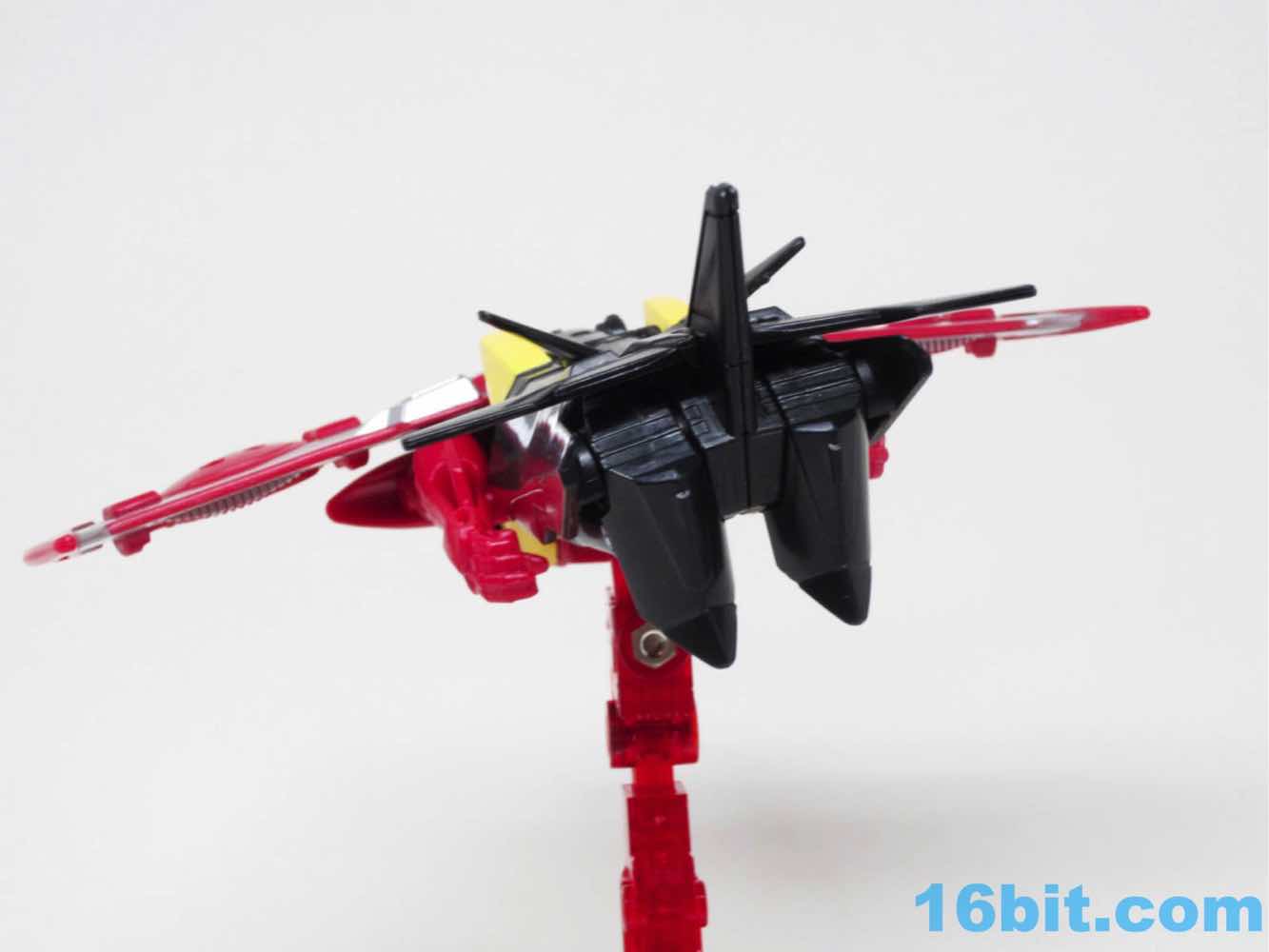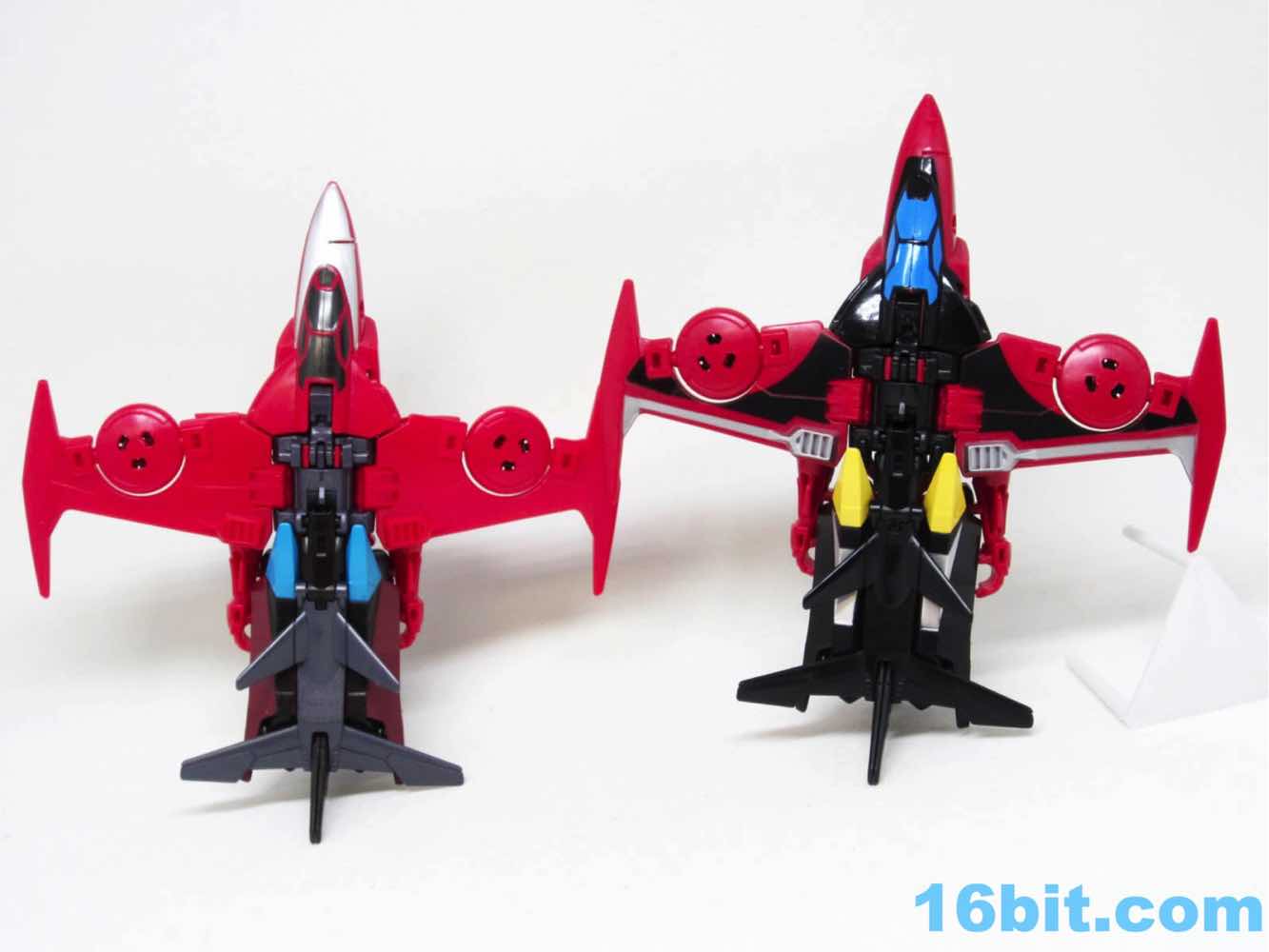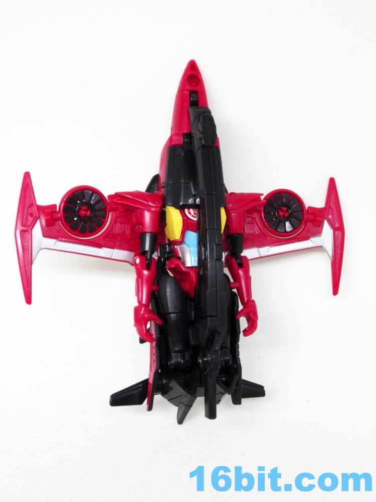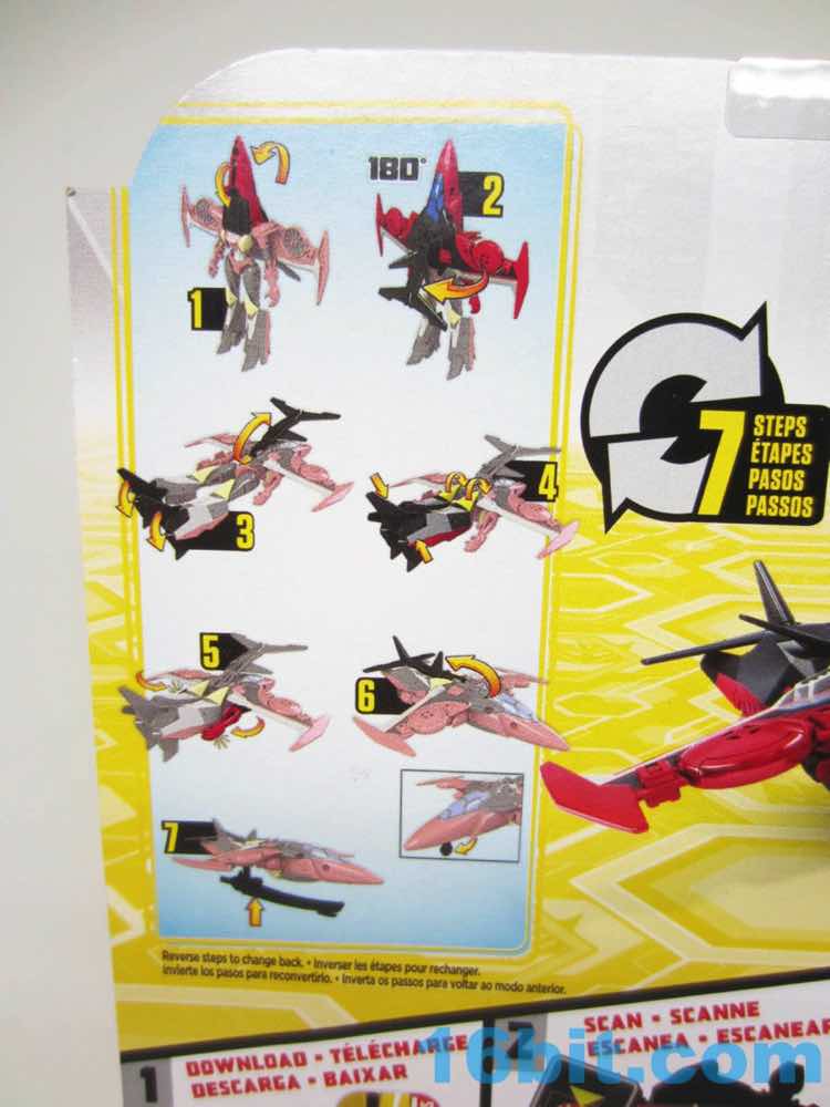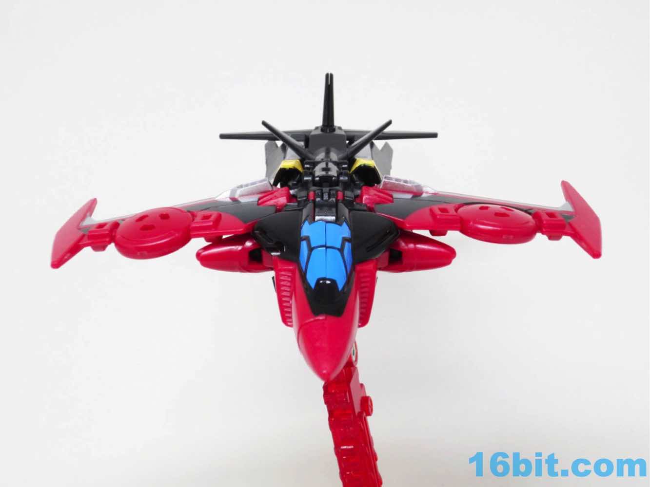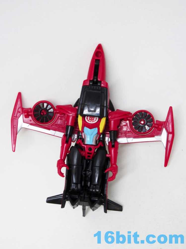 Transformation still simple, and not too different from the recent "headmaster" version. The nosecone backpack folds over her head, the legs become the back of the jet, and a "tail" folds over the gap to make the jet.