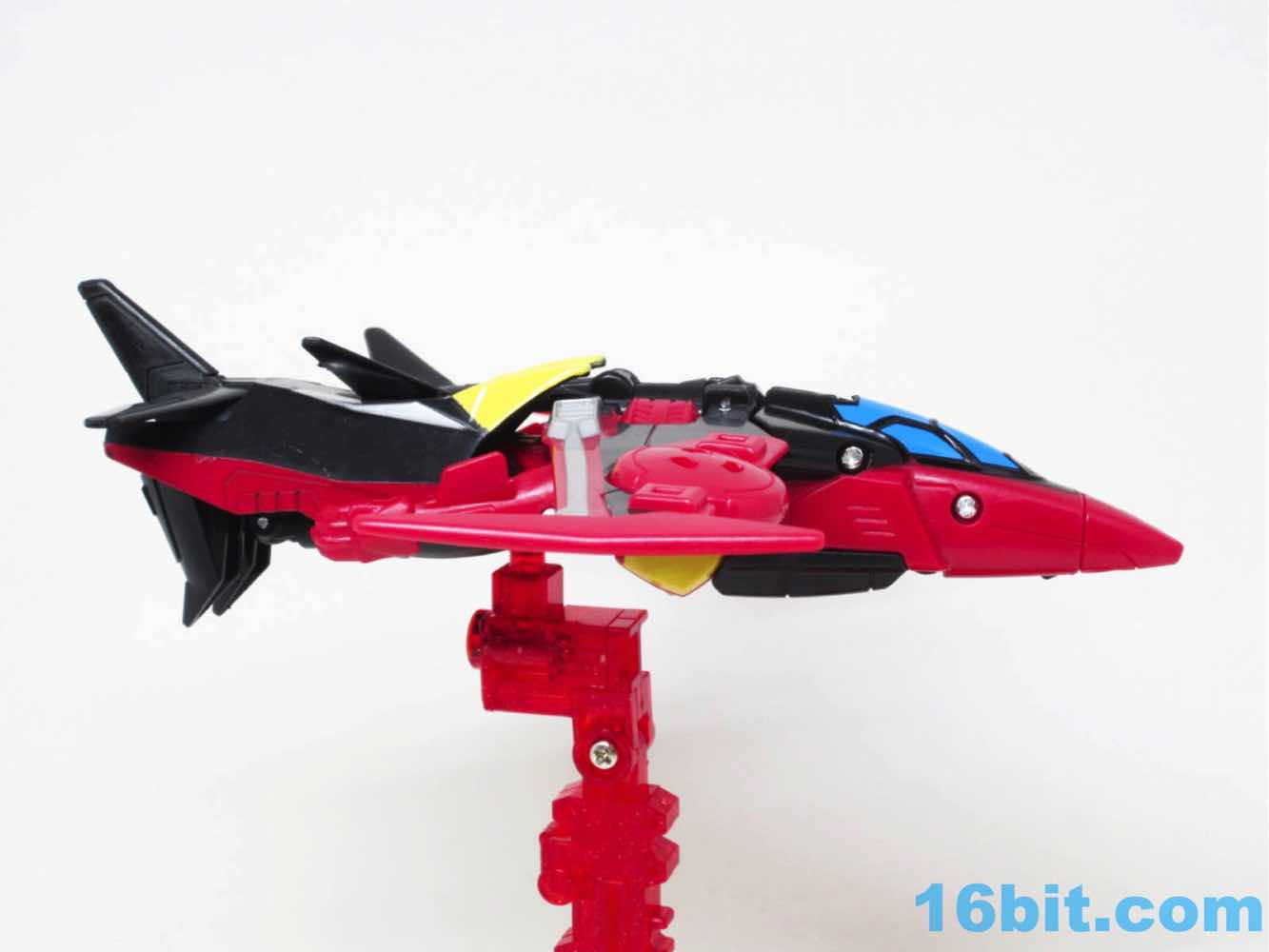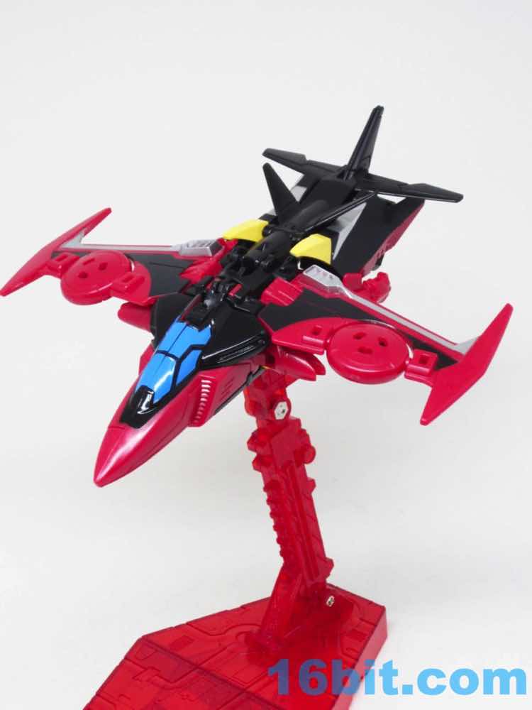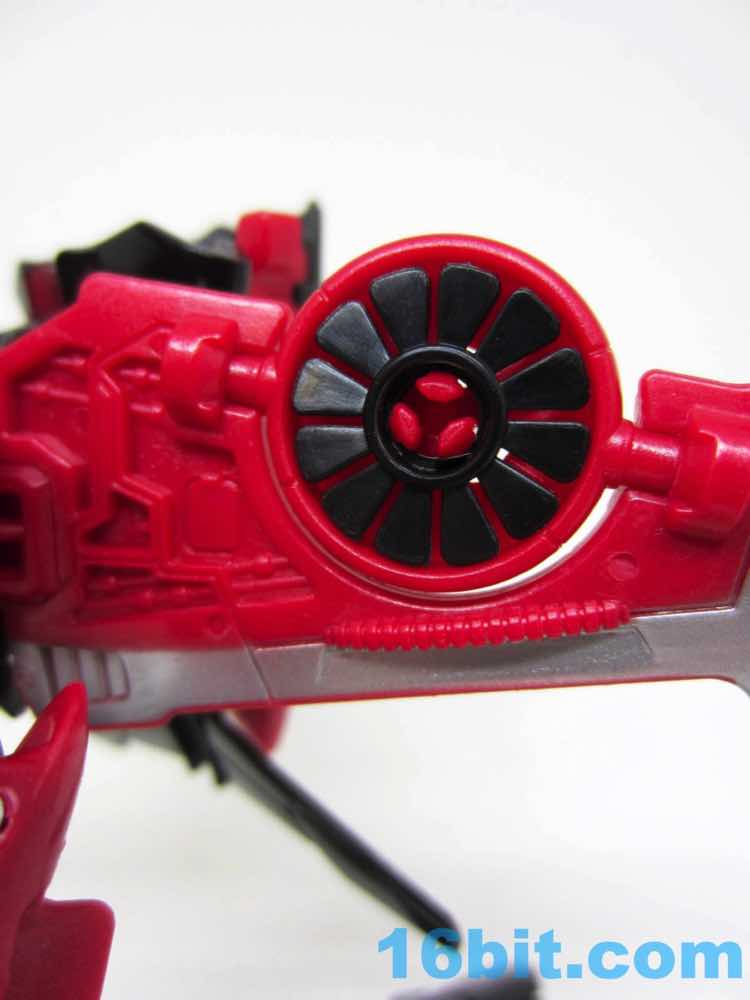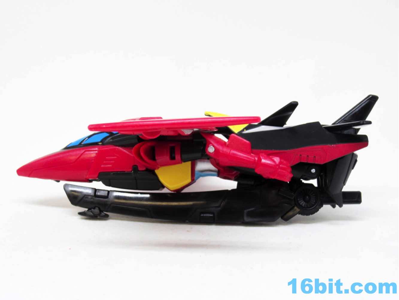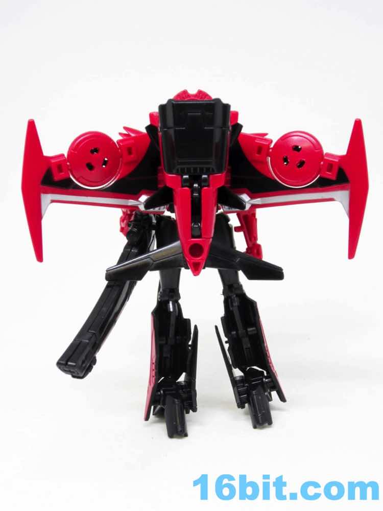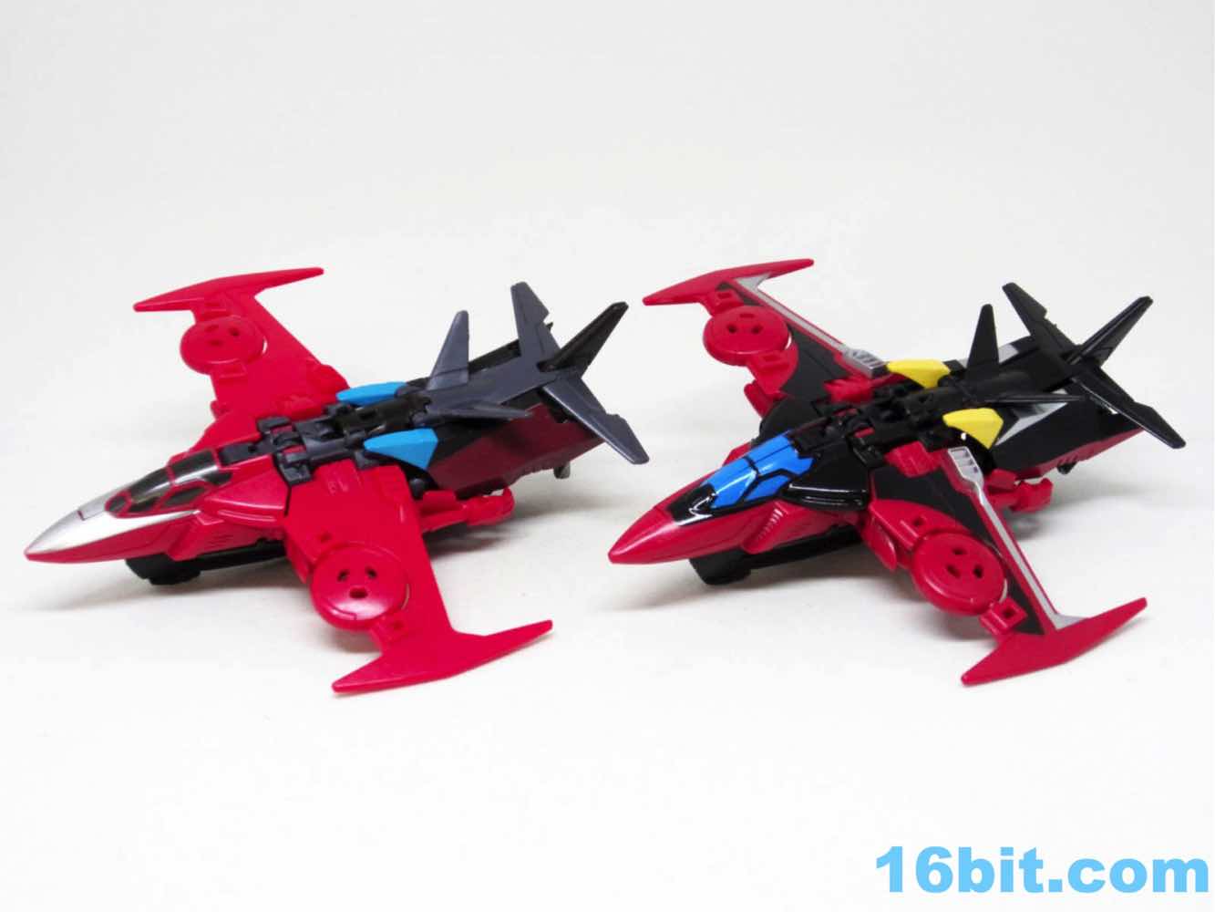 Transformation still simple, and not too different from the recent "headmaster" version. The nosecone backpack folds over her head, the legs become the back of the jet, and a "tail" folds over the gap to make the jet.