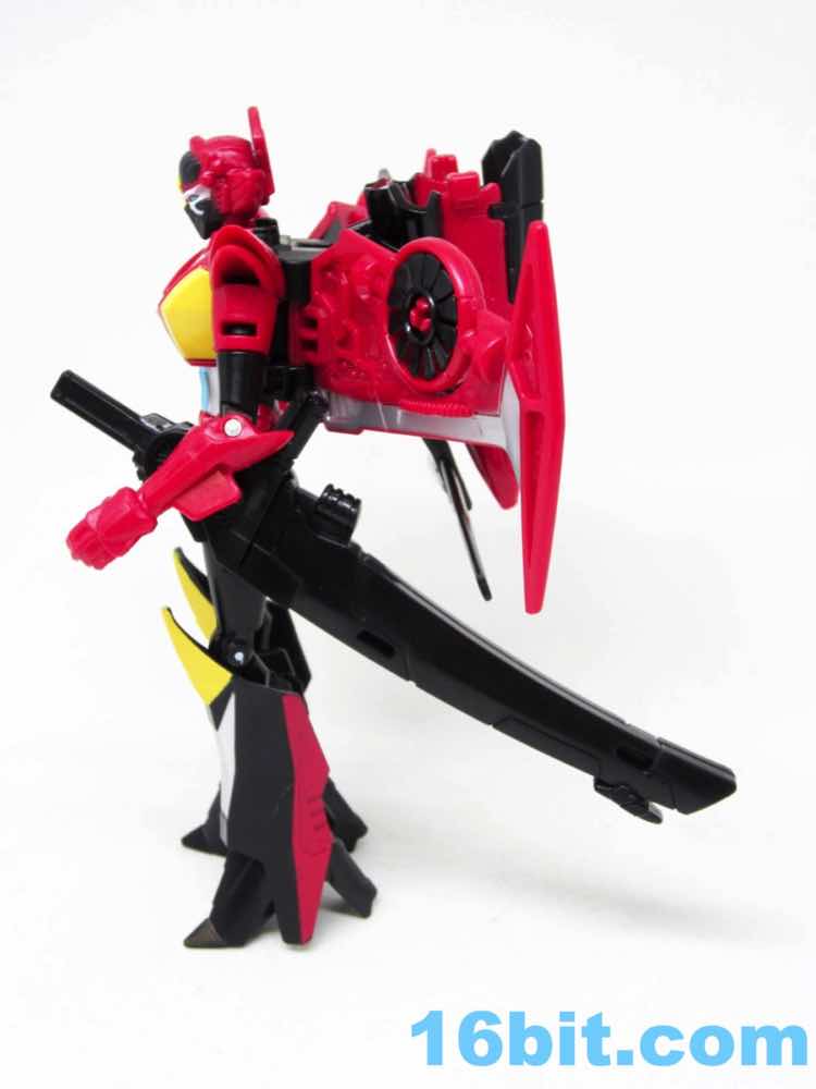 With 14 points of articulation, the 5-inch robot is simple and pretty great. The arms and legs have a good range of movement, and she's sturdy. You aren't going to accidentally knock things out of position. Well, maybe the wings - but her arms, torso, and legs all stay where they should. Articulation is nice and tight, and I love the added yellow highlights. The blue fan on her head is a nice touch, as are all the colors bringing her to life. Sadly, her sword is undecorated.