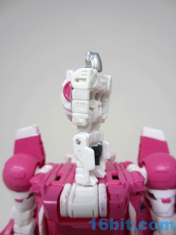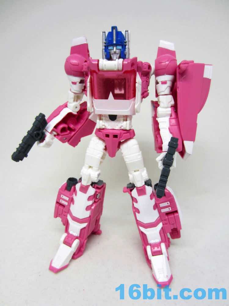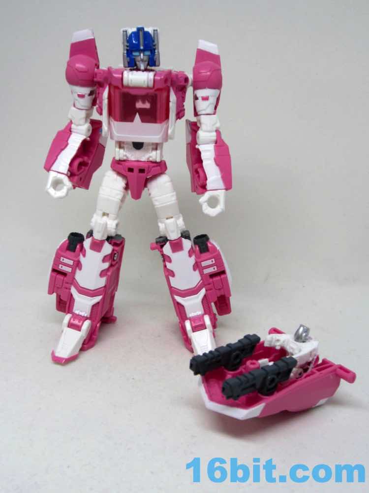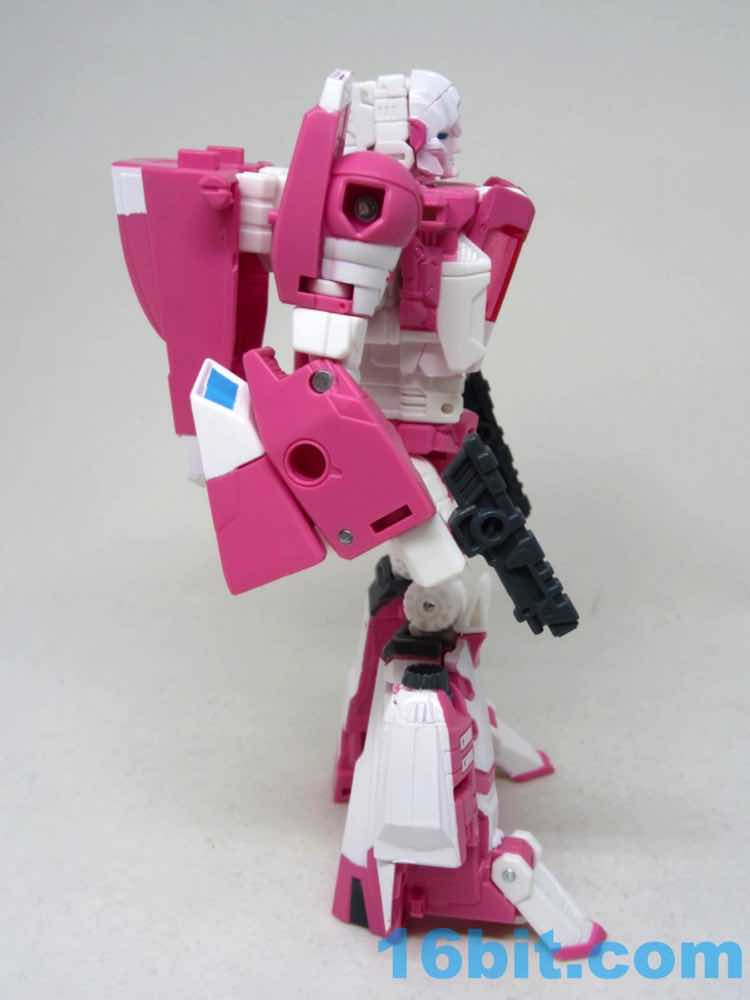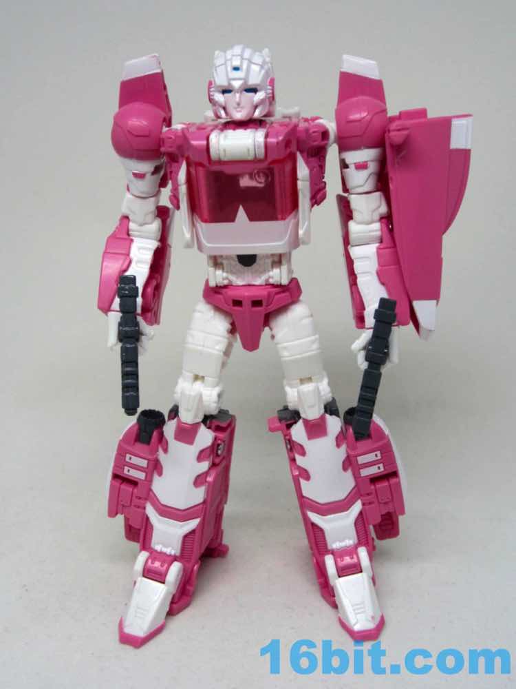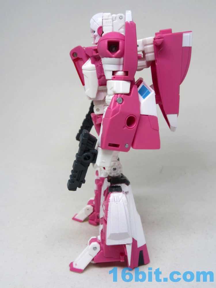 Arcee's robot mode is a lot like Blurr, with 3 key differences. First, her head - it's Arcee, and not Blurr. Second is the coloring - t he pink toy has been given a lot of white parts and a lot of paint. Third, new kibble - the shoulders have fake Arcee convertible pylons, plus a shield/backpack is a new piece that's distinct from Blurr. Her articulation is just as good as Blurr's, 18 points of articulation allow for some action poses and combat action, especially as she can hold her two new blasters. You can also store these in the car kibble shield backpack if you're so inclined, which I really appreciate.