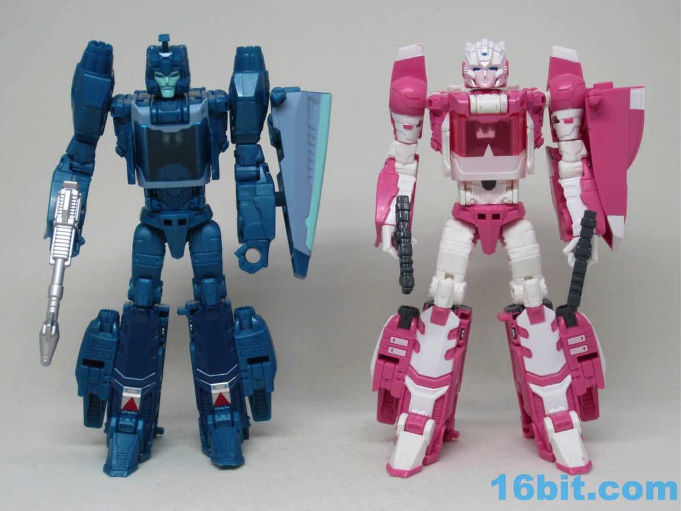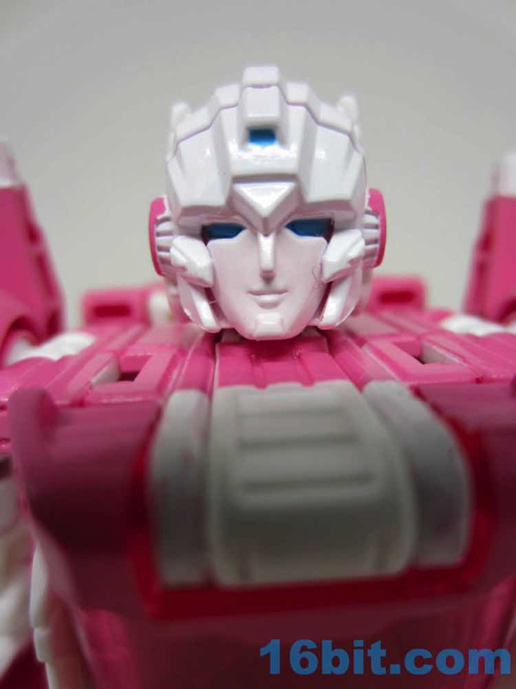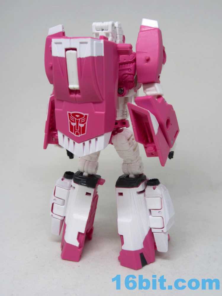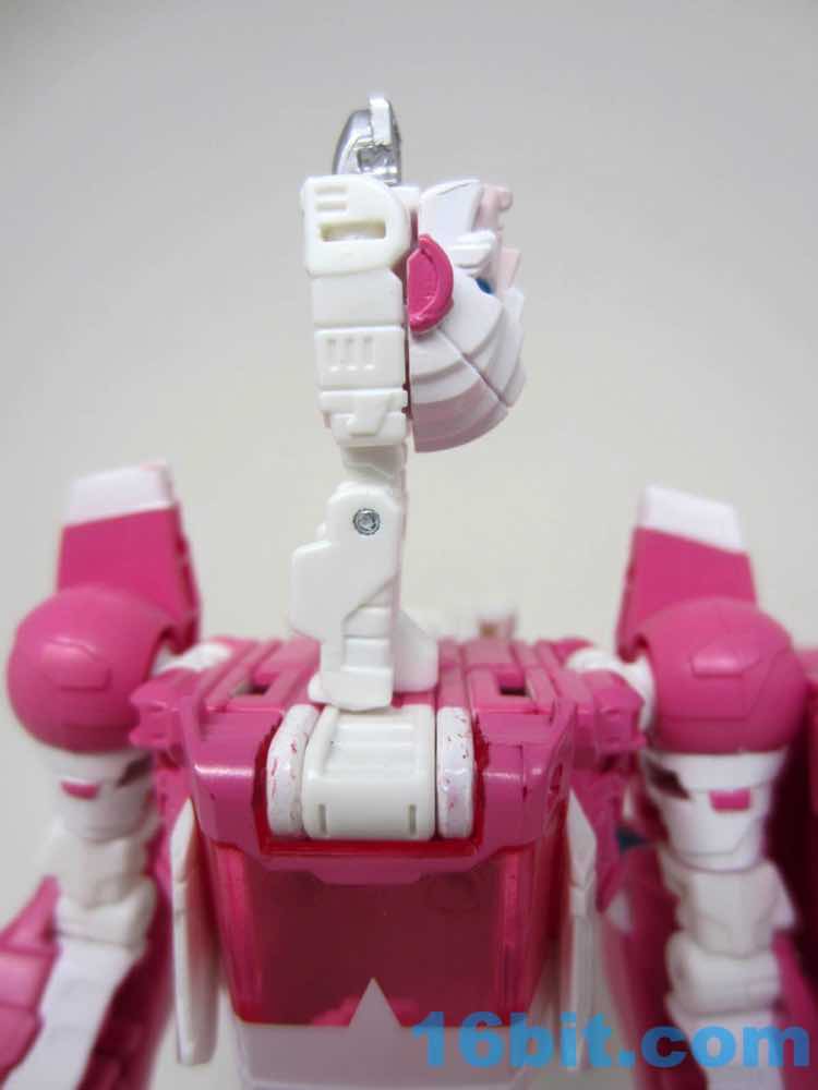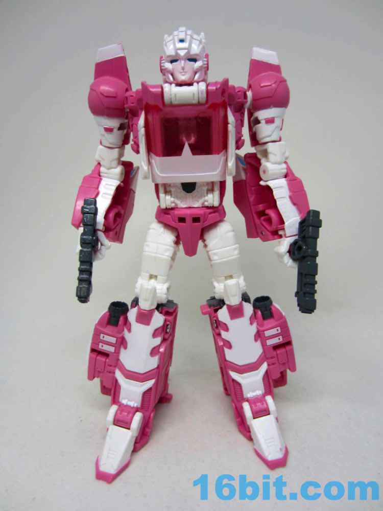 Arcee's robot mode is a lot like Blurr, with 3 key differences. First, her head - it's Arcee, and not Blurr. Second is the coloring - t he pink toy has been given a lot of white parts and a lot of paint. Third, new kibble - the shoulders have fake Arcee convertible pylons, plus a shield/backpack is a new piece that's distinct from Blurr. Her articulation is just as good as Blurr's, 18 points of articulation allow for some action poses and combat action, especially as she can hold her two new blasters. You can also store these in the car kibble shield backpack if you're so inclined, which I really appreciate.