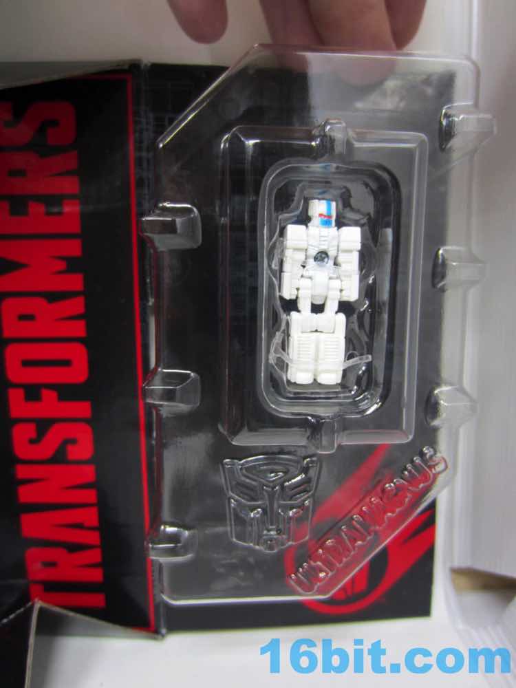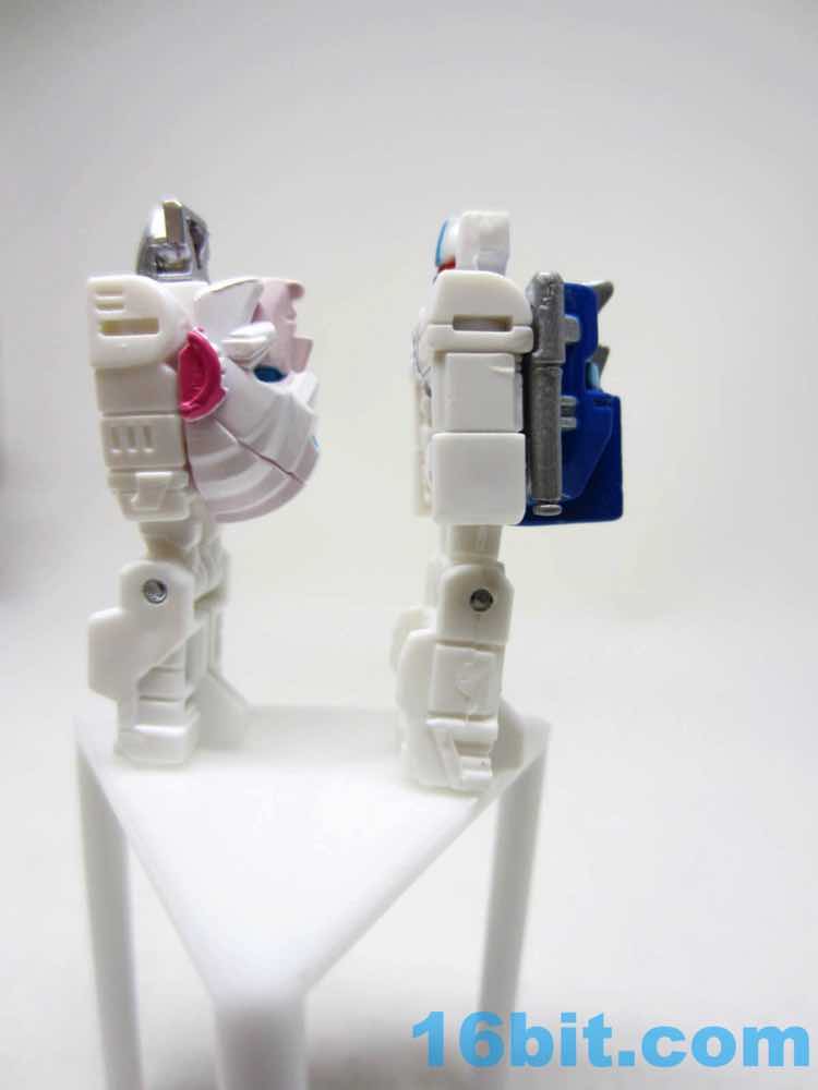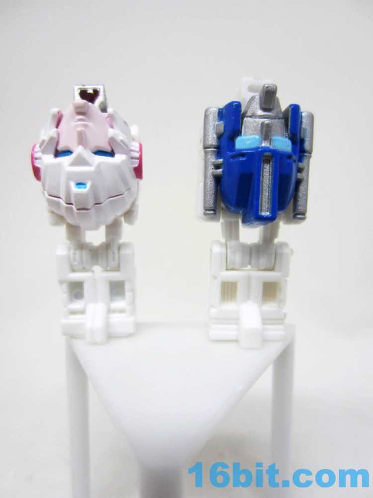 The first tiny head robot should look familiar, as it is 1.5-inches tall and has 5 joints. The face has red eyes and some blue stripes, with a white painted body and limbs molded in white plastic. The figure's backpack is an Ultra Magnus head, and it looks pretty spectacular. The figure has a good weight, and the big head has nice detail.