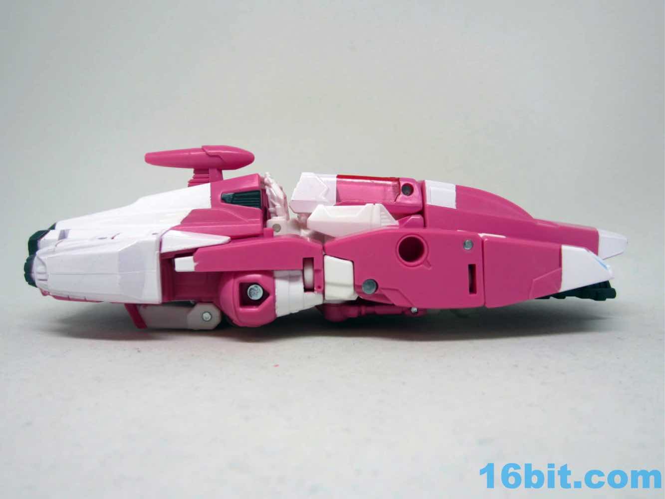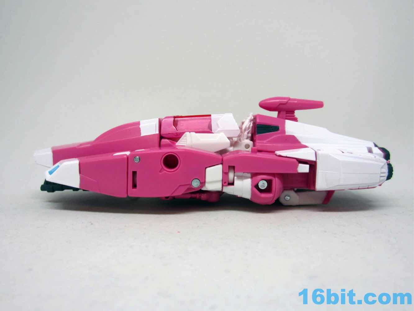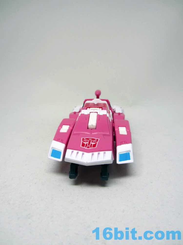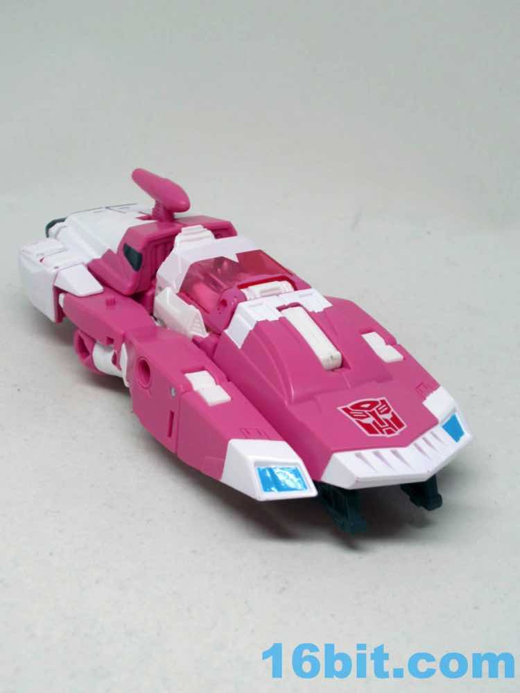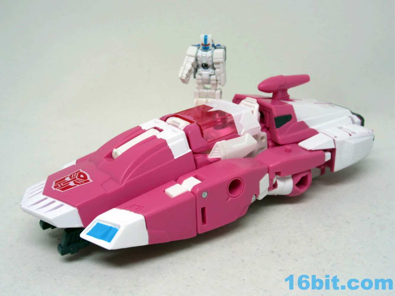 The car is basically Blurr, but in pink, with a couple of new bits. It rolls a bit, and can open up to seat Leinad or another Titan Master or Prime Master figure. The Thrilling 30 version is probably more for most older fans, but if you want a new Arcee this ain't bad. I's pink, at least.