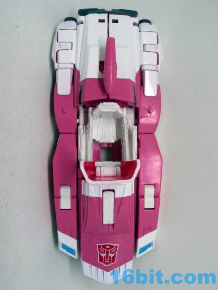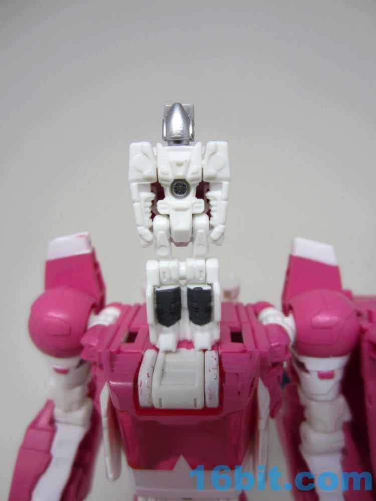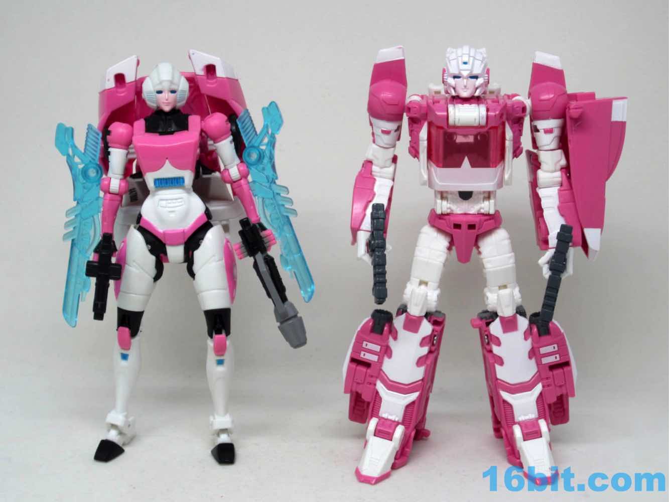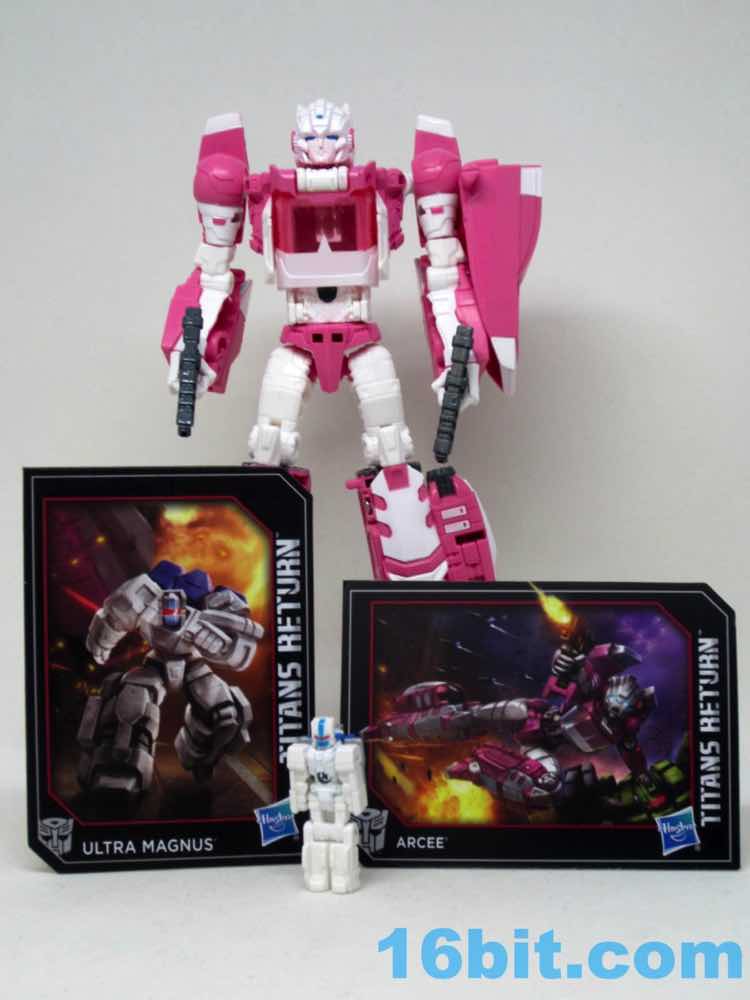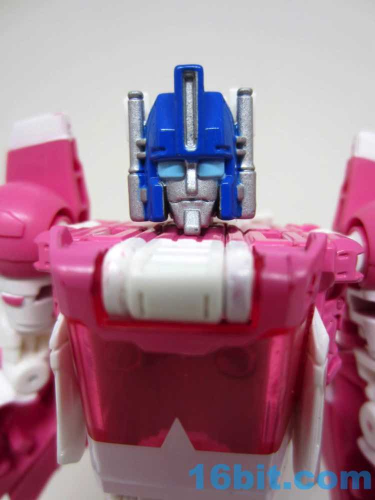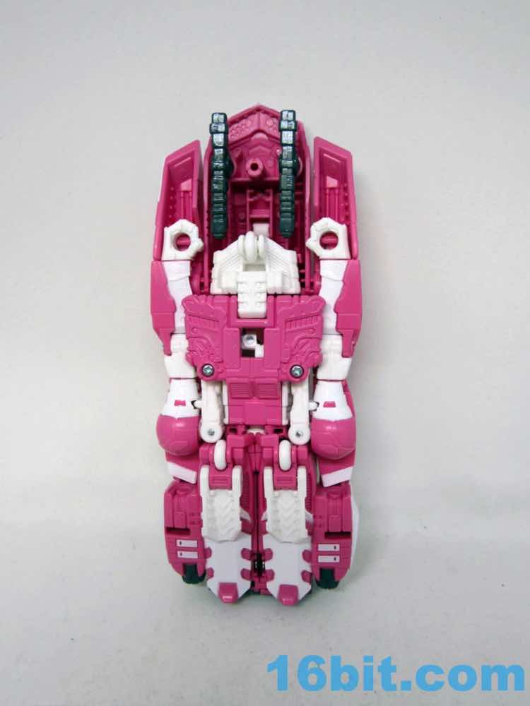 The car is basically Blurr, but in pink, with a couple of new bits. It rolls a bit, and can open up to seat Leinad or another Titan Master or Prime Master figure. The Thrilling 30 version is probably more for most older fans, but if you want a new Arcee this ain't bad. I's pink, at least.