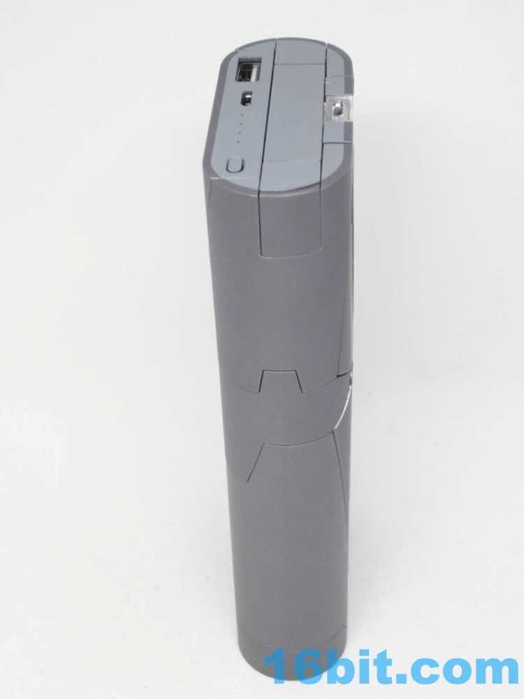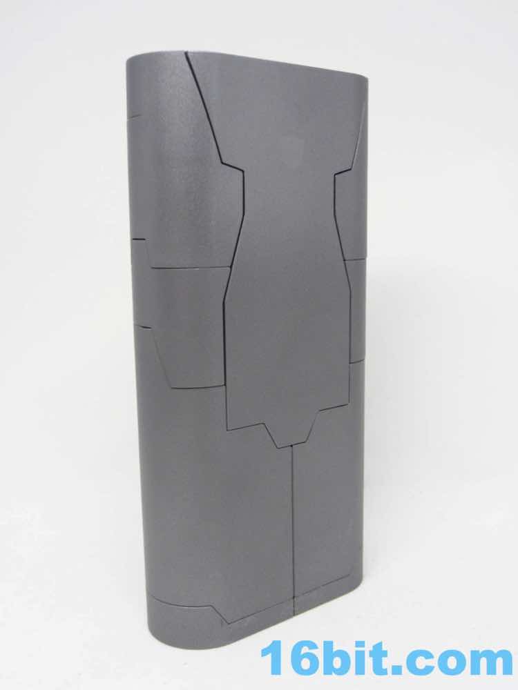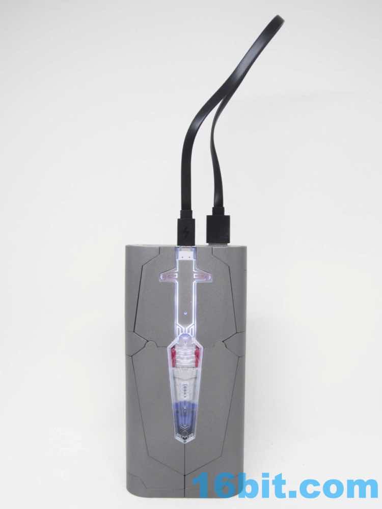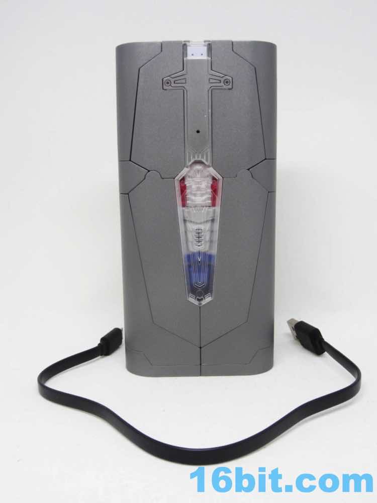 It's satisfyingly heavy when you take the grey brick out of the box, which is an efficient package with a nice illustration tucked under an unassuming cardboard sleeve. It's really nice packaging, and the alt mode looks like a no-nonsense (if large) device to charge your other devices. It's a bit too big to travel with, making it kind of pointless. Hasbro says it's not a toy - and they're right. It's too big to fit in a pocket or a purse to be useful on the road, unless maybe your kid wanted a travel charger - but again, it's not a toy. It goes from Voyager-sized brick to slightly-bigger-than-Voyager-sized robot in a few easy steps, making it very simple, very hollow, and a whole lot of not much fun. The bank mode is what you see - it does nothing other than charge, or if you plug the cable in to the sword, that will light up.