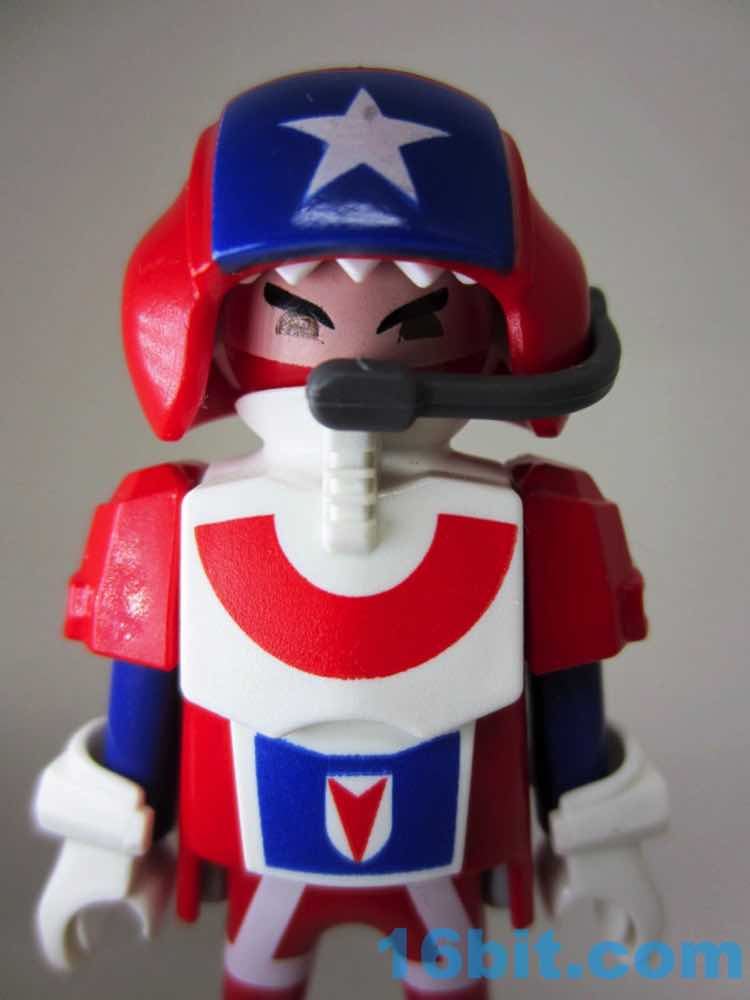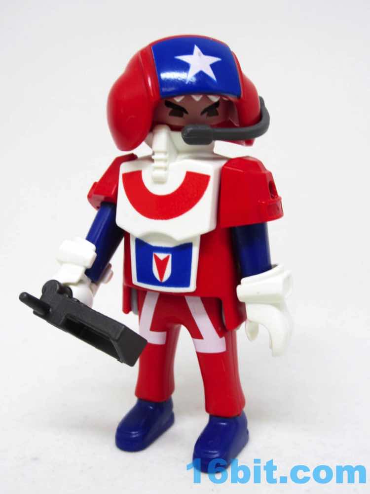 The Captain America is a name, probably not the name, for this figure as I'm seeing it online. He has a helicopter pilot's helmet, bulky shoulder pads and gloves, and a head molded in red with some visible flesh painted on and what I can probably describe as eyes painted in the shape best reserved for Asian-themed figures. With white hair. Why? I have no idea.