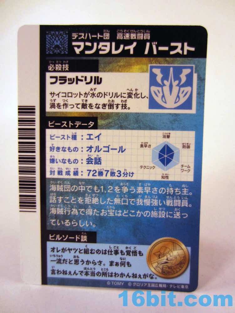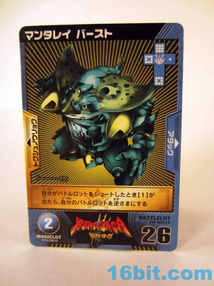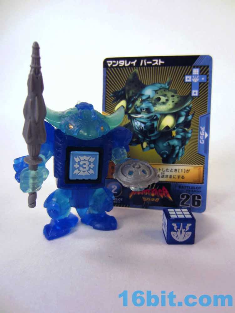 Item No.: BS-40 Manufacturer:Takara-Tomy Includes:Lance, shield, 2 dice, trading card Action Feature:Dice launch out of stomach Retail:525 yen (or about $7) Availability: March 2013 Other: Also translated as "Mantarei" early on