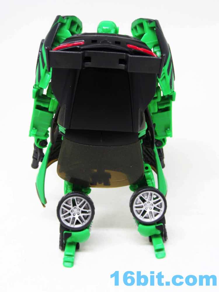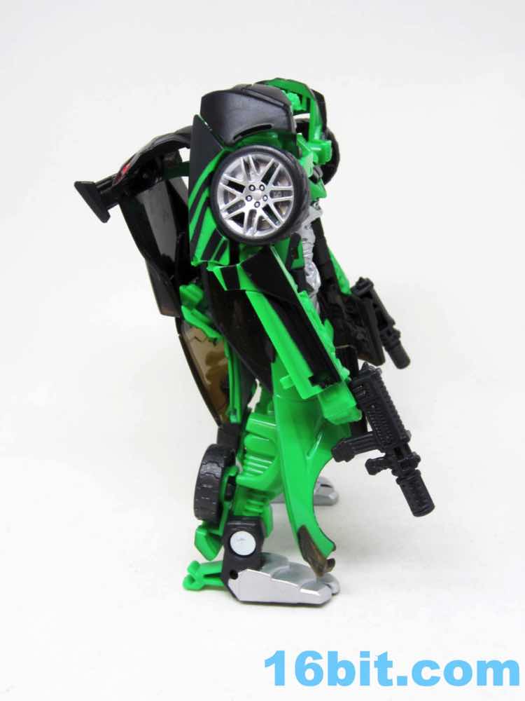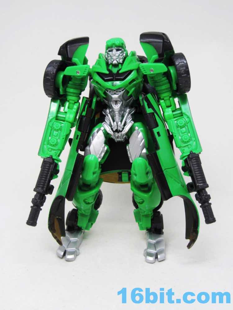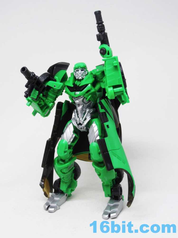 The green is rich, the blacks even, and the silvers thick. I love the weird angles on his face, almost as much as I dislike the fact he has unpainted goggles on the head. His fists easily hold his two pistols, and the sides of the car look sort of like a duster for this faux-gunslinger robot. I can't really see "old west gunman" our of "green robot with car parts on his legs," but the silhouette is more or less there.