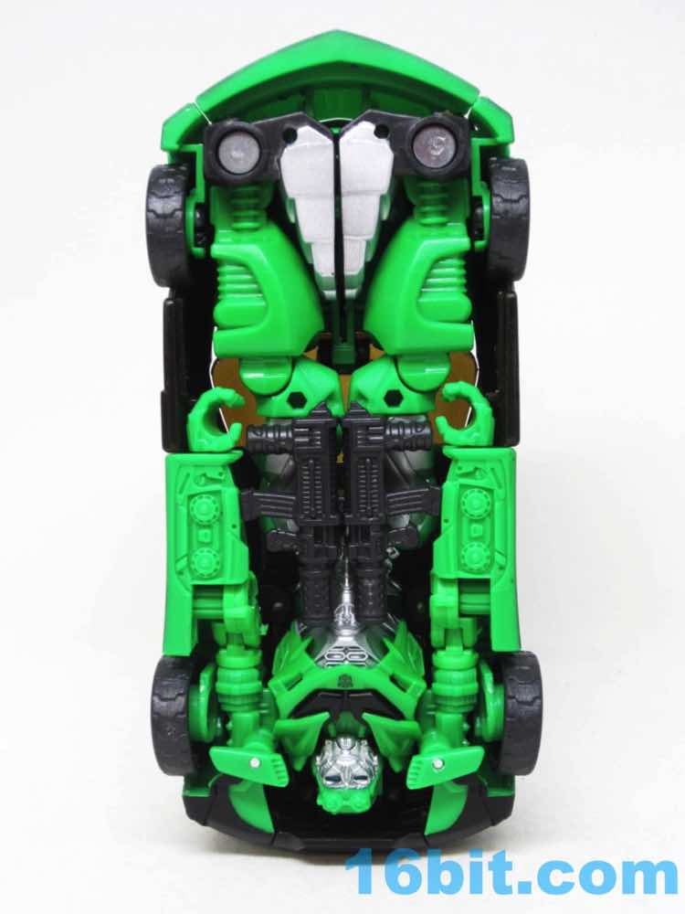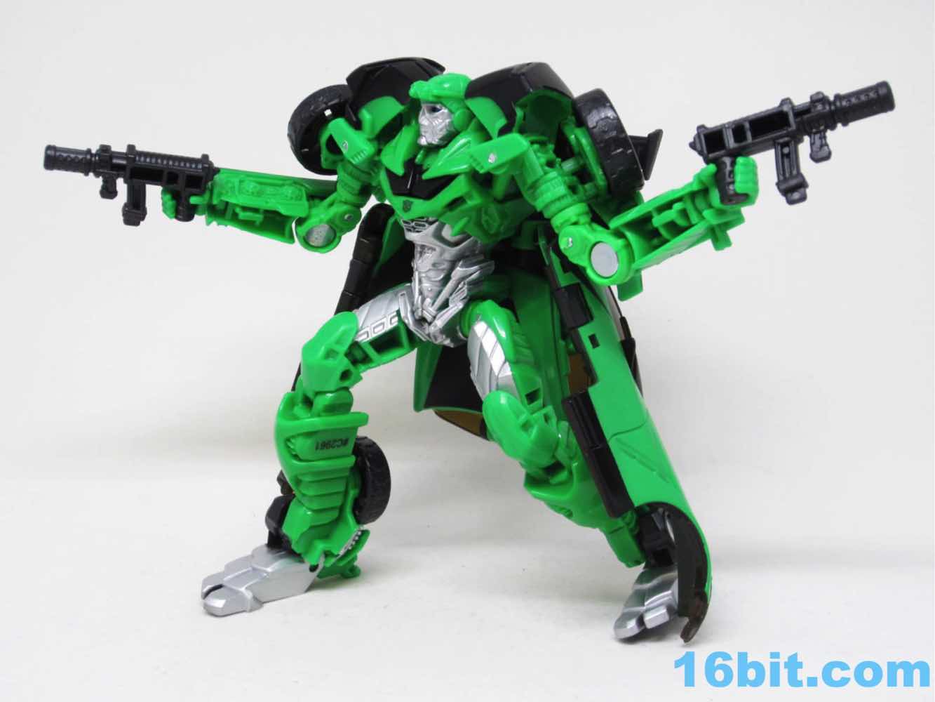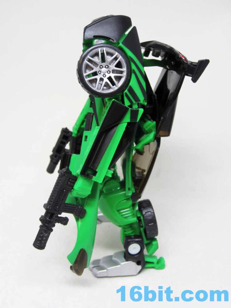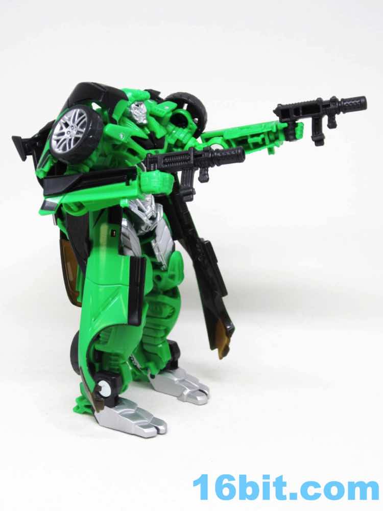 The green is rich, the blacks even, and the silvers thick. I love the weird angles on his face, almost as much as I dislike the fact he has unpainted goggles on the head. His fists easily hold his two pistols, and the sides of the car look sort of like a duster for this faux-gunslinger robot. I can't really see "old west gunman" our of "green robot with car parts on his legs," but the silhouette is more or less there.