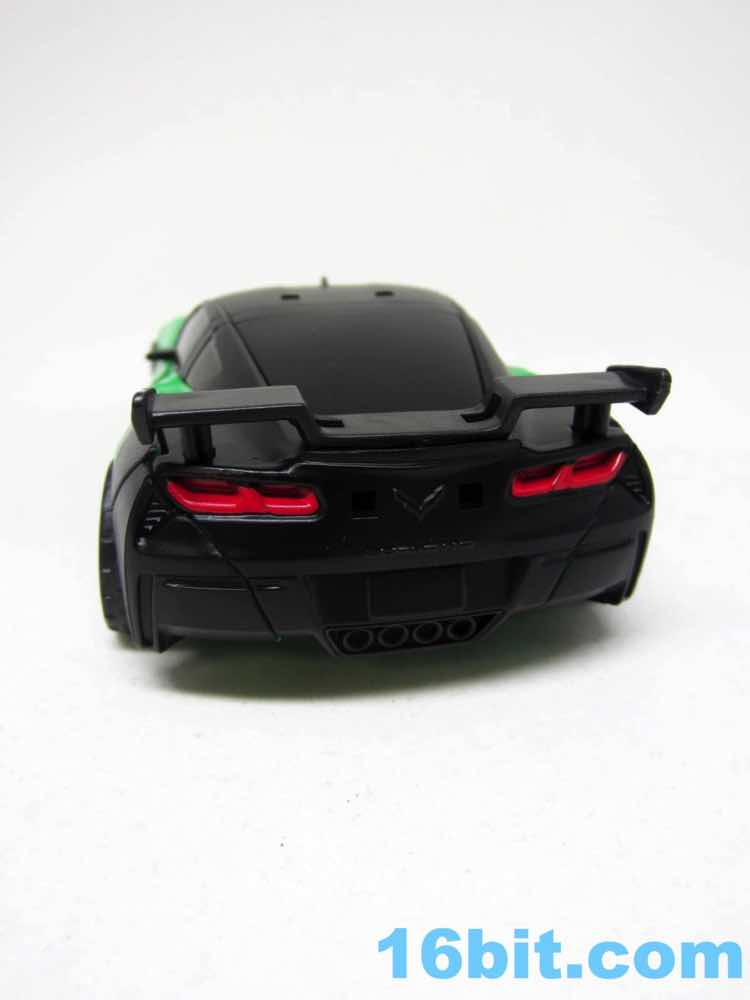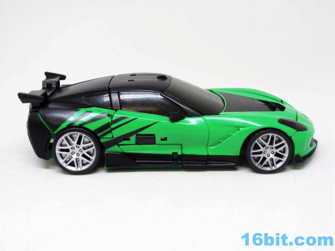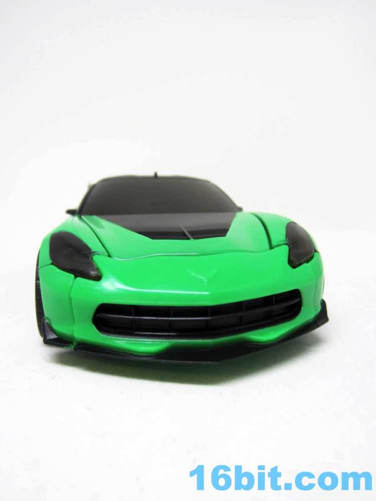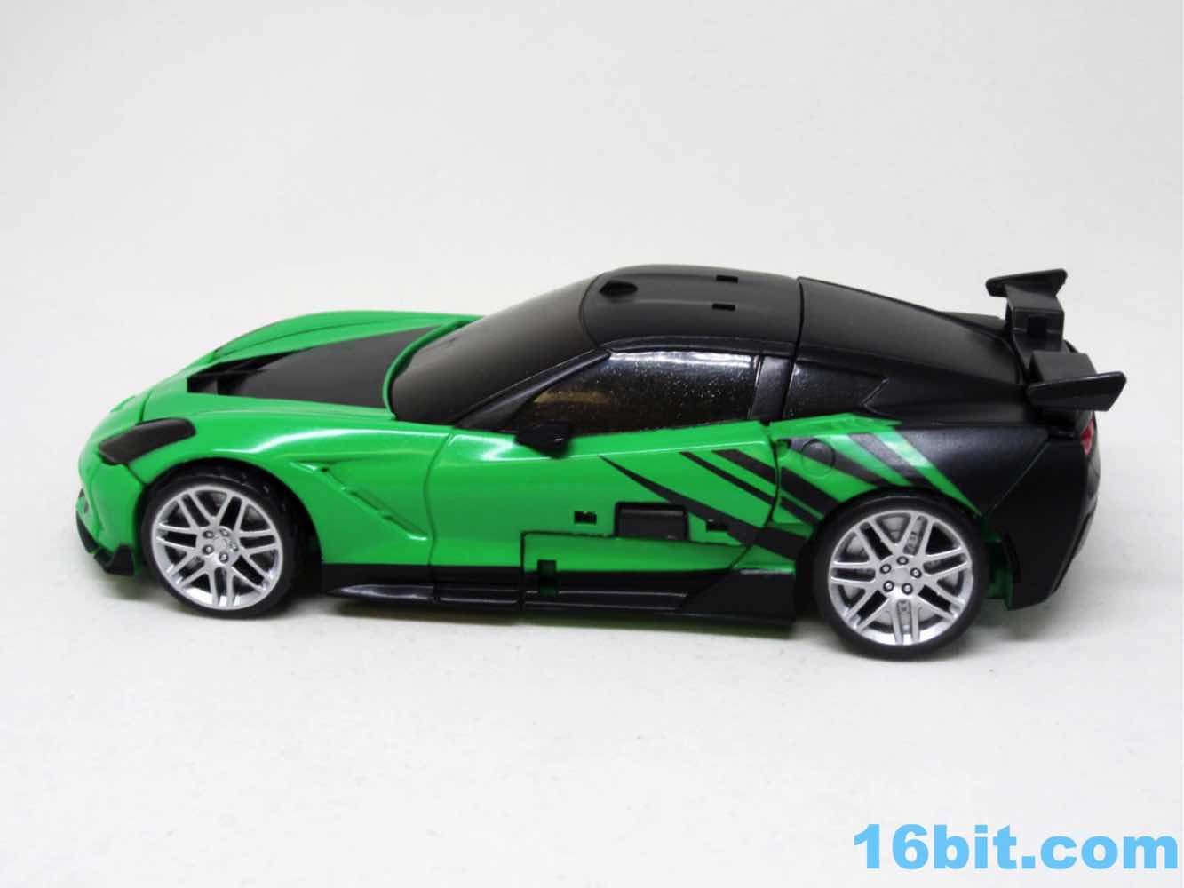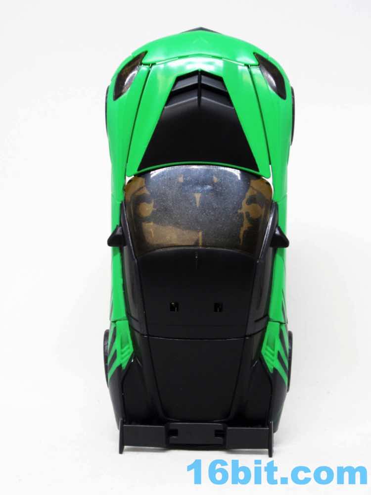 The car is pretty nice - the panels fit together, it has silver painted wheels, red rear lights, and clear headlights too. There are nifty custom designs on the doors, and a swell black hood. The sculpted tidbits are great, and the glittery tinted windows are a nice touch. His wheels spin about as well as clip-in wheels can, and there's storage for his two guns under the vehicle. While the car itself has no real play action features, the sculpt is clean and the model looks good. Weirdly it feels super light and hollow - the robot mode feels a bit more meaty. Perhaps it's the plastic, or the design, but it still looks and feels pretty great.