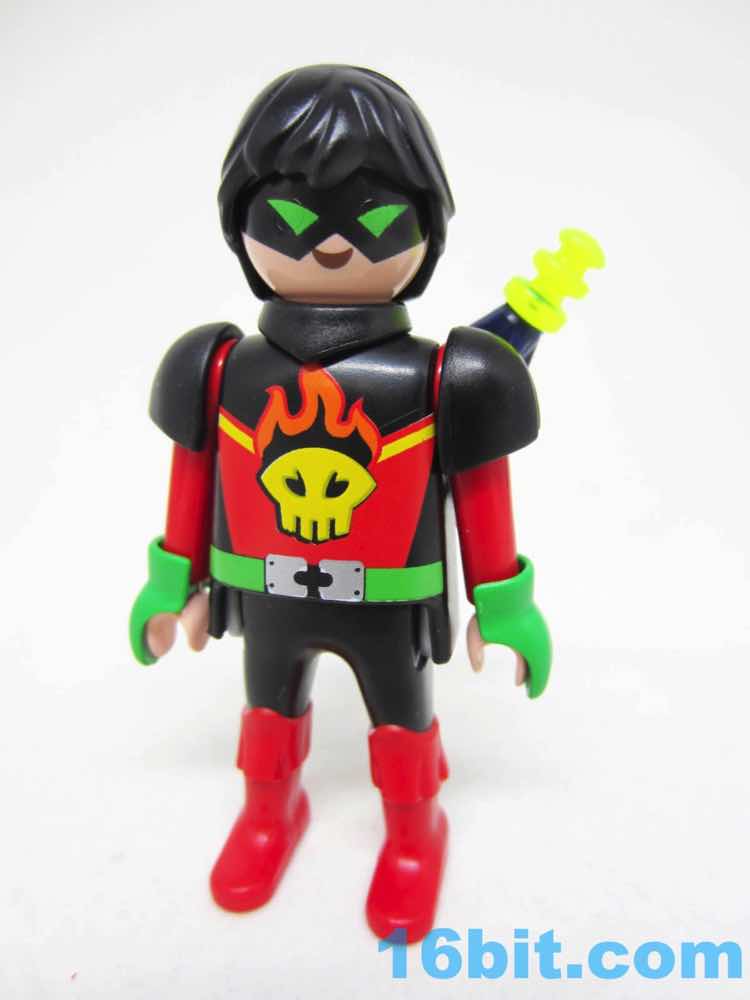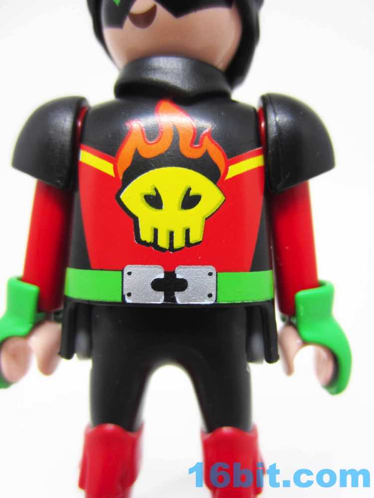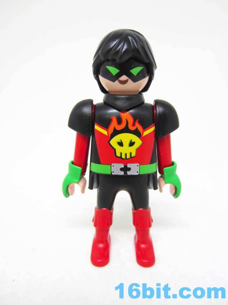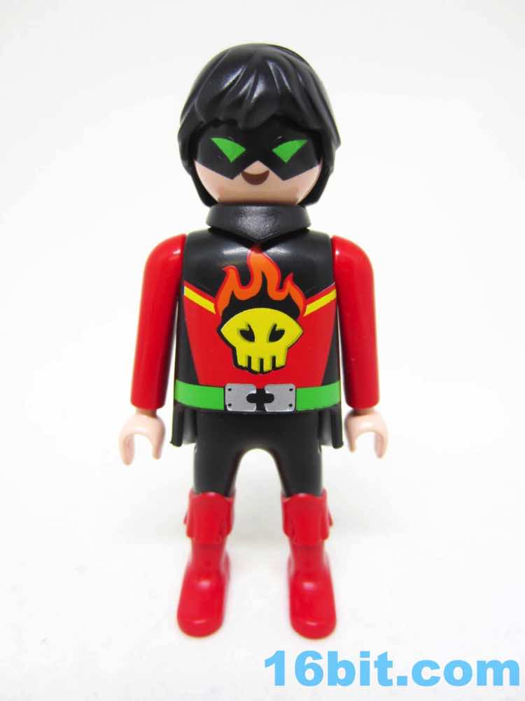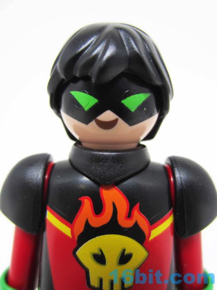 Playmobil's homegrown superheroes are neat, mostly because you can smell traces of other characters in them. I smell a tiny bit of Robin in their Flaming Skull figure, which has no name anywhere so let's call it that! He's mostly red and black, with green gloves and a green belt, plus green eyes in his mask. The head has inset molded eyes and a mouth, all painted over to bring you the superhero charm.