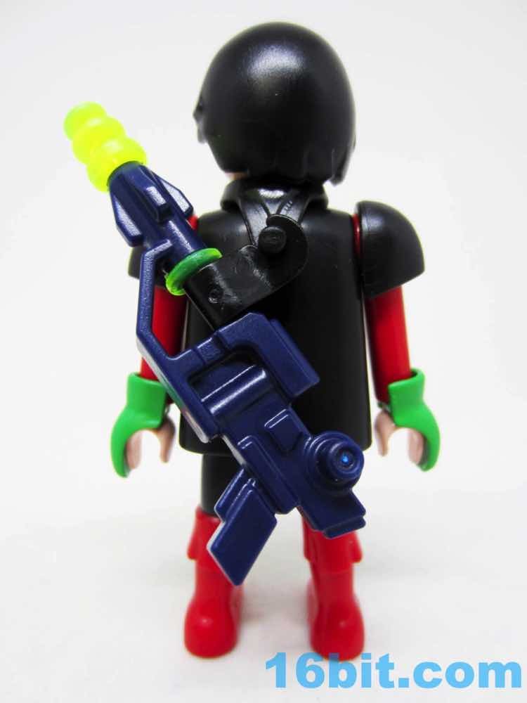Articulation is standard 6-joint Playmobil fare, and the hair is nothing you haven't seen before. He can stand, sit, and hold his weapon - even by the grip, but it's best held by the clear bright green energy beam passing through the body. I should add, that element sings when exposed to black light.