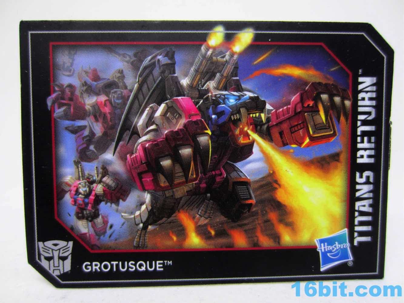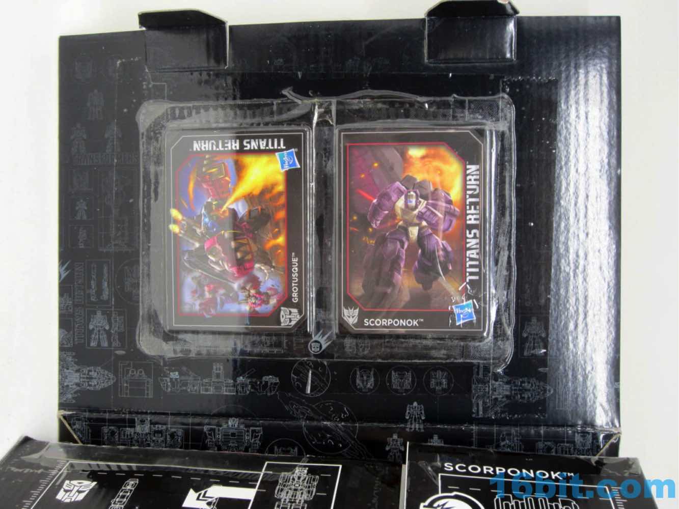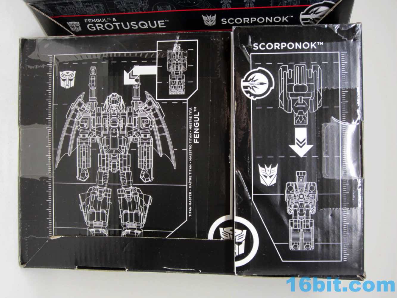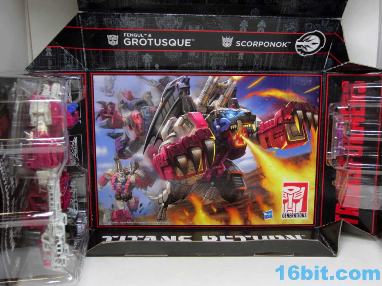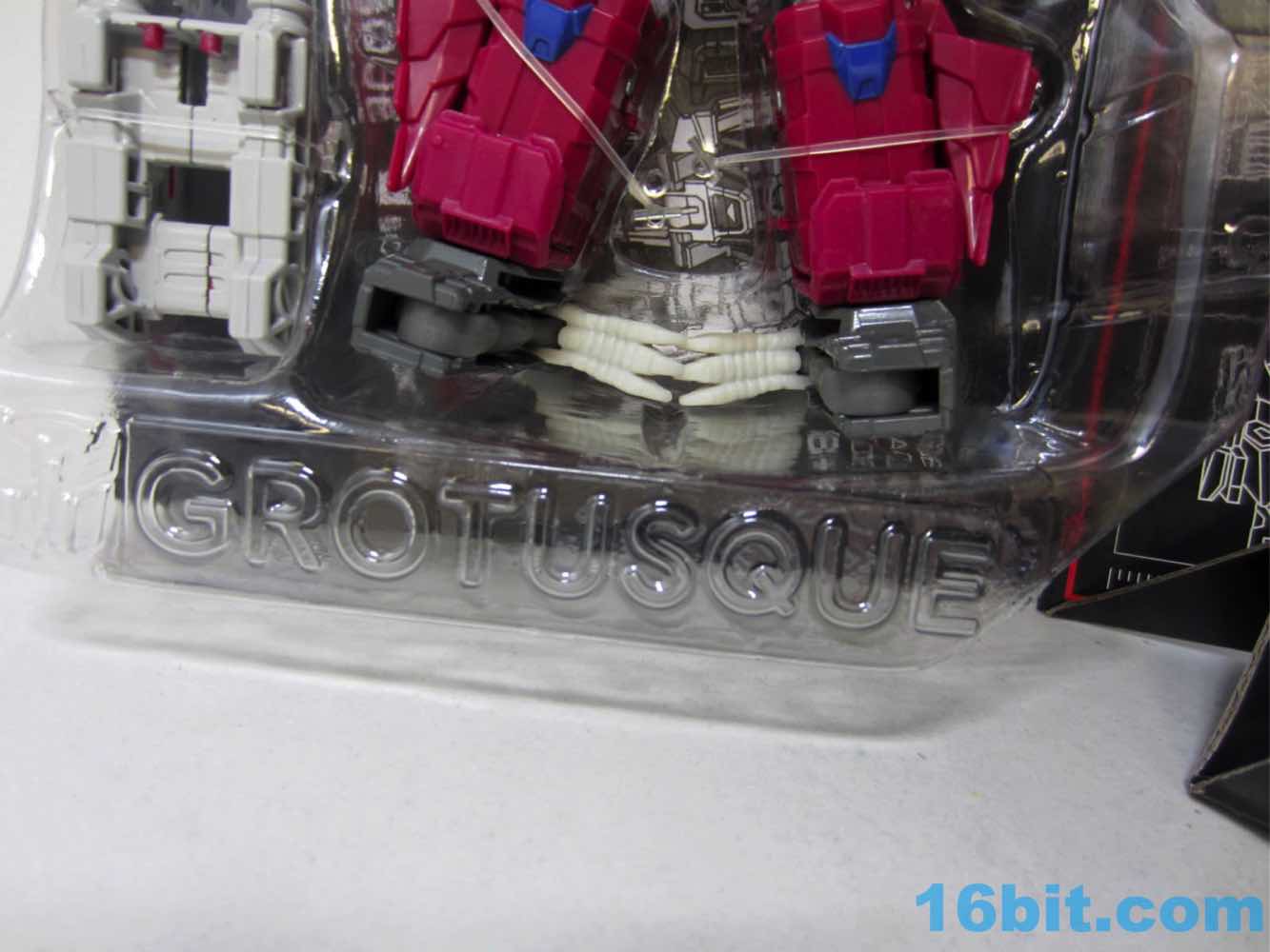 Last month, Hasbro announced Grotusque at New York Comic Con - it went up for sale moments later on HasbroToyShop.com, and sold out hours later. Some people had it in 1-2 days. I had it in under a week. It's witchcraft. The figure is Twinferno [FOTD #] from the waist down, with a new body and arms and head. And recycled wings. It's a good set overall, particularly thanks to a Battle Beasts tribute in the head and a mini Scorponok which in no way will satiate your desires for a bigger one. Packaged in a bland black box, it folds out to give you a gorgeous illustration, trading cards, and your toys - it's a tantalizing glimpse into what would have most likely been the greatest collector club thing of all time.