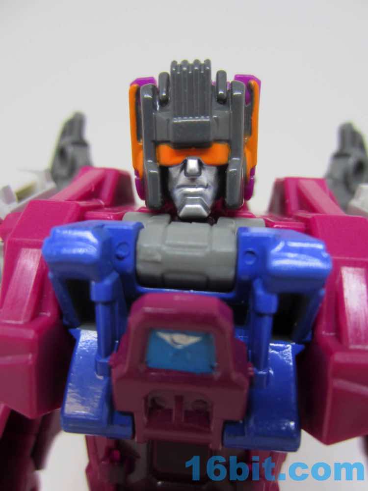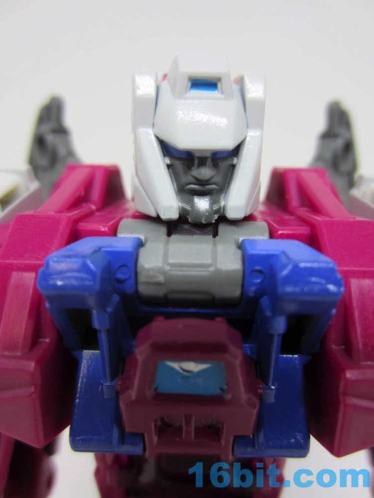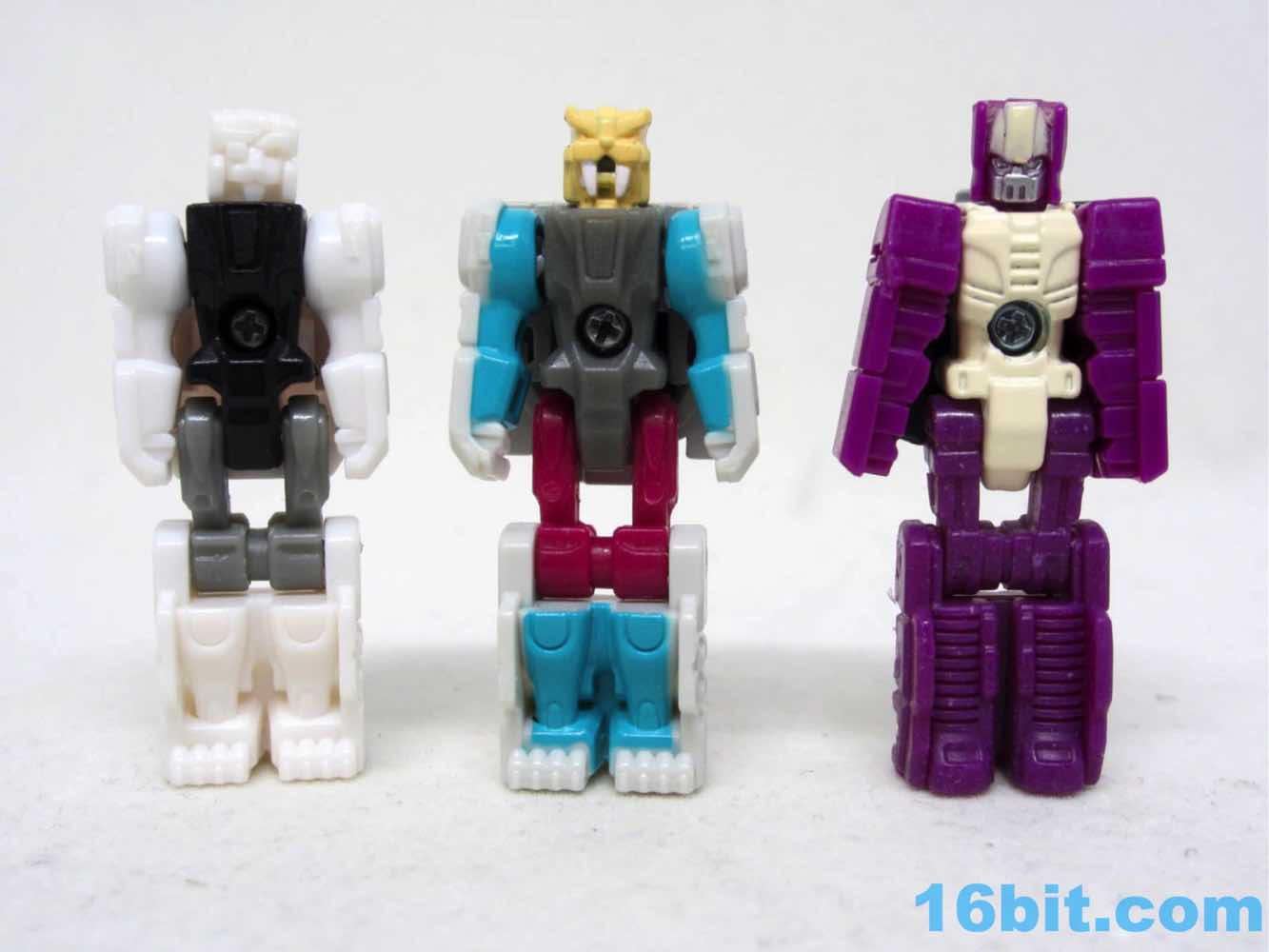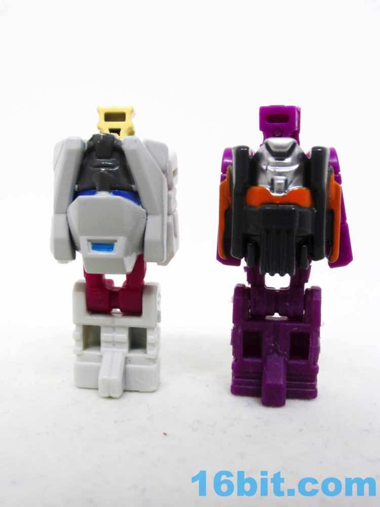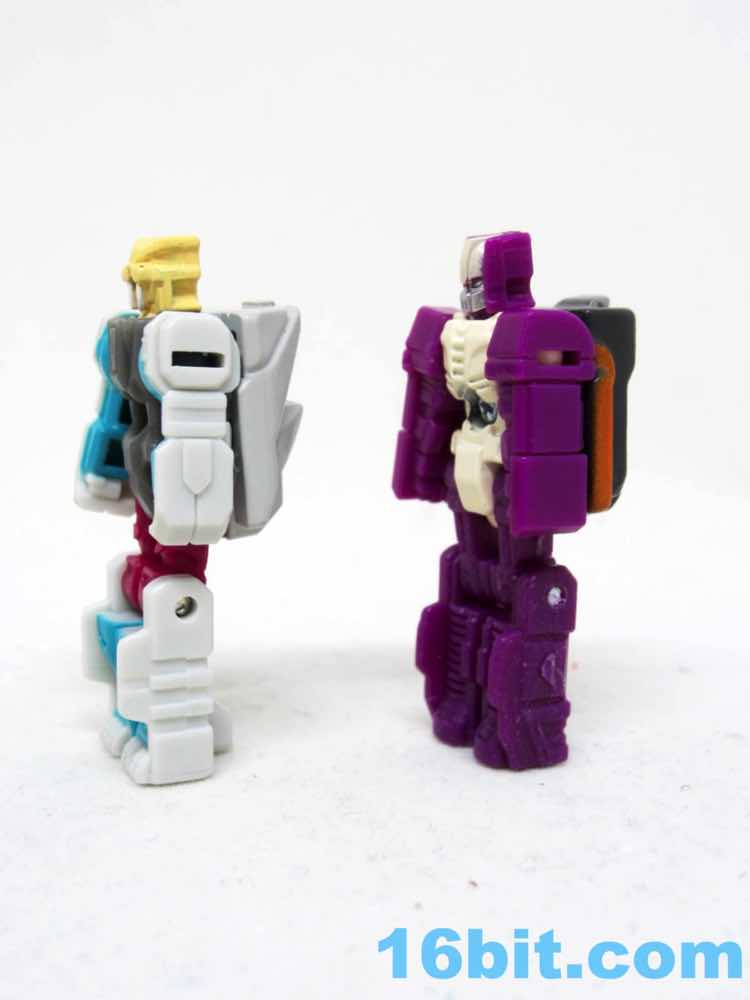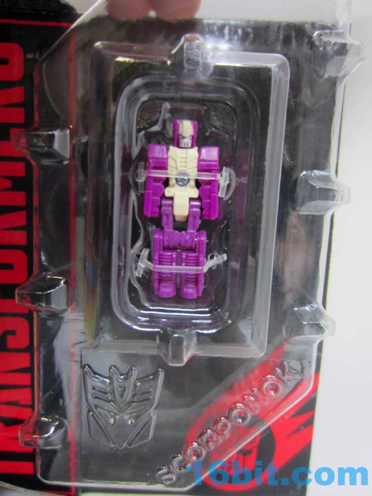 The first tiny head robot should look familiar, as it is 1.5-inches tall and has 5 joints. The face has red eyes and some blue stripes, with a white painted body and limbs molded in white plastic. The figure's backpack is a Scorponok head, and it looks fine. It's heavy, and looks pretty sharp on top of Hardhead. It will make you angry we don't have a giant transforming Scorponok in the modern line yet, but at least they remember it exists.