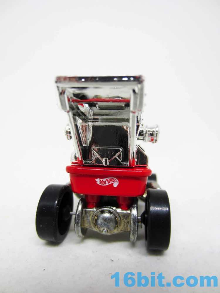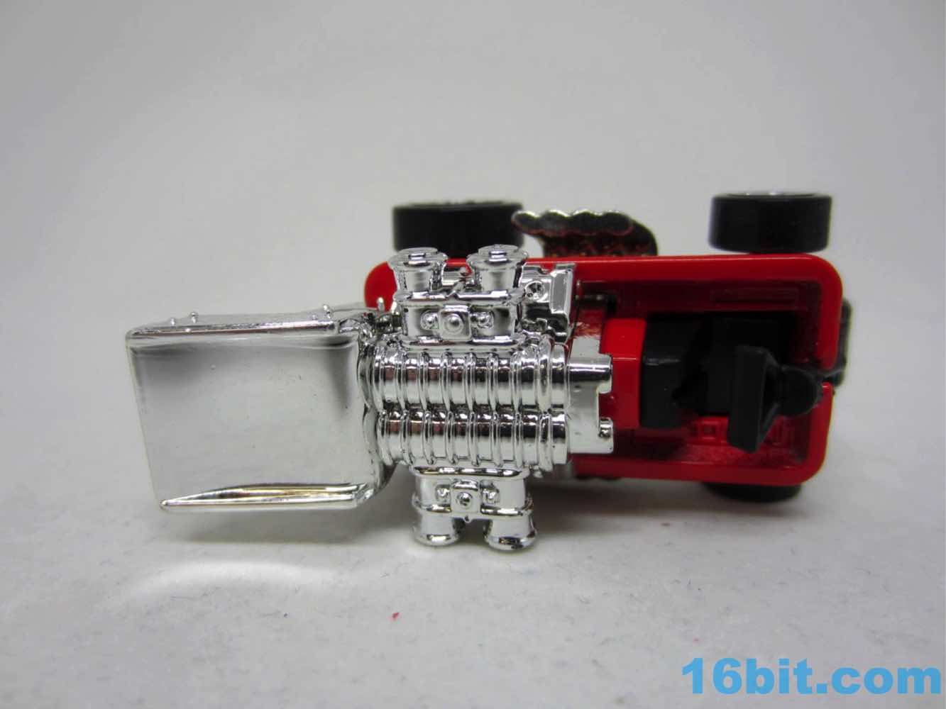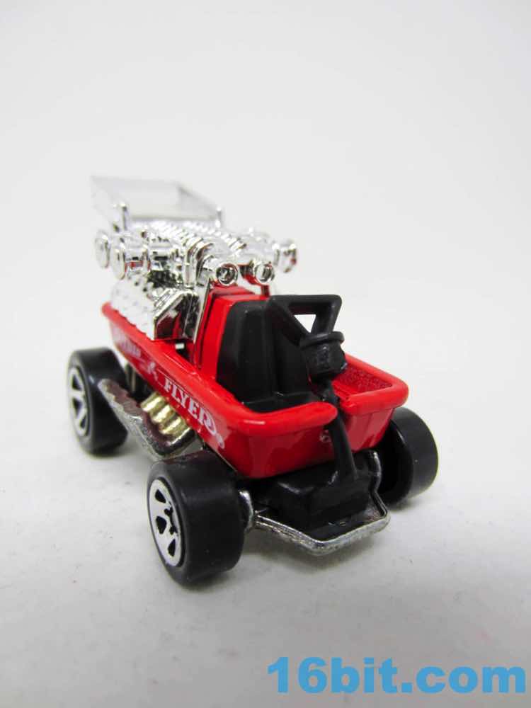 The metal red wagon has some really great paint. The red is easy to do well, but the crisp Radio Flyer lettering and a stunningly sharp Hot Wheels logo on the back are great for any 1990s toy. The car is largely molded in color, minus the silver chrome wing on the back and novelty engine and the wheels. It's not intensive, there aren't multiple fades or fancy gradients, it's just a simple design that adds hot rodding to a classic child's drag-along. Ed "Big Daddy" Roth would be proud.