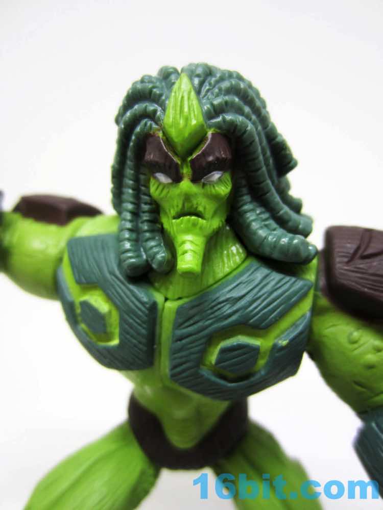 New characters in toys for boys are scarce, since American kids graduate to consumer electronics at a pretty young age. We don't get much new here, and it seems new generations for nostalgia may be in short supply here - but there are several different figures of the noseless, Groot-esque Lucas. He has long hair that looks vaguely like leaves or branches, armor that resembles bark, and hulking muscles. This green giant isn't so jolly, but with one fist and a giant outstretched paw he looks like he could crush some skulls. The blank white eyes and big eyebrows sit over a long green beard chin, giving an almost alien appearance to this muscular mutant man.