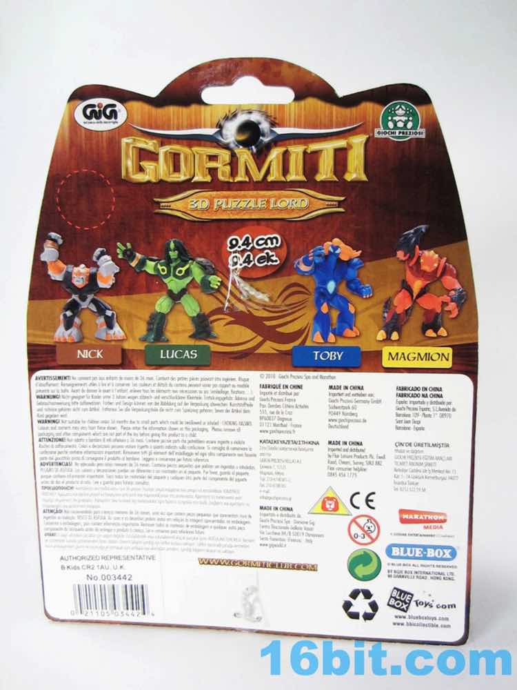 I bought a bunch of Gormiti on clearance a few years ago, and my pal Seth sent me a 3D Puzzle Lord Lucas in the mail - it's pretty neat! The line evaporated quickly in the USA, but these characters and miniature trading figures do good business in (and for) Europe. The packaging is unusual - a two-piece unpainted hollow head is twist-tied to a cardboard backer, and taped shut. The figure inside is about 3 3/4-inches tall and comes to you in pieces - you have to assemble it in the right order to create an elemental warrior named Lucas. His pals are Nick, Toby, and Magmion - the latter of which I assume is the weird foreign kid? I don't know why one of these names is not like the other.