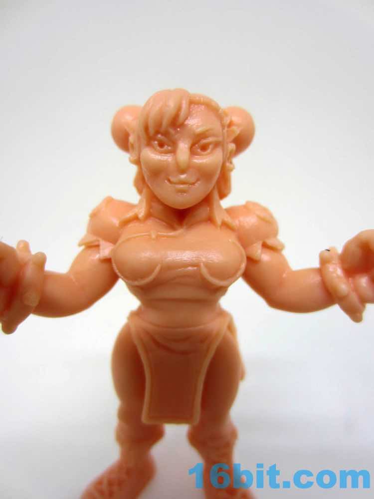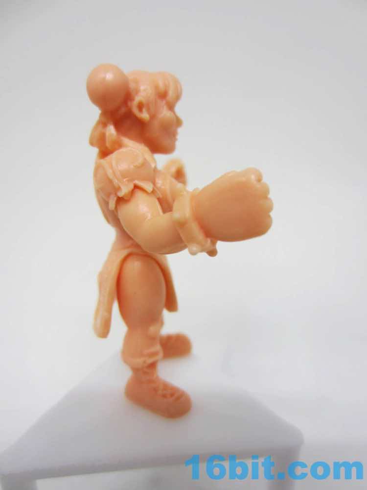 Next up is Chun-Li, complete in China dress. Unlike other women in the neo-M.U.S.C.L.E. line, she's bulked up and posed like most of the men with arms spread out and fists clenched. And spiked bracelets. And the hair things. And high cheekbones, and earrings. Just like in the games, she has massive thighs and laced-up boots. The dress looks almost exactly like the game, complete with the sculpted detail and patterns. She's a sturdy figure that stands ready to brawl, but the poses of this figure line don't lend themselves to her signature moves or poses. She can still deck the other figures with her fists, though. Not that I've done that, or am doing it right now.