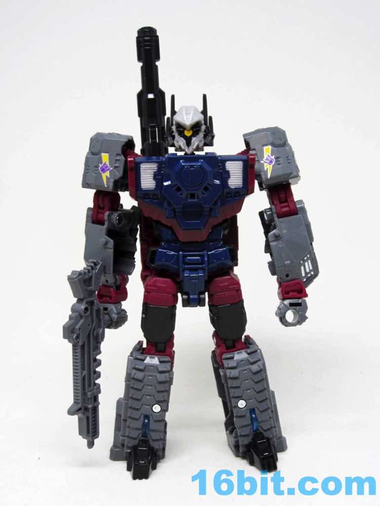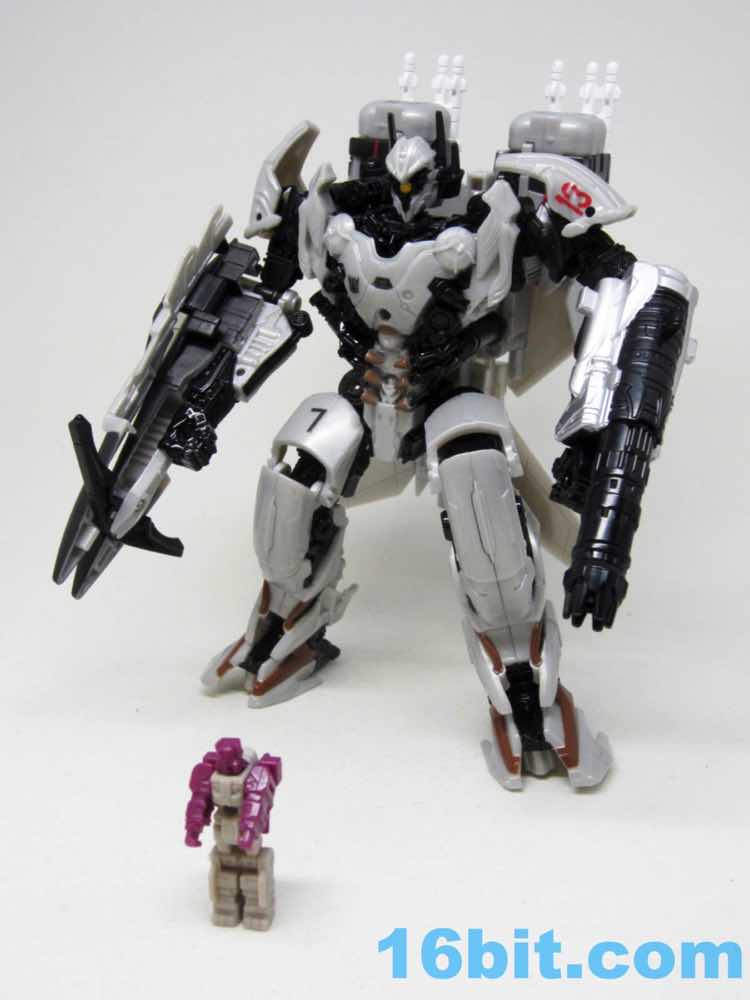 Articulation of this 7 1/2-inch robot is pretty good. The left shoulder doesn't lock particularly well, which is a shame because a telescoping gatling gun requires some degree of pressure and you're going to shift it loose. The right arm has a fold-out crossbow of sorts. The figure's build has more movement than I would expect, and generally looks great with lots of grey and some silver paint. The robot has a lot of personality, but the face, not so much.