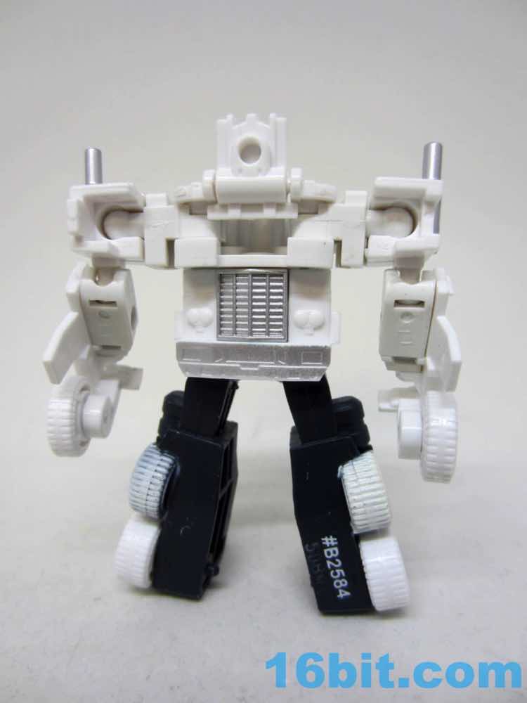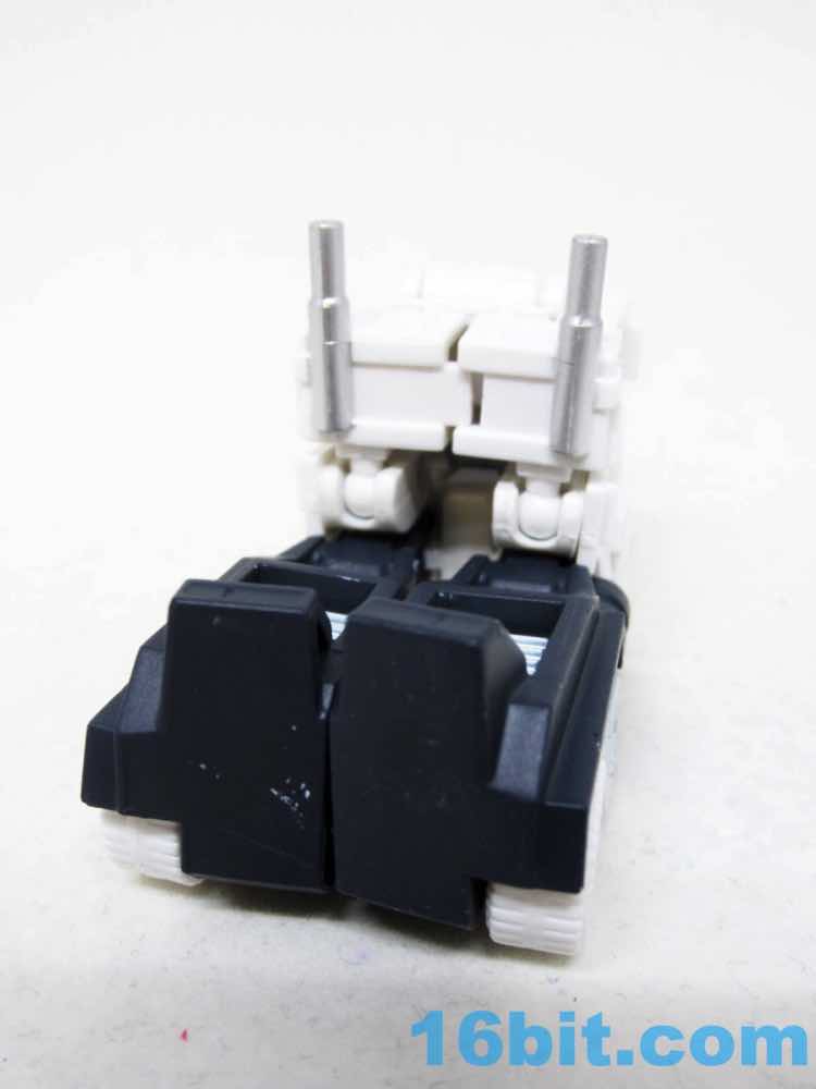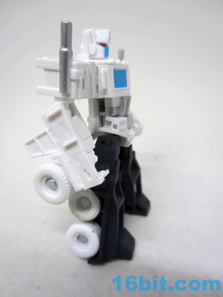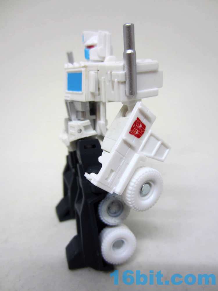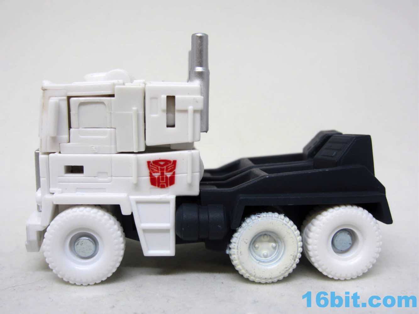 The truck is good, minus the fit issues - the white body is nice, I like the dark grey legs, and the blue windows are pretty nice. Silver grilles make it even better, and while the wheels are all white, well, things aren't always perfect. It's still striking and the toy likely needs the contrast anyway. You can see an Autobot brand behind the driver's side door.