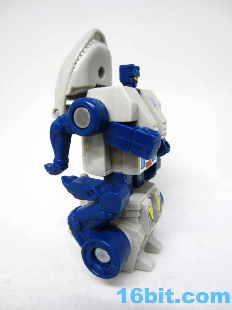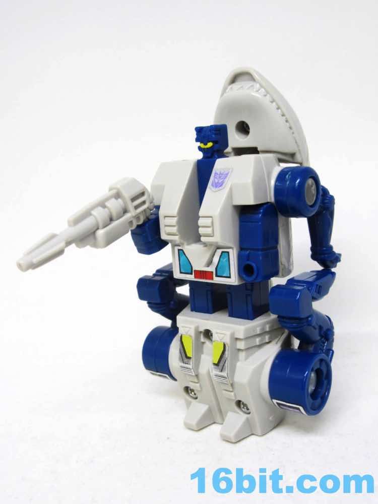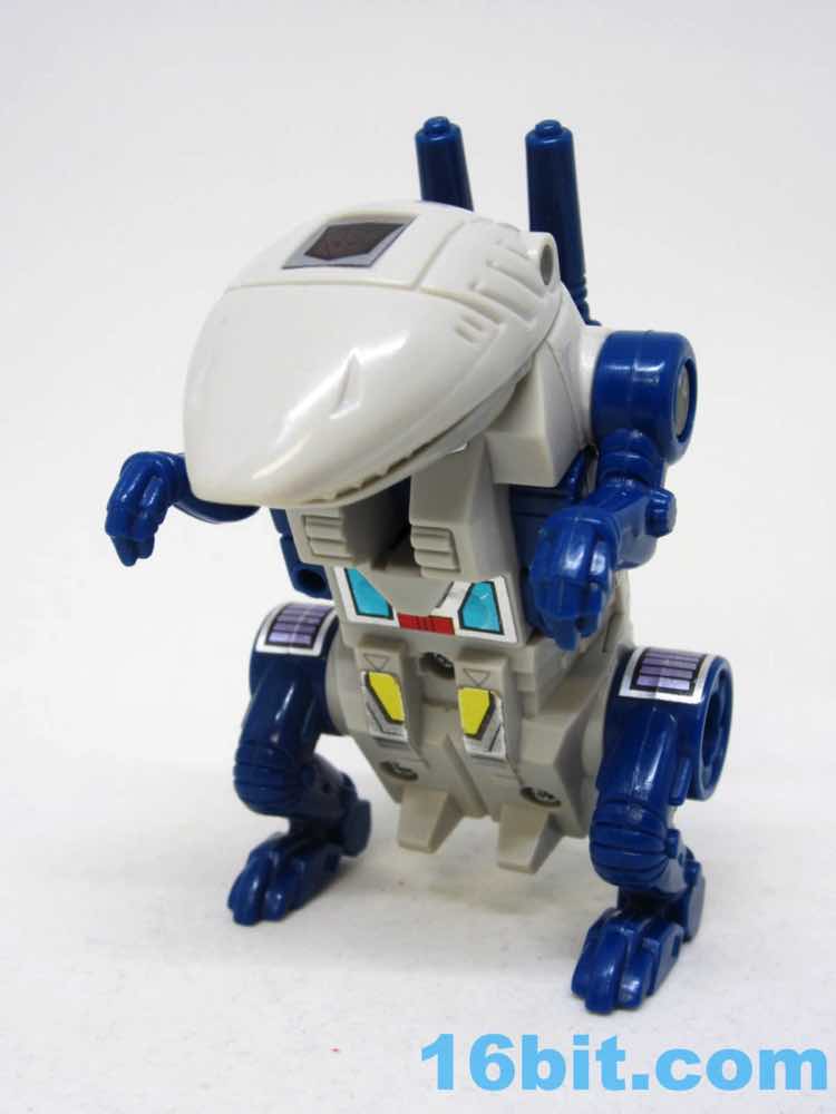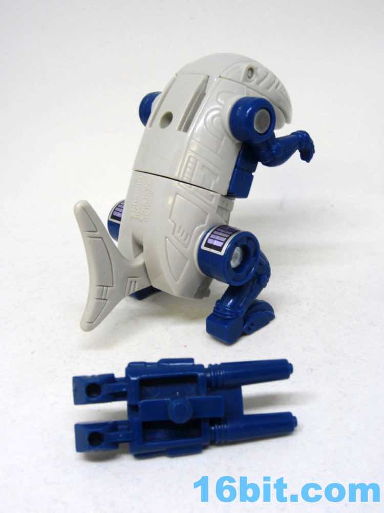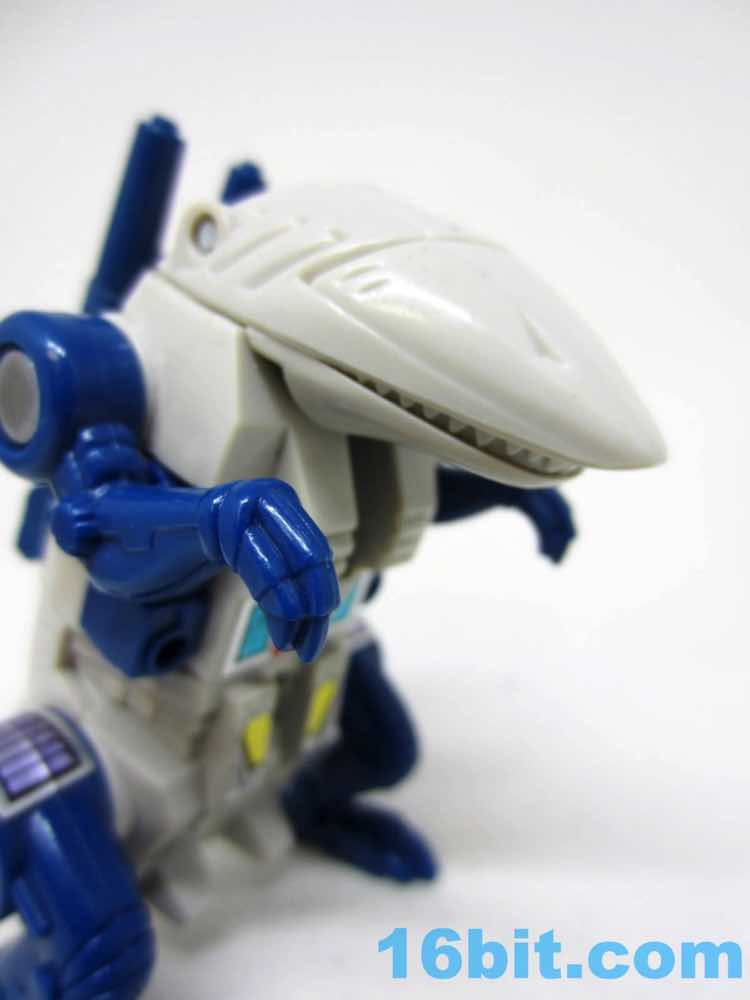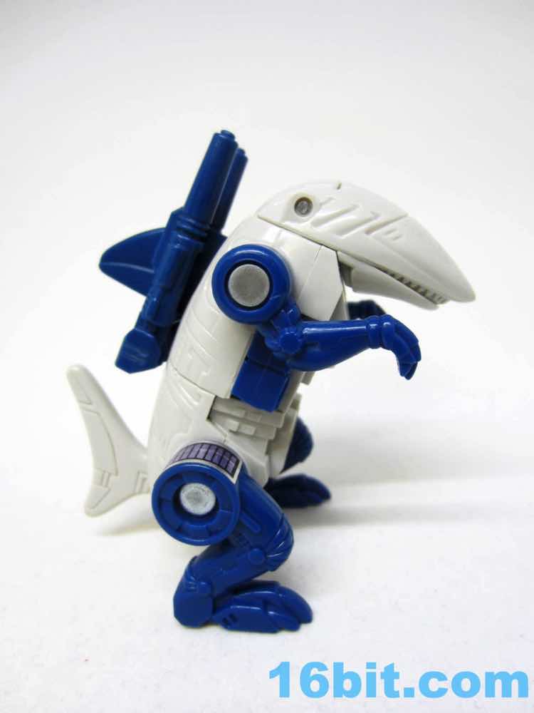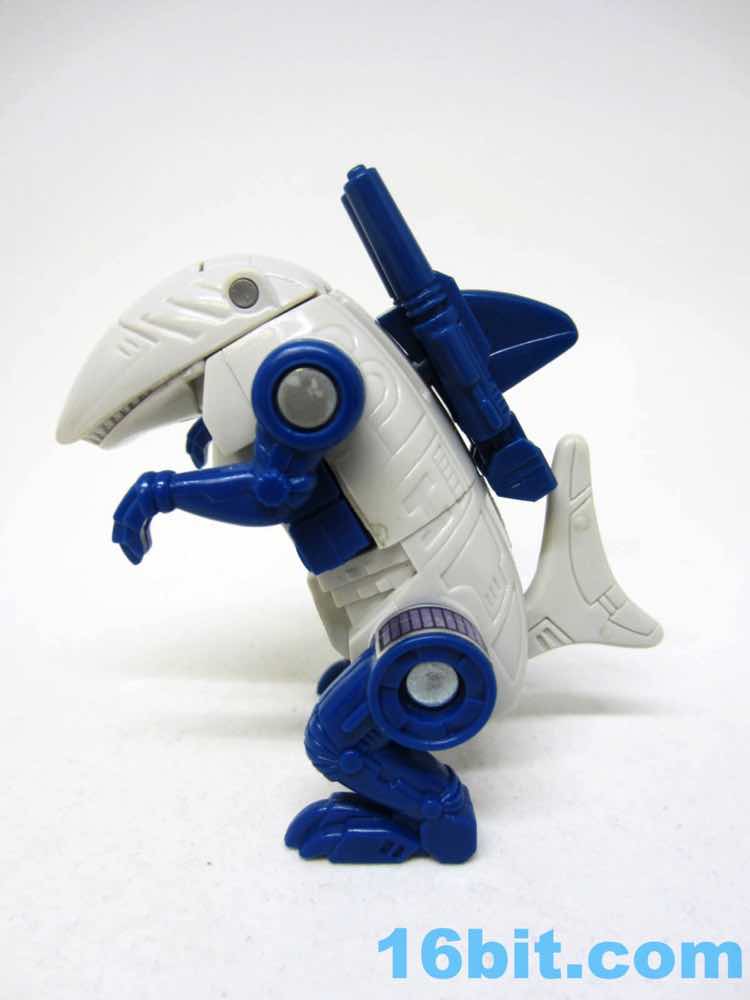 The creature is the key feature, with a landshark toy featuring swiveling arms and legs. The jaws don't open, but the lips are parted slightly showing big, sharp teeth inside. Sculpted robot eyes and gills compliment the tail giving him a fishy personality despite his limbs. It's a sturdy figure, with a gun that serves as his dorsal fin and main weapon the gun has no on-board storage in creature mode. It's a pretty simple sculpt, but there are some of Takara's signature robot bits and generally sturdy build.