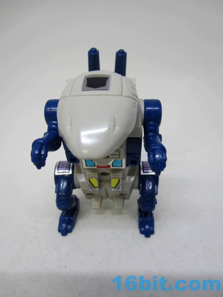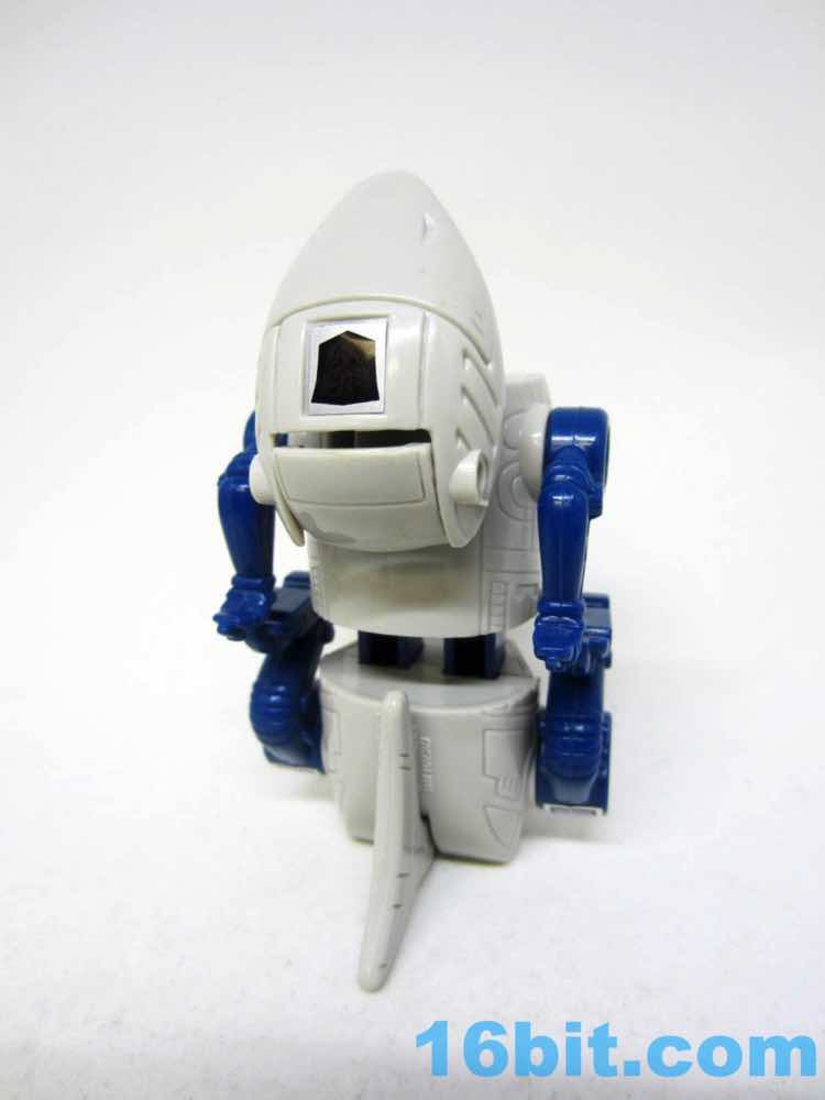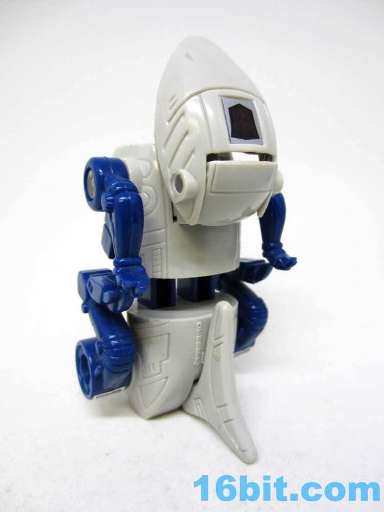 To transform him, you fold the small arms and legs forward, push in the robot legs, and bring up the creature head. Plug in the fin, and you're done! It's really easy - and you can see how the robot head becomes a combiner connecter, and that there's a 5mm hole in the bottom for a fist or a foot. It's a stumpy little limb, but that was the nature of the combiners of the late 1980s.
