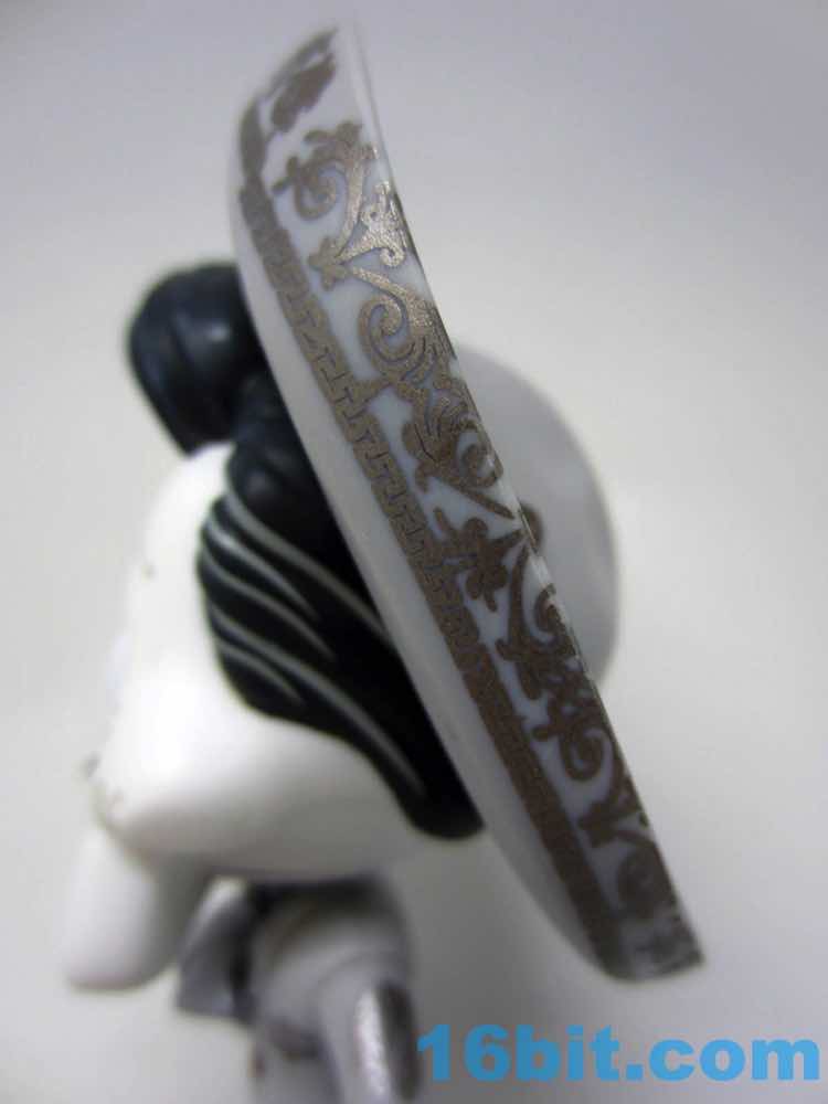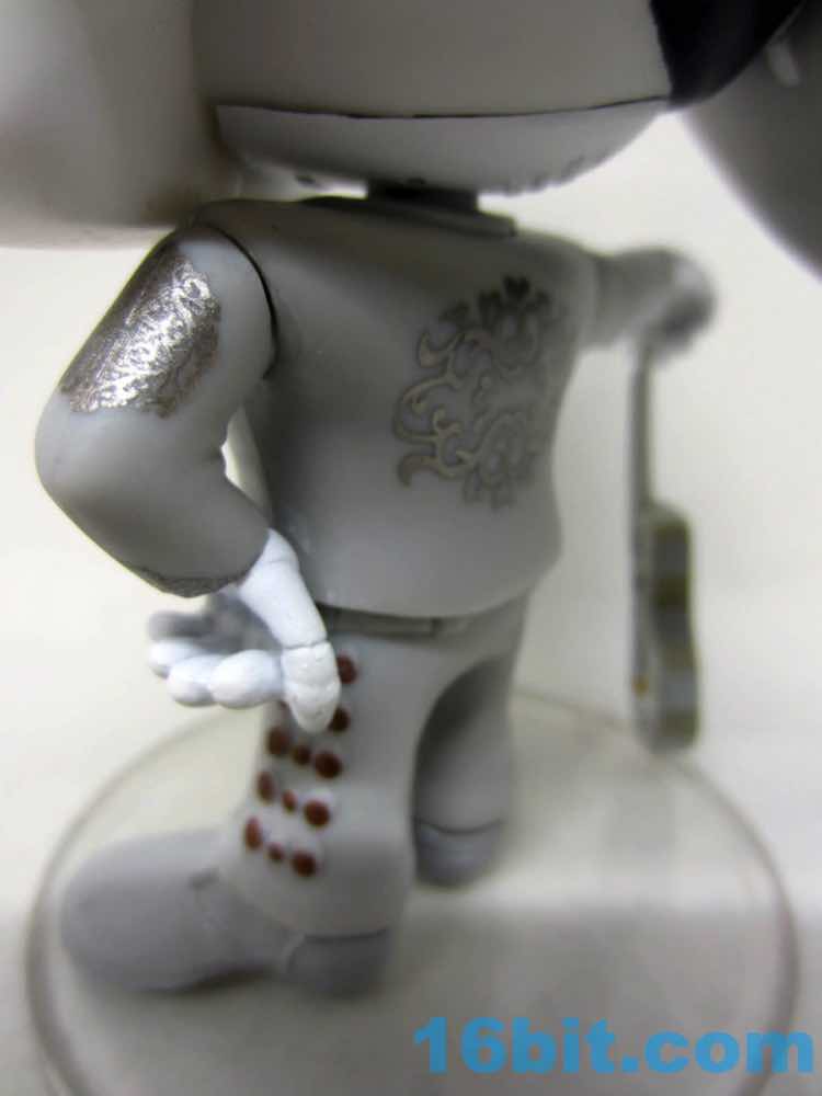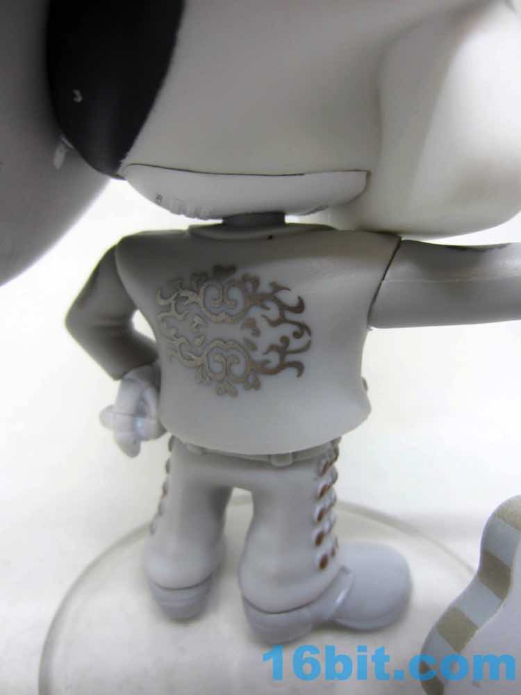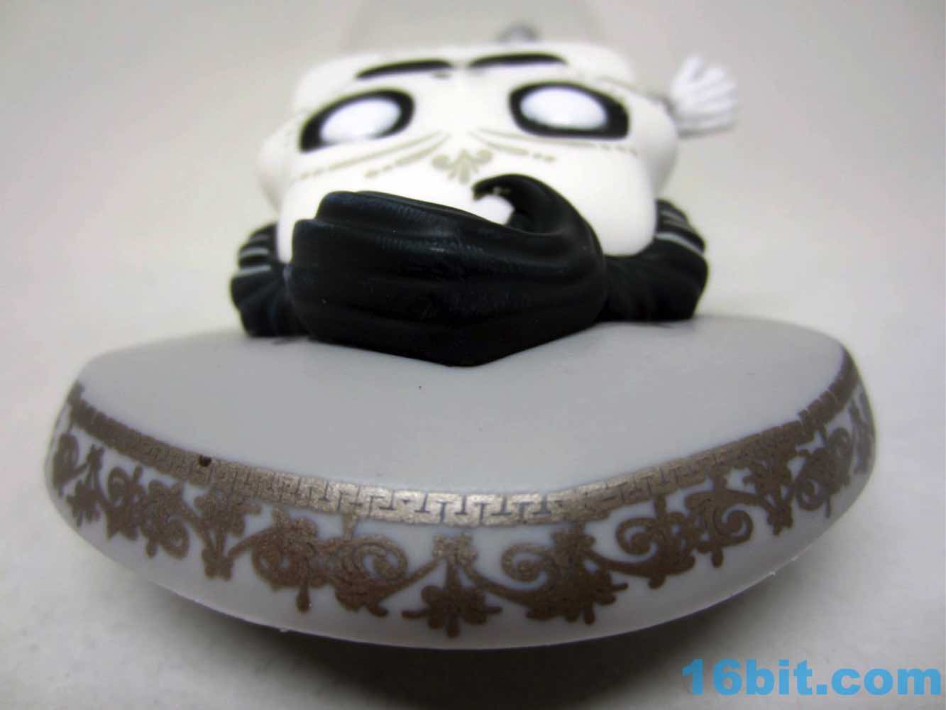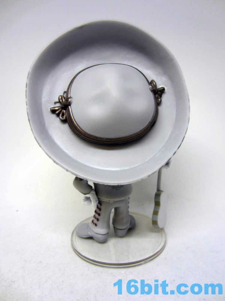 The actual narrative reason for diverging from the normal head design makes for an interesting designer figure, but it retains the glossy eyes - in this case, white eyes - set inside a black void in the skull. The head is a different shade of white, with grey designs all over. The hat also has an amazingly intricate faux-stitching on the brim, plus tassles around the hat. He has a bow tie, a swell suit, glossy grey shoes, and one of the better overall paint jobs on an animated Funko figure. This isn't a colorful release, but you can see a lot of work went into it and little things like white streaks in the hair show that Funko is not content to cheap out. Or Disney-Pixar has strong licensor approvals. Take your pick - either way, it's a pretty fancy figure for ten bucks.