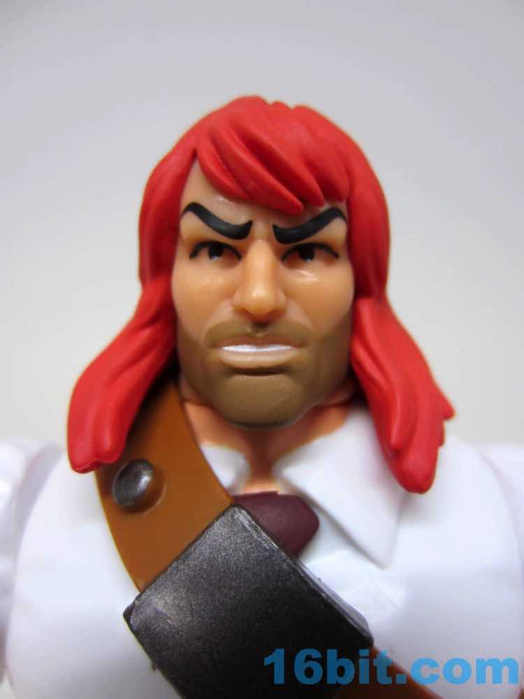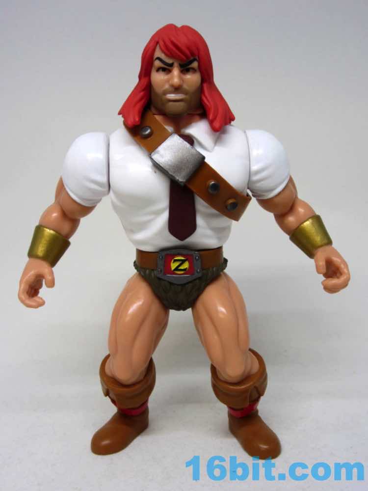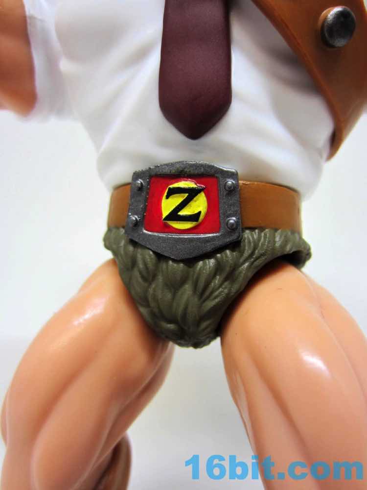 Deco as it should be. The head is pure 1980s simplicity with black dots for eyes, white teeth, and some of the best scruff I've seen on an action figure as of late. The white shirt is molded white on the torso and painted for the sleeves, creating a slight textural mismatch like we saw on a lot of the older toys. Gold bracelets look good, as do the boots. A colorful "Z" on his sword and on his fuzzy briefs match nicely, giving the figure more color than his inspiration. It's hard to not like - factor in a corny tie, and it's pretty ideal as a cool plaything.