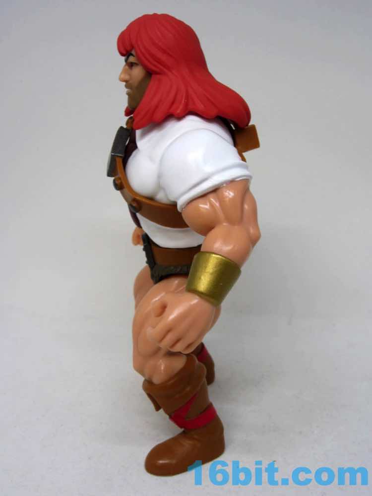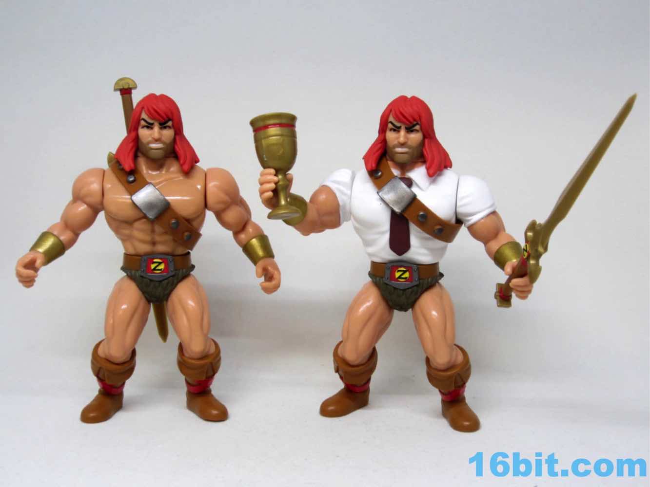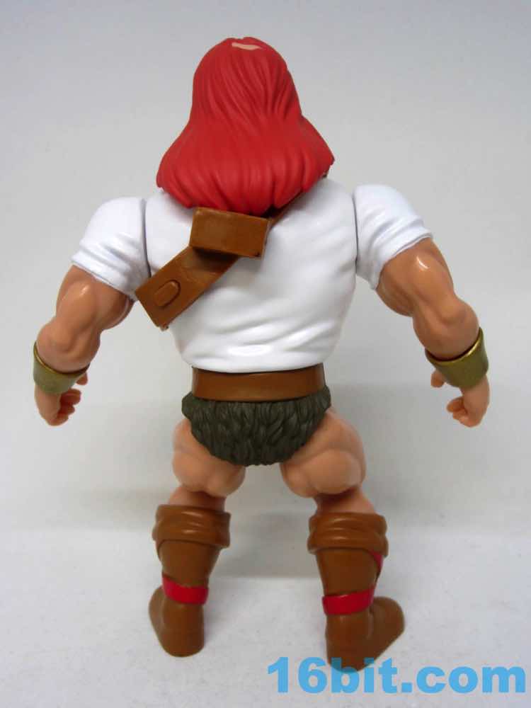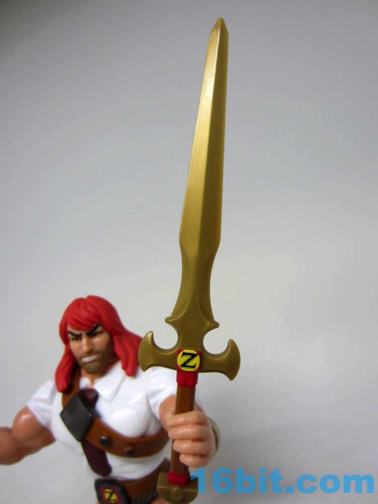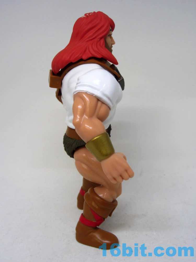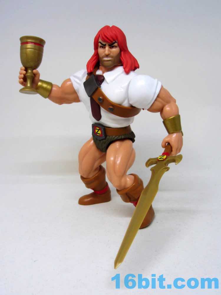 Standing almost 6-inches high, this chunky figure stands well and looks a lot like a 1980s Remco or Masters of the Universe figures. The head is hard plastic, and the long red hair features a bald spot. His sword is long and pointy, not flexible or rounded off for children. It can't be stored on his back thanks to the positioning of the shirt and hair, unlike the regular Zorn [FOTD #1,620] where it fits like a more or less decent glove. His hands can hold the accessories nicely, and he stands.