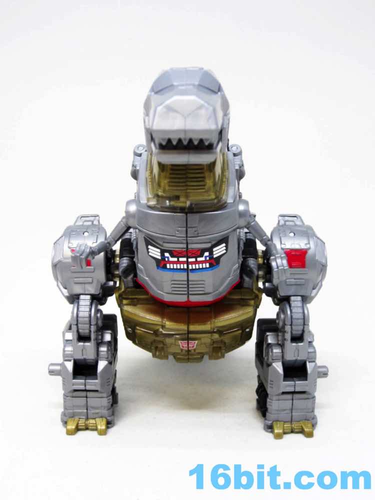 The robot mode is pretty good, considering the limitations imposed by his function. He has to be a torso, and a dinosaur, and a freestanding robot - so the fact that he looks a lot like G1 Grimlock with a bigger chest is pretty amazing. The torso splits so he can transform, and it's a little ugly. With double-jointed elbows and more than a little kibble, it's a definite improvement over the original robot in terms of mobility and size. I love the toy-like head, and the Popeye-esuqe arms are a nice touch. I'm not crazy about Hasbro's newfound love of foil stickers on Leaders and Voyagers, mostly because the quality is poor and they peel before you even open the box in some cases - and I don't know what kind of adhesive to use to reglue them. Deco is good, the clear plastic torso with gold paint underneath is pretty - and probably pretty fragile over the long run. We shall see.