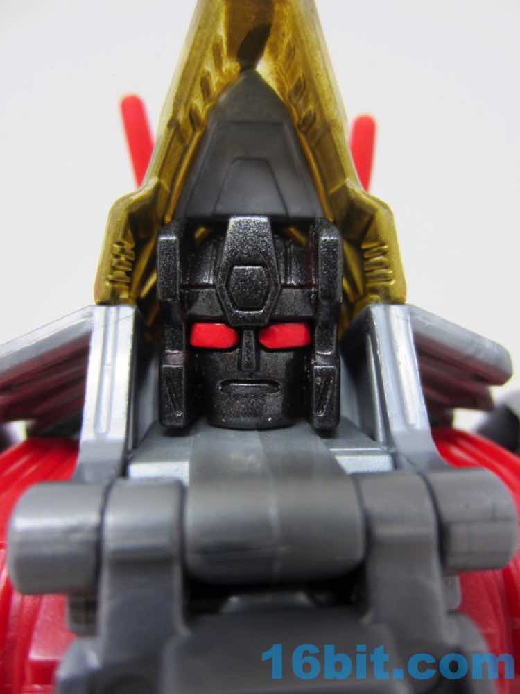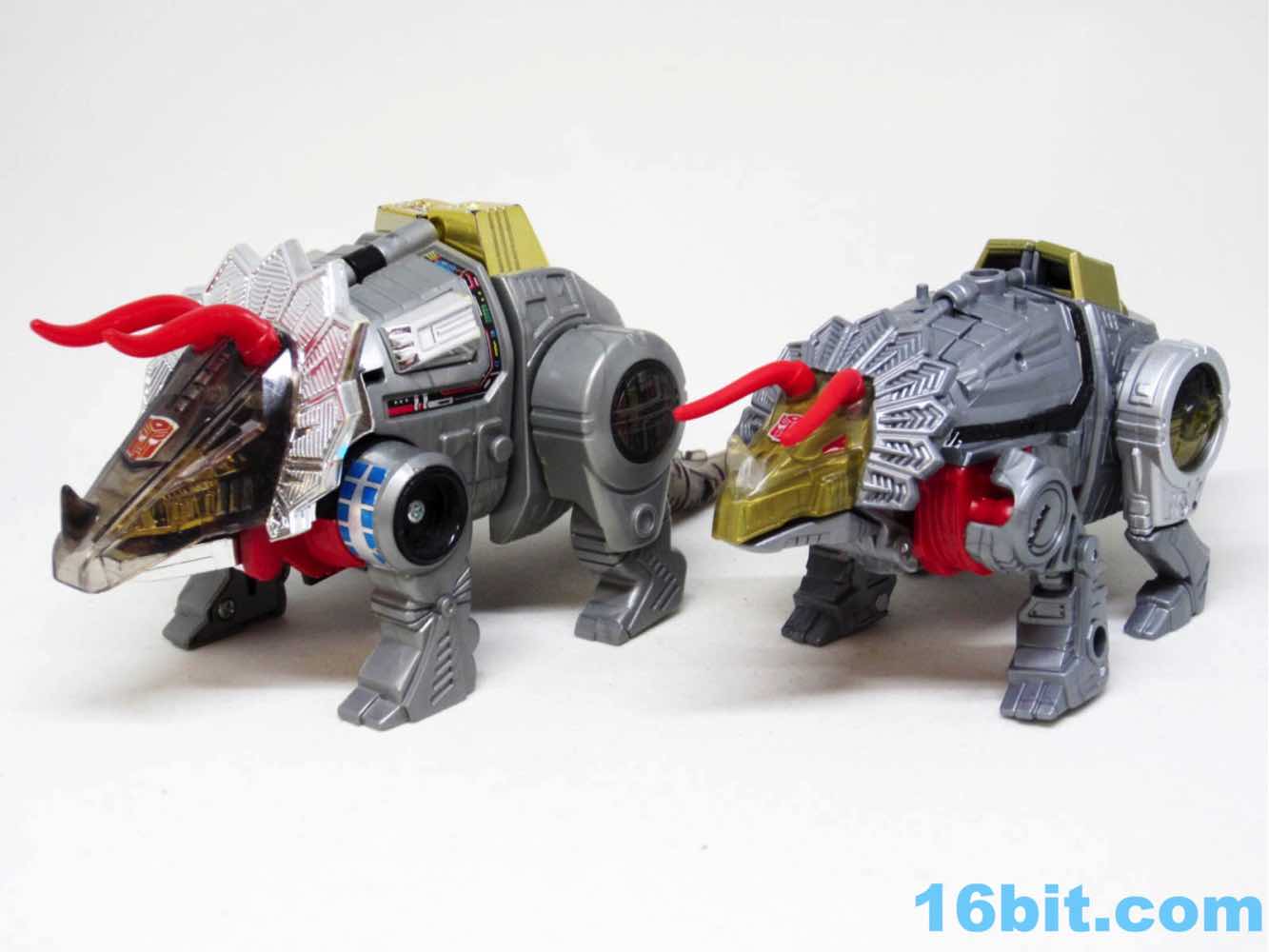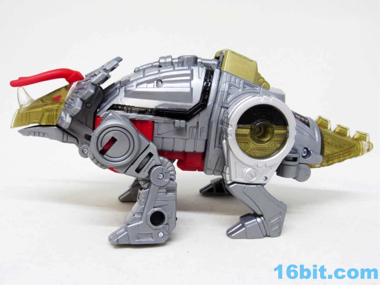 The triceratops is cute, built around the same basic form factor as the Combiner Wars toys - there's a tab in the body that flips out, and the back half of the toy becomes robot legs, combiner shins, or combiner wrists. There's a lot of detail on this little guy, including faux-sticker tampos on the back and clear elements on the head, tail, and hips with gold paint to replicate the unusual vac-metal gold of the original. No effort was made to recreate the silver frill of the old toy, but Hasbro did add a couple of red eyes to the dinosaur head. I appreciate that.
