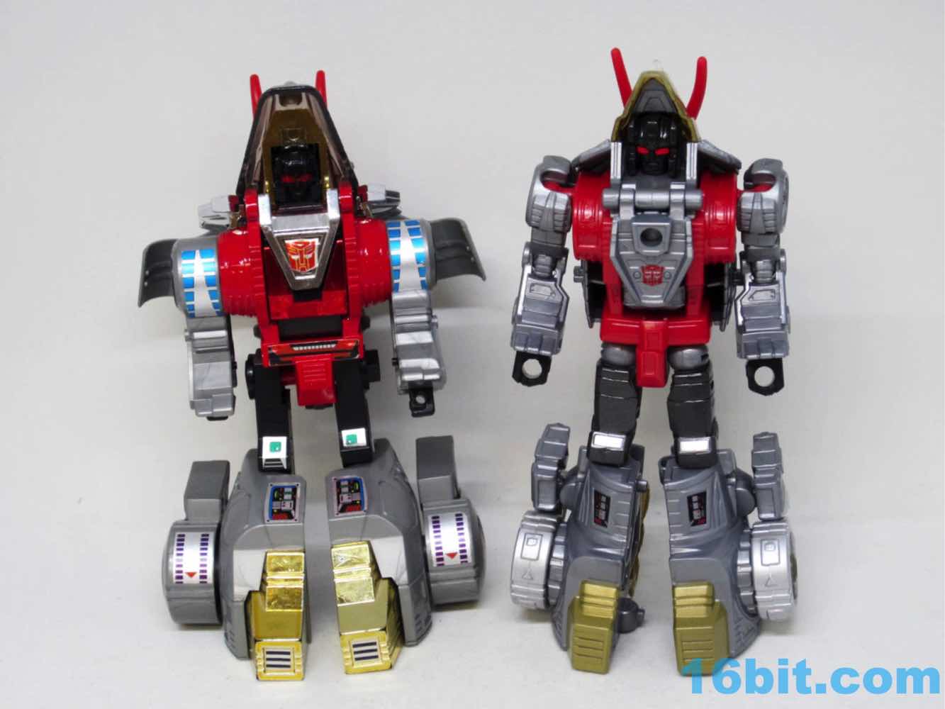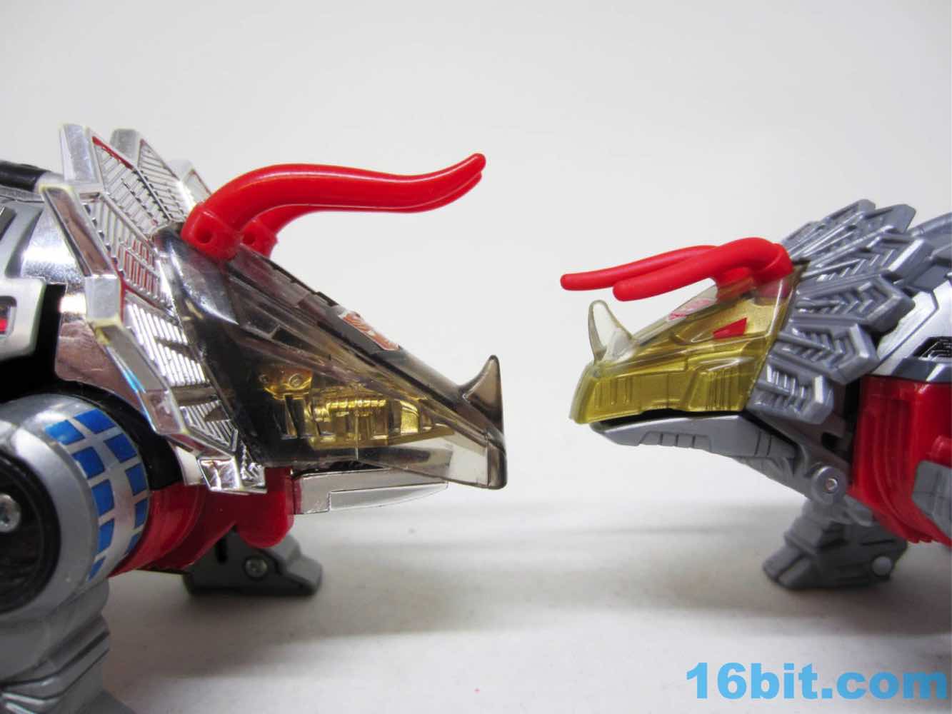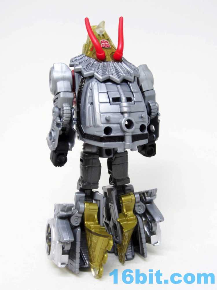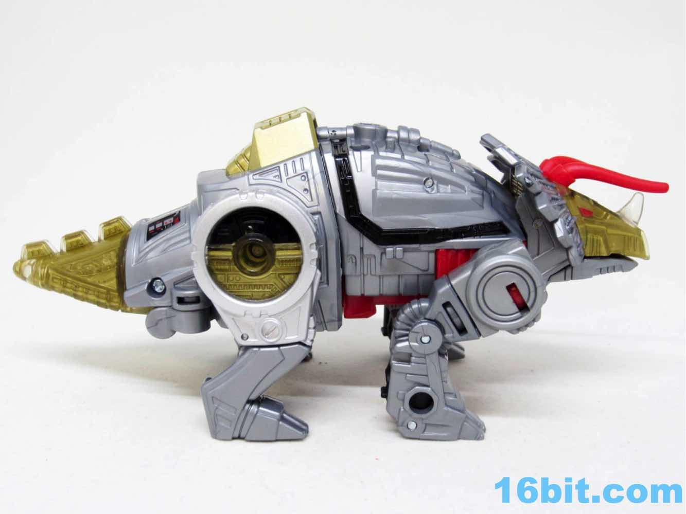 The triceratops is cute, built around the same basic form factor as the Combiner Wars toys - there's a tab in the body that flips out, and the back half of the toy becomes robot legs, combiner shins, or combiner wrists. There's a lot of detail on this little guy, including faux-sticker tampos on the back and clear elements on the head, tail, and hips with gold paint to replicate the unusual vac-metal gold of the original. No effort was made to recreate the silver frill of the old toy, but Hasbro did add a couple of red eyes to the dinosaur head. I appreciate that.