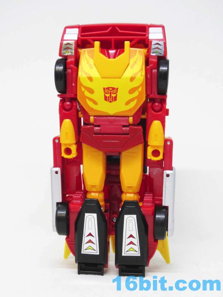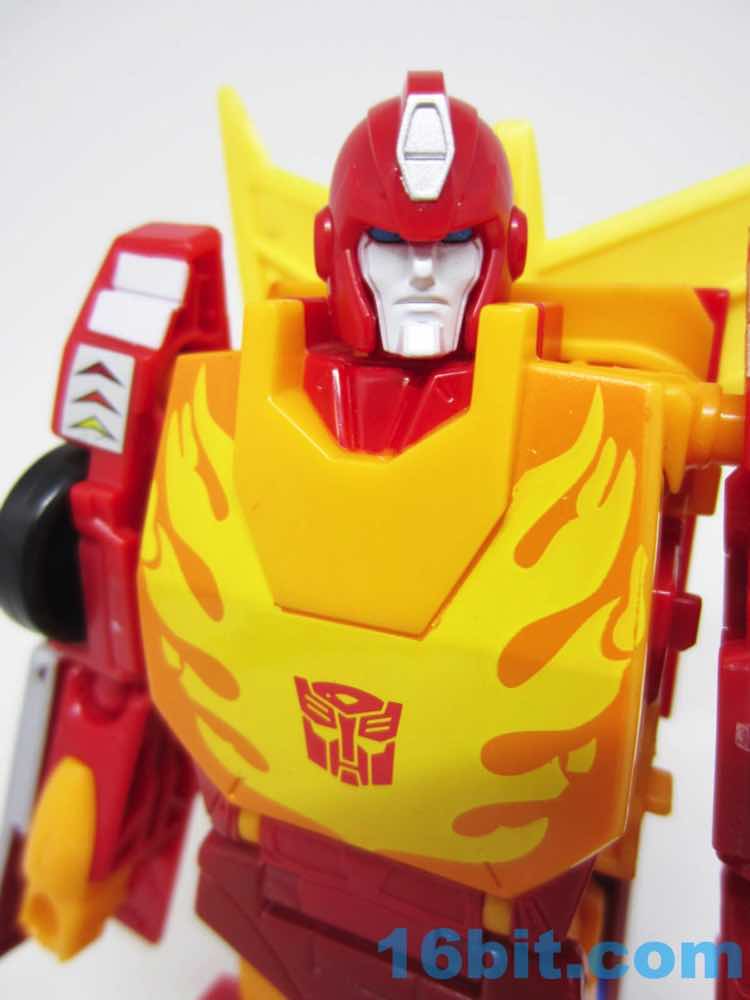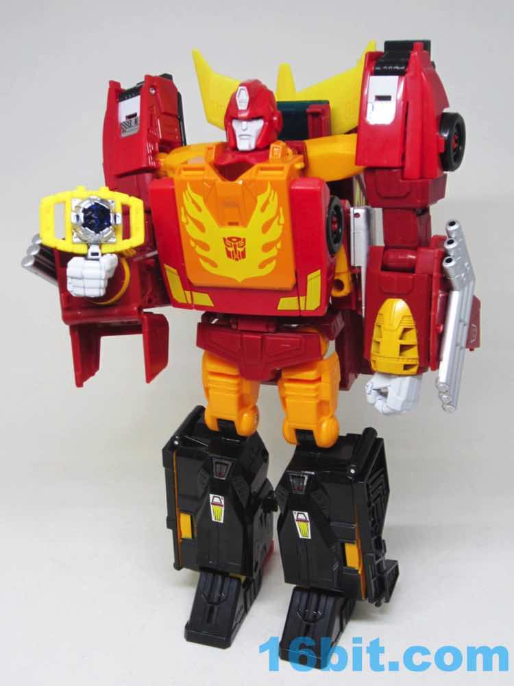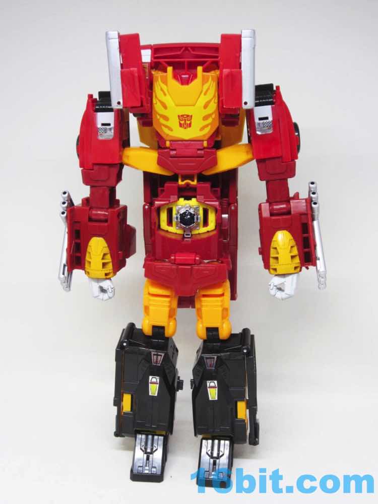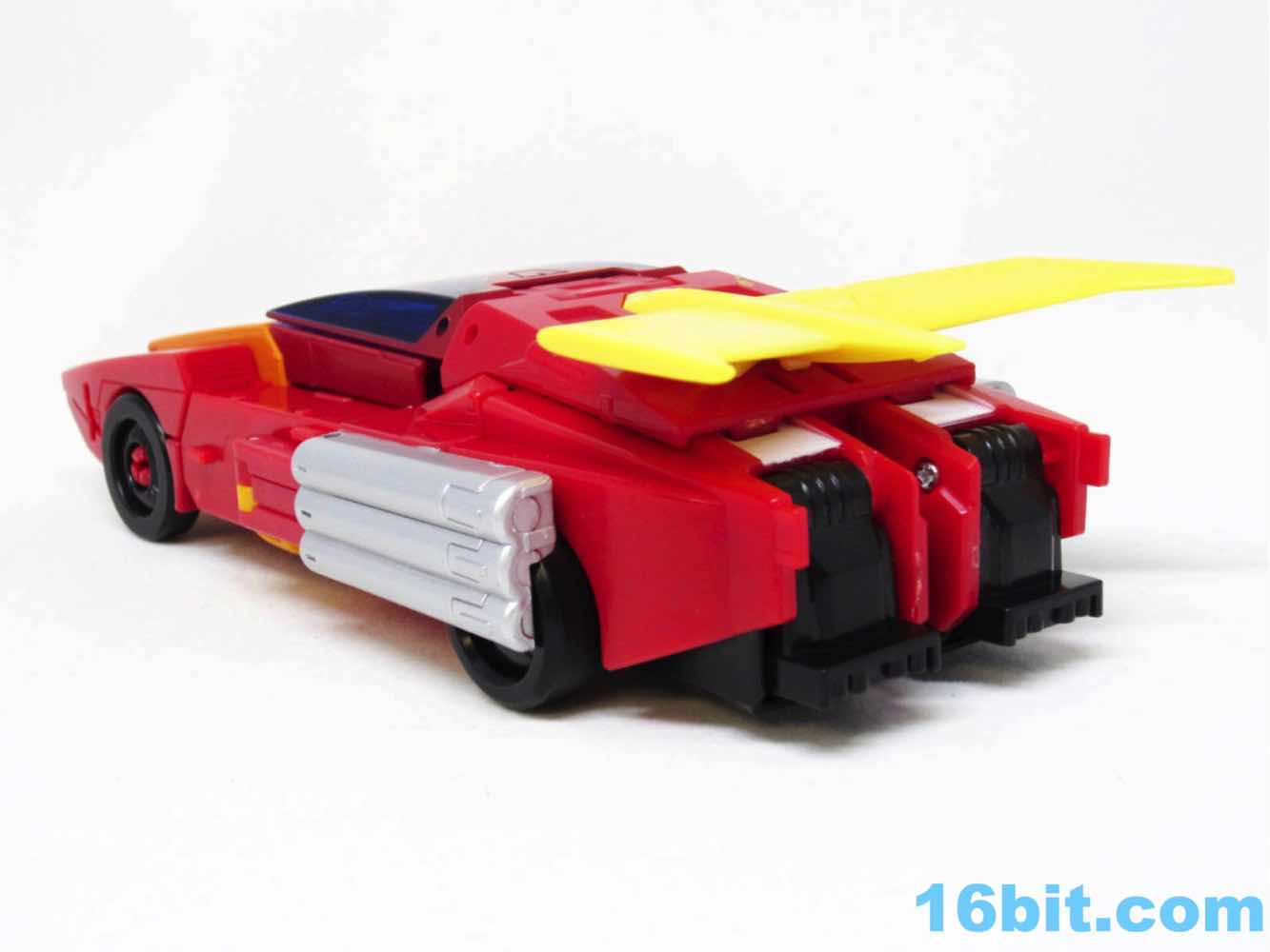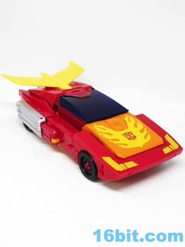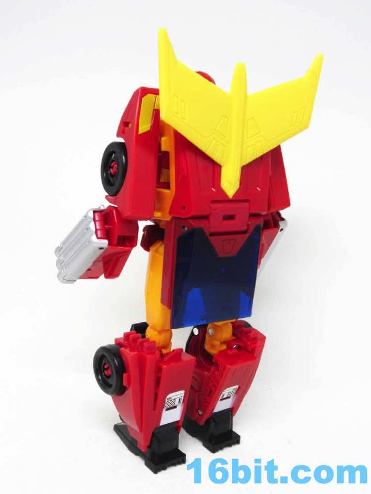 Hot Rod is back! This one has a decent robot mode with his "collar" on his shirt, the painted grey crest on his helmet, and the foil stickers on his shins. He feels like a Hot Rod toy with heavy Rodimus influences, like the lack of exposed engine and slightly more aged, lined face. Keeping the original Hot Rod toy's orange fists was a great decision, as was the double-jointed elbows. Why the orange forearms? I have no idea - but I do appreciate that the fists have a little extended shelf jutting out so he can hold the otherwise unholdable Matrix of Leadership accessory. I would loved to have seen a sticker or tampo "codpiece" replicating the original toys' stickers, but neither robot mode has such a thing.
