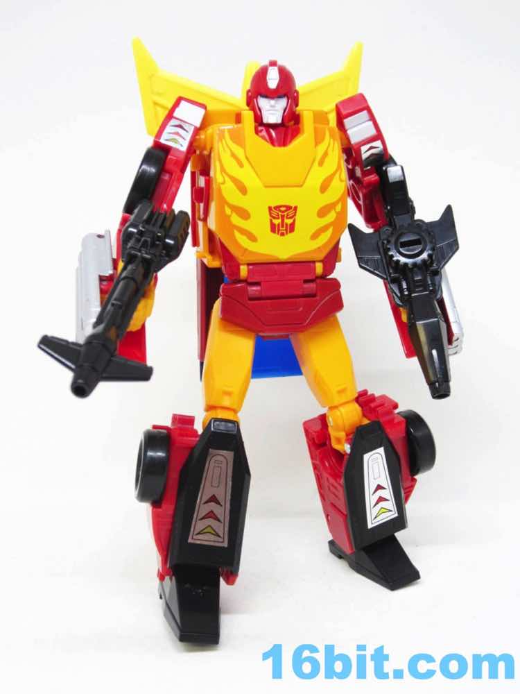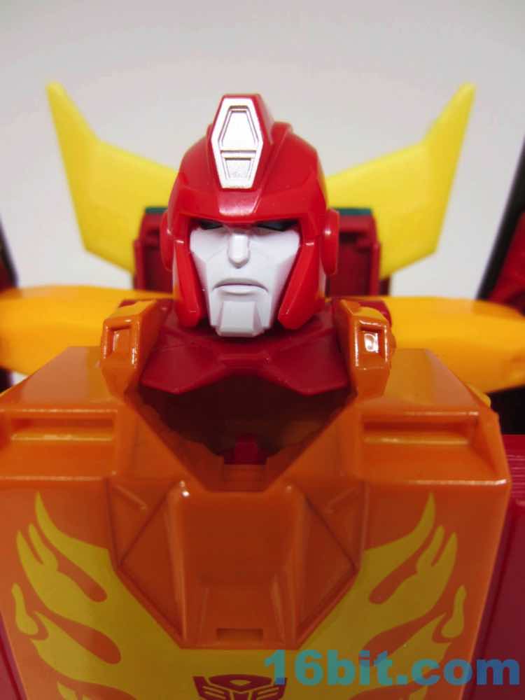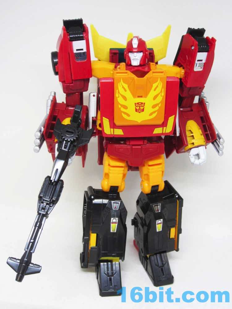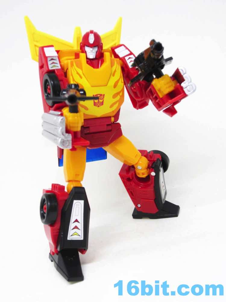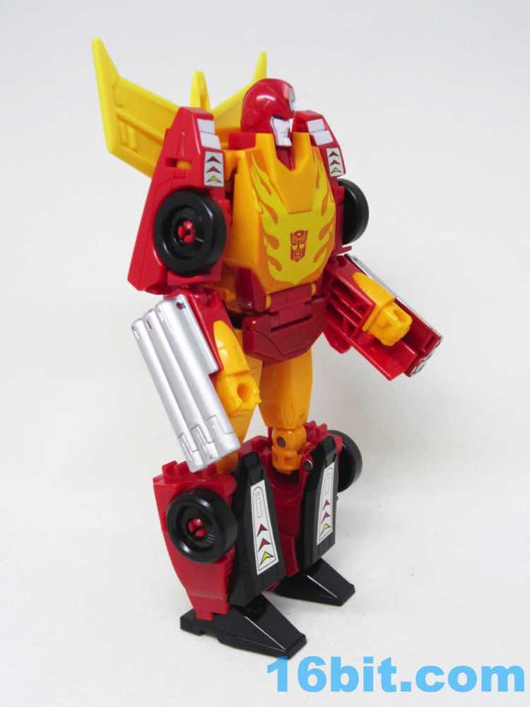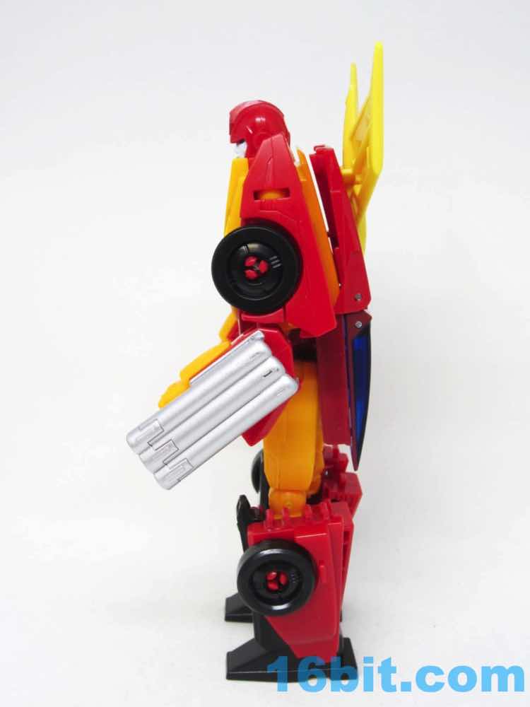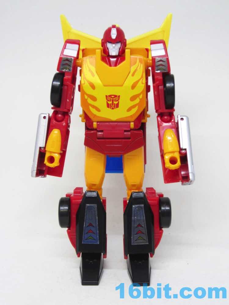 Hot Rod is back! This one has a decent robot mode with his "collar" on his shirt, the painted grey crest on his helmet, and the foil stickers on his shins. He feels like a Hot Rod toy with heavy Rodimus influences, like the lack of exposed engine and slightly more aged, lined face. Keeping the original Hot Rod toy's orange fists was a great decision, as was the double-jointed elbows. Why the orange forearms? I have no idea - but I do appreciate that the fists have a little extended shelf jutting out so he can hold the otherwise unholdable Matrix of Leadership accessory. I would loved to have seen a sticker or tampo "codpiece" replicating the original toys' stickers, but neither robot mode has such a thing.
